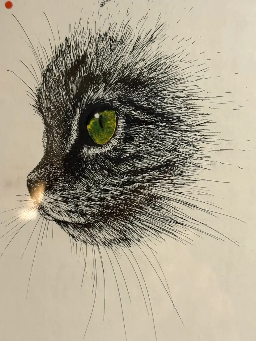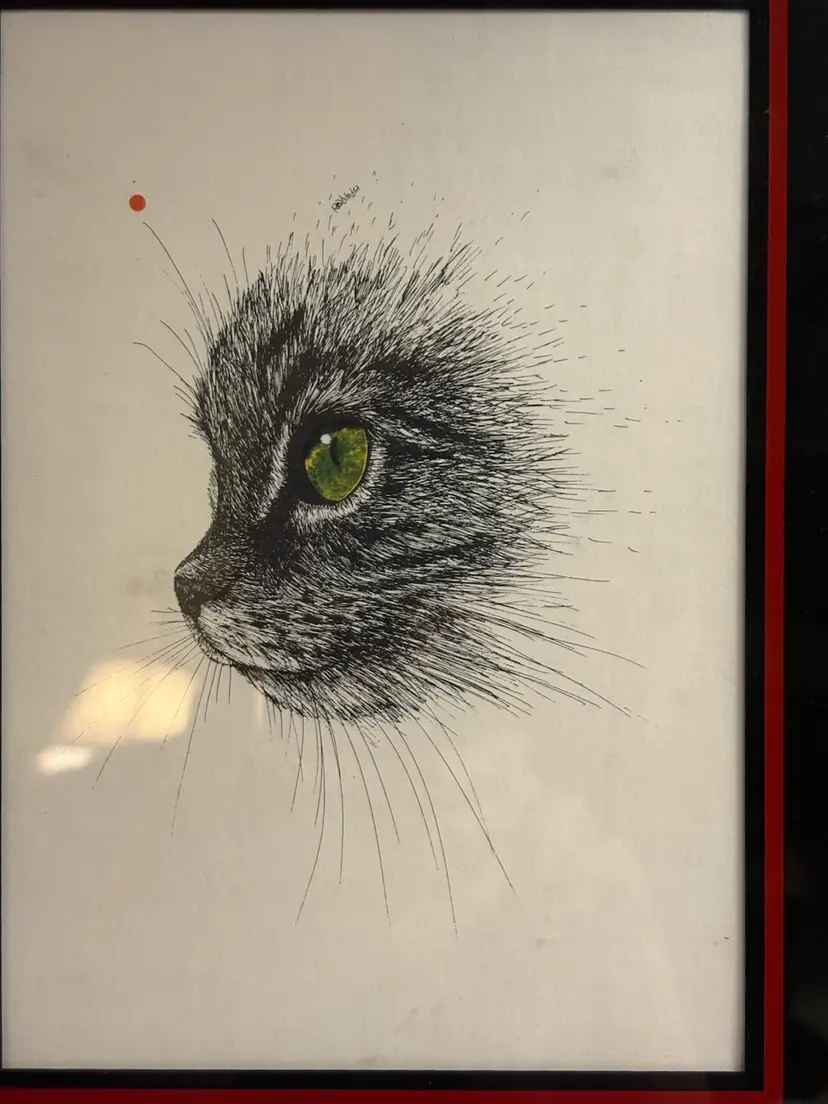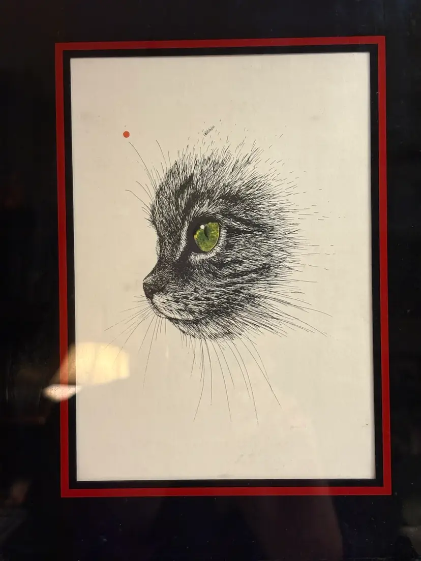 The "RABINDRA Print Of GREEN EYE'S CAT" is a framed artwork reproduction from the 1970-1989 period, showcasing a pop art style depiction of a cat with striking green eyes. This single piece print captures the essence of feline beauty and is perfect for any cat lover or art enthusiast looking to add a unique and vibrant piece to their collection. Ideal for those who appreciate the playful and quirky elements of pop art, this artwork is a charming addition to any living space.