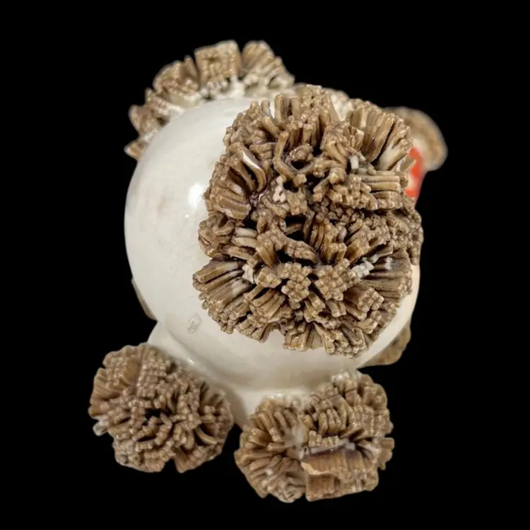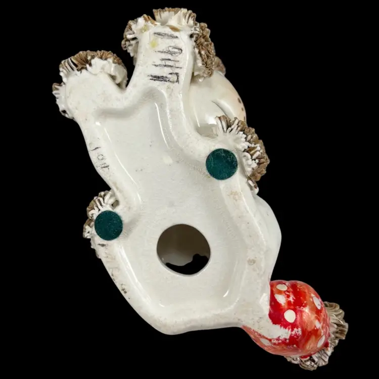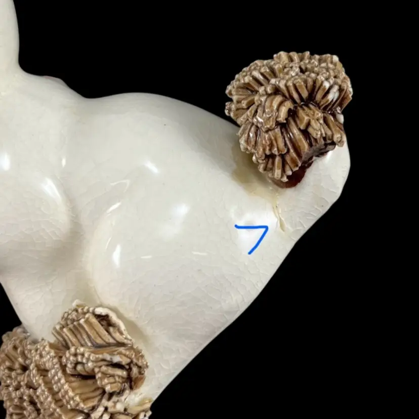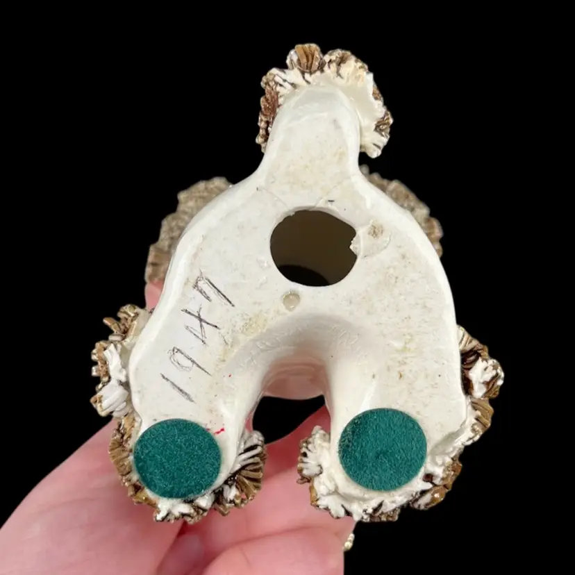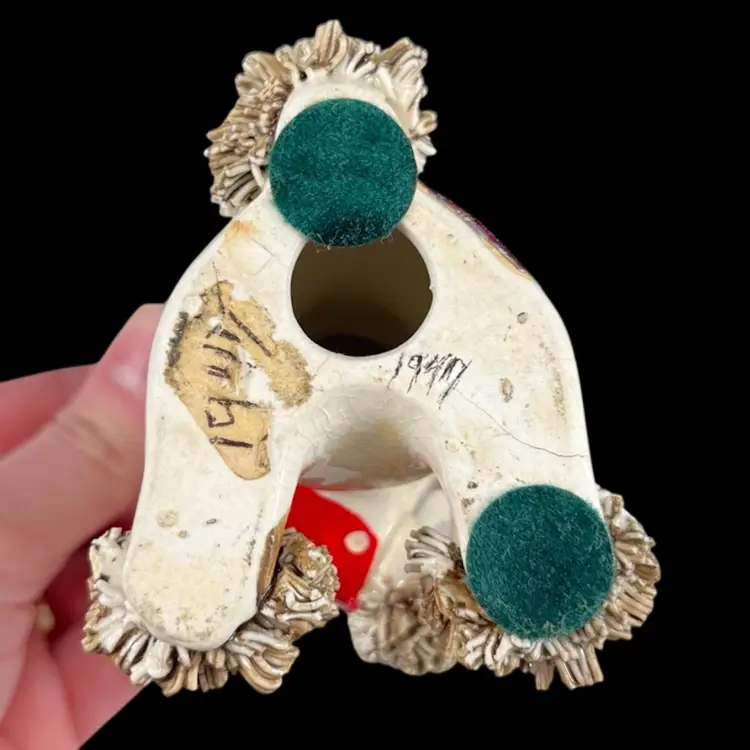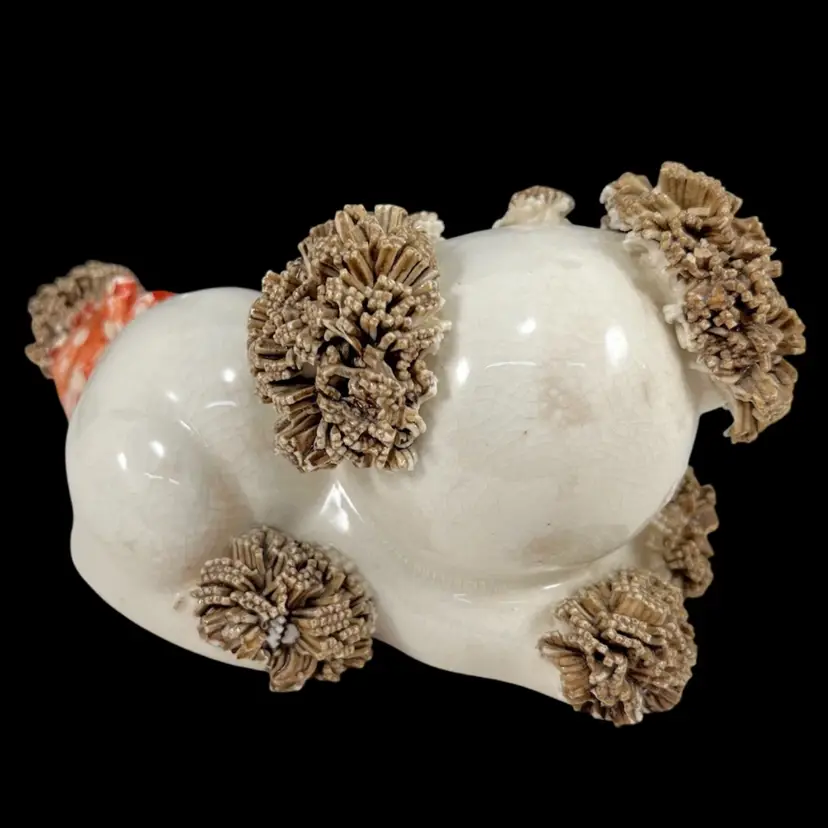 Sitting pup: approximately 4.5” x 3” x 3.5” Pup w/ front paws up: approximately 4.5” x 3” x 3” Laying pup: approximately 2.75” x 5” x 2.75” Please note that these pups are in AS-IS condition. There are many small chips to the spaghetti portions, too many for me to point out with arrows, so please look closely at the pictures. Please see the blue arrow on the sitting pup to see where there was a repair to it’s tail. Please see the blue arrow on the pup with it’s paws up to see where there was a repair to the back right leg. There is crazing and some discoloration throughout the pieces. There is some wear to the red cold-painted portions.