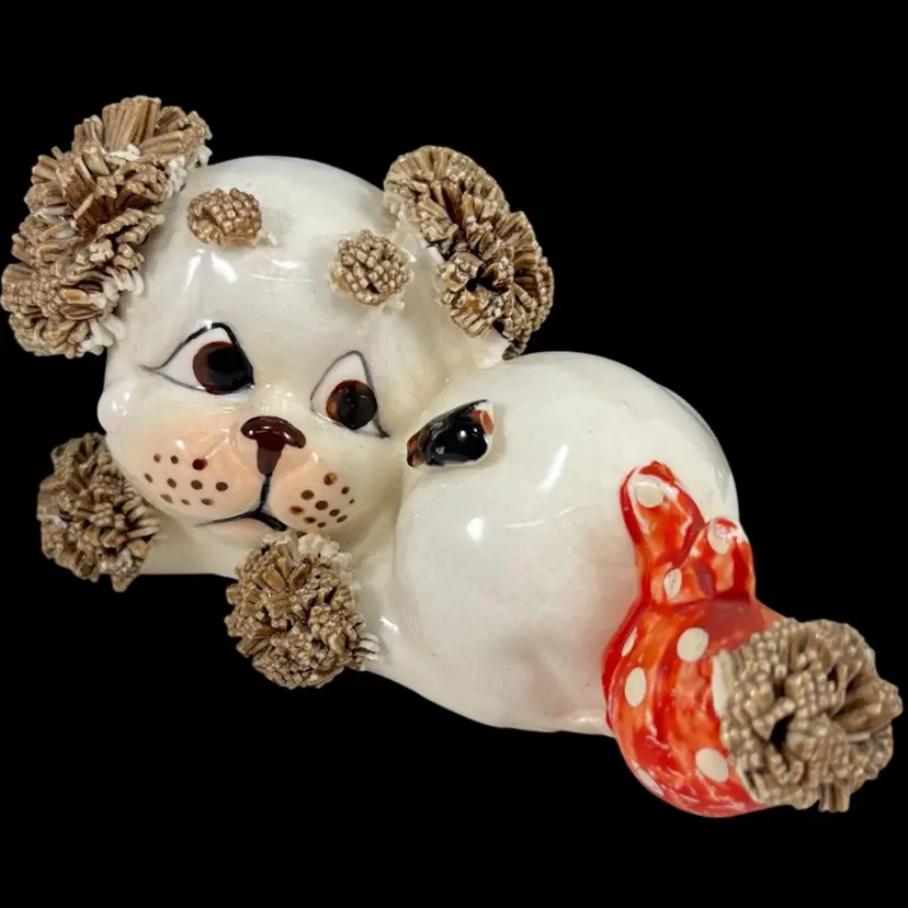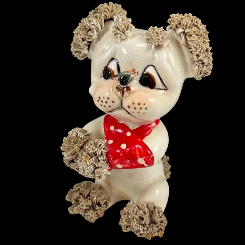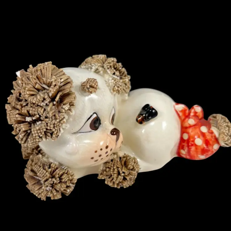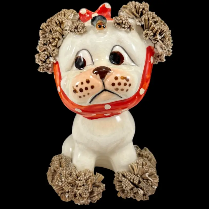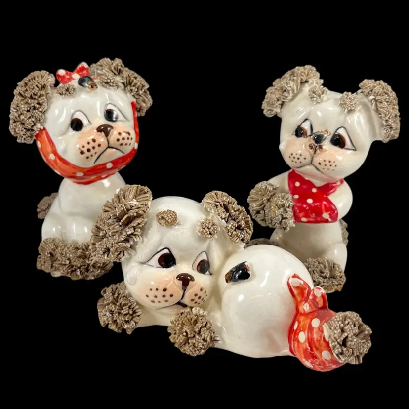 *Read* Set Of Three Vintage Lefton Spaghetti Dogs With Bees And Bandages, Lefton Sad Poodle Puppies With Bandages And Bug, Lefton Porcelain Spaghetti Puppies, Vintage Lefton Dog Figurines, Set of 3 Vintage Lefton Spaghetti Puppy Dog Figurines – Red Bandana Series