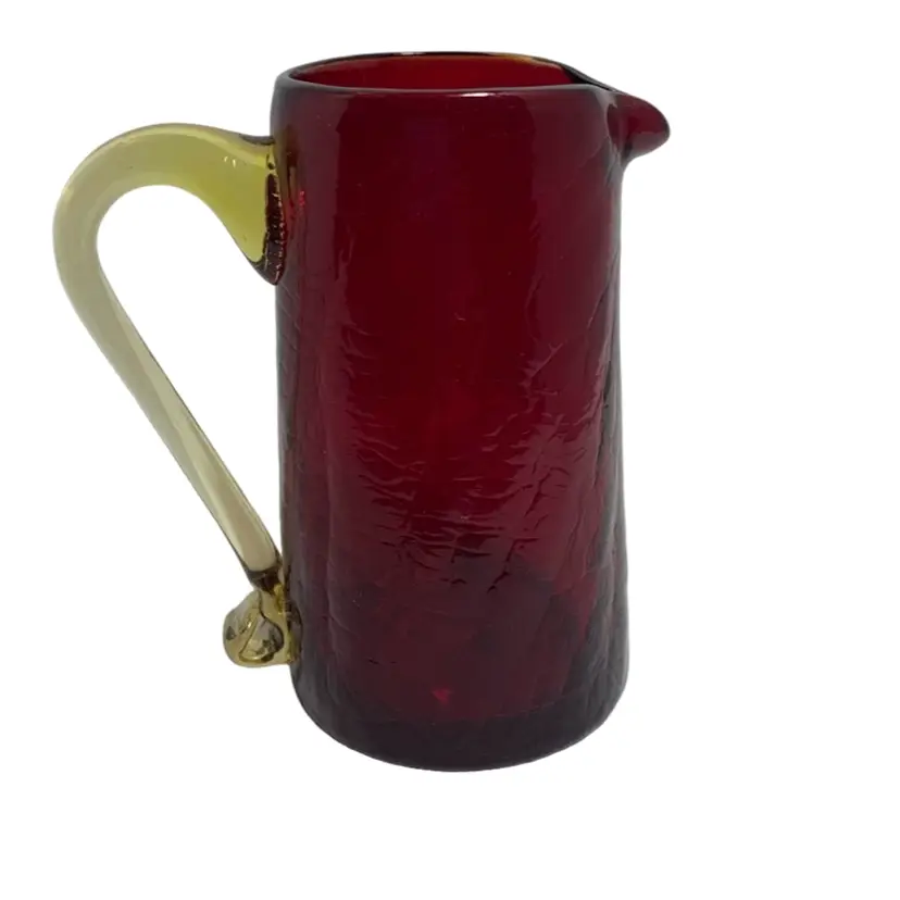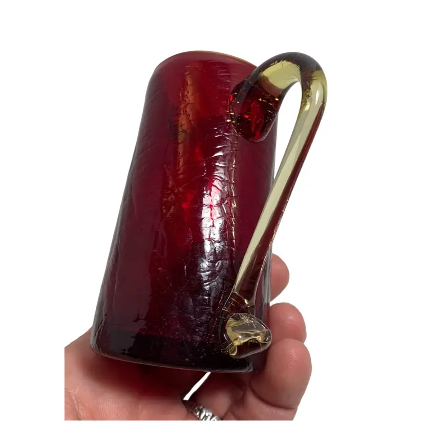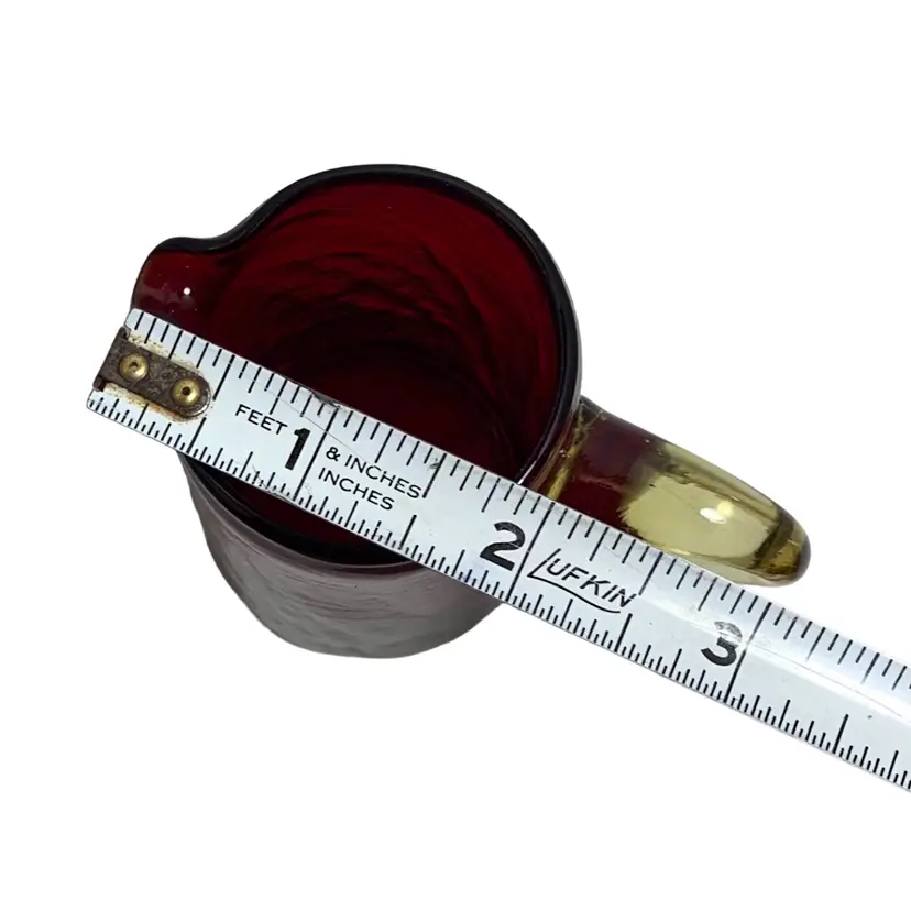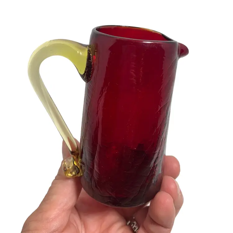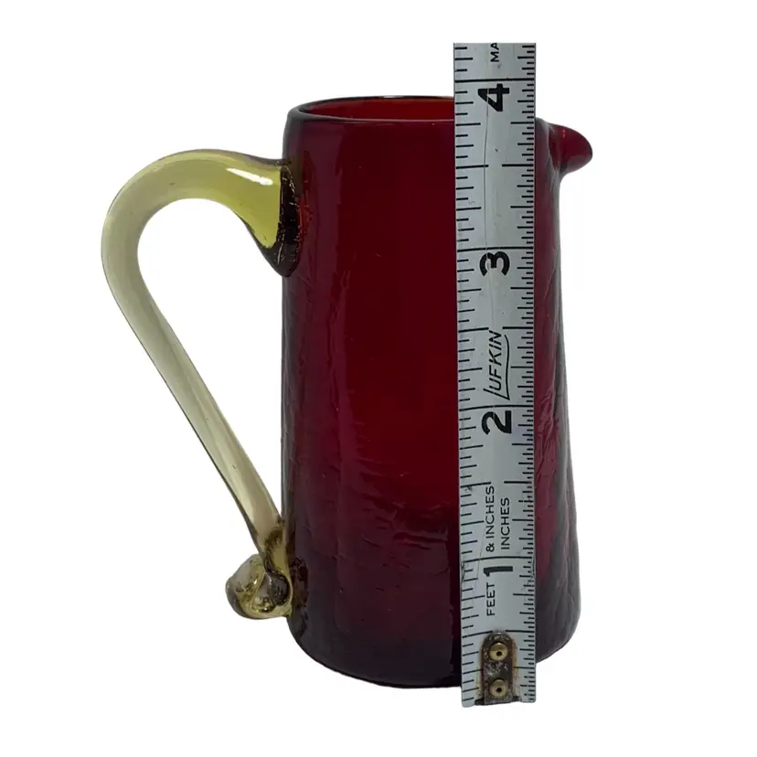 Red Blown Glass Creamer With Amber applied Handle. Small Pitcher. Crinkled Texture 3 3/4” Tall