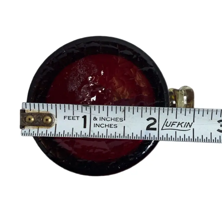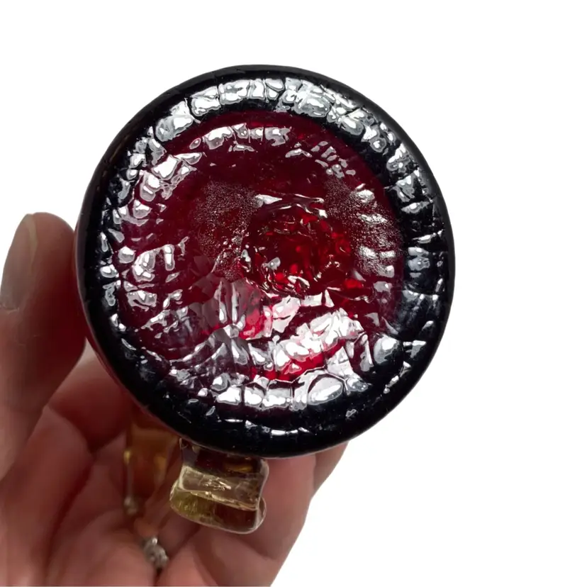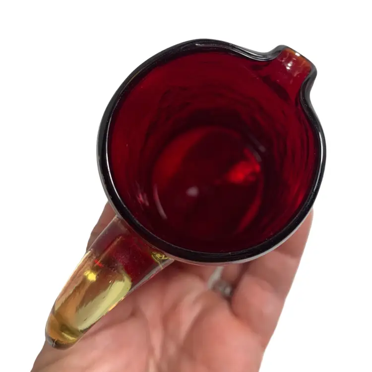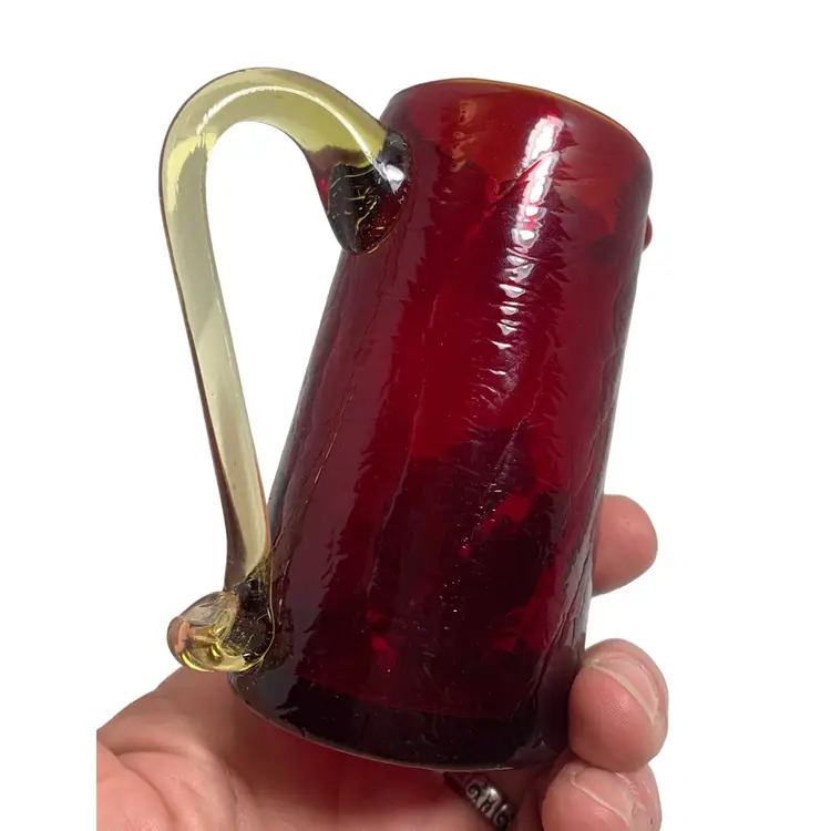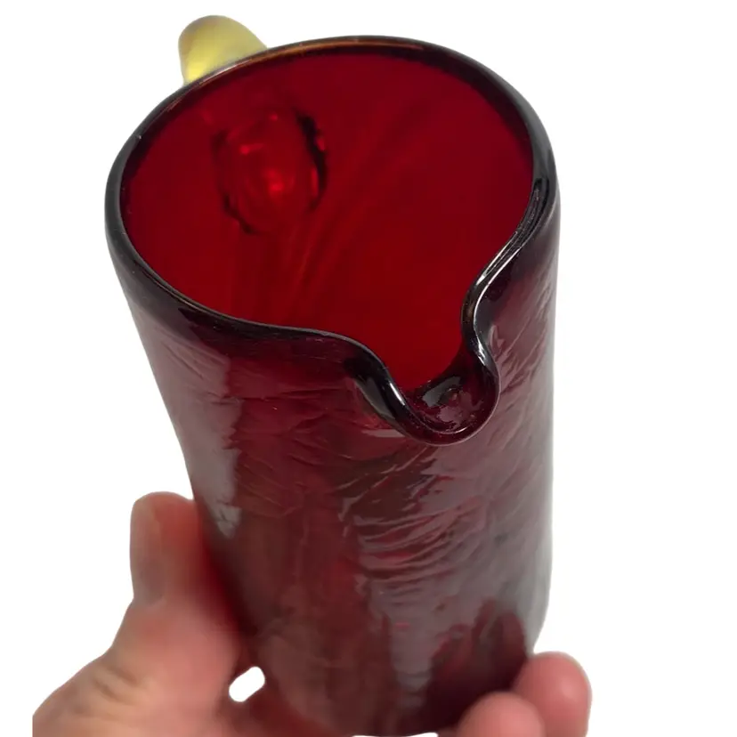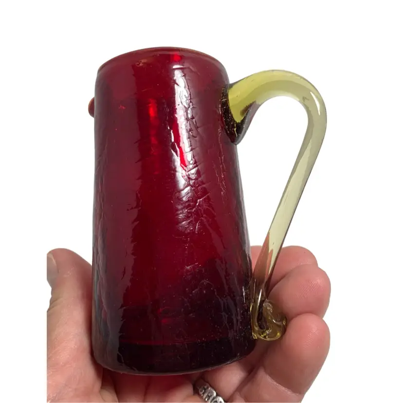 Red Blown Glass Creamer With Amber applied Handle. Small Pitcher. Crinkled Texture 3 3/4” Tall
