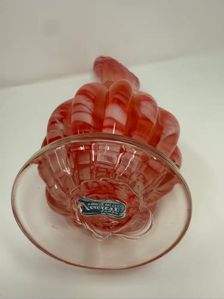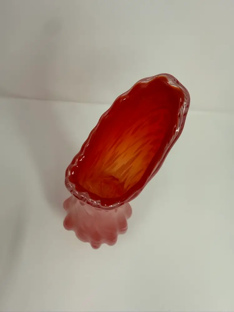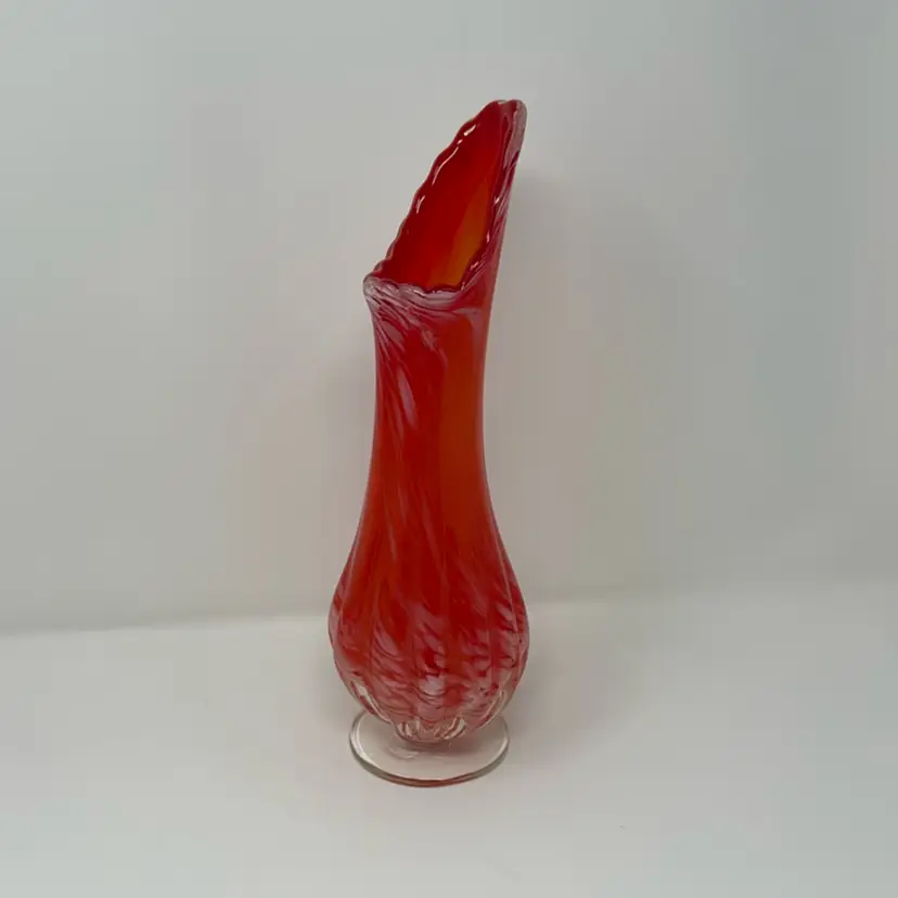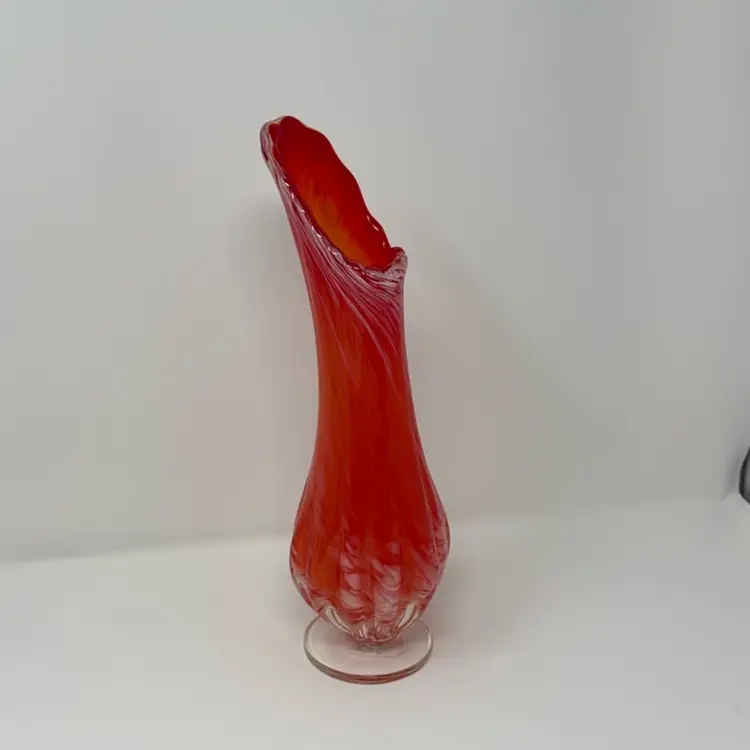 MCM vase features a red/orange and white swirl. Beautiful color gradiation. Rounded ribs on bottom of vase with a ruffle on the rim. Clear footed base. Norcrest sticker on bottom. 11.5” tall 3.5” at widest