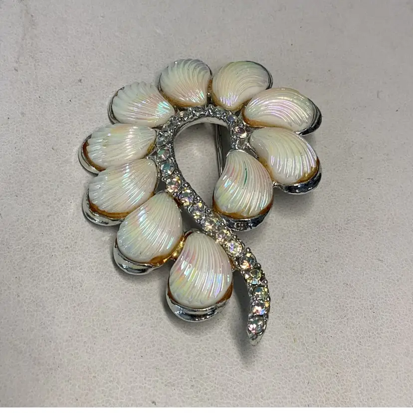 Rhinestone & Shell Brooch 2” Beautiful Condition