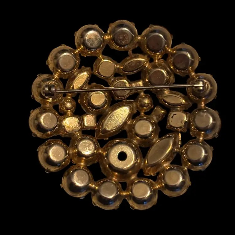 Beautiful multicoloured rhinestone brooch, gold tone. In nice condition, minimal wear to metal. 2”