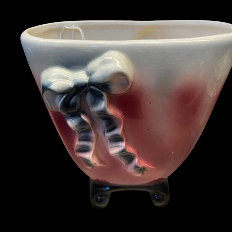 This is a vintage Royal Copley "Bow & Ribbon" footed ceramic planter or vase. It features a decorative bow and ribbon design. The glaze colors are pink/magenta, black, and cream/grey. It is an example of mid-century modern (MCM) art pottery. It typically stands around 6 to 6.5 inches tall. The item is considered a collectible.
