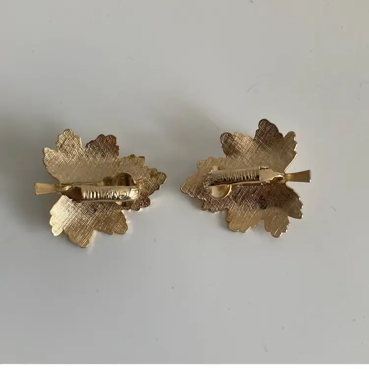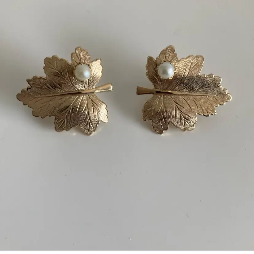Vintage Sarah Coventry “Whispering Leaf” gold maple leaf clip on earrings with faux pearl accents. They measure 1” x 1”. Gold tone metal.