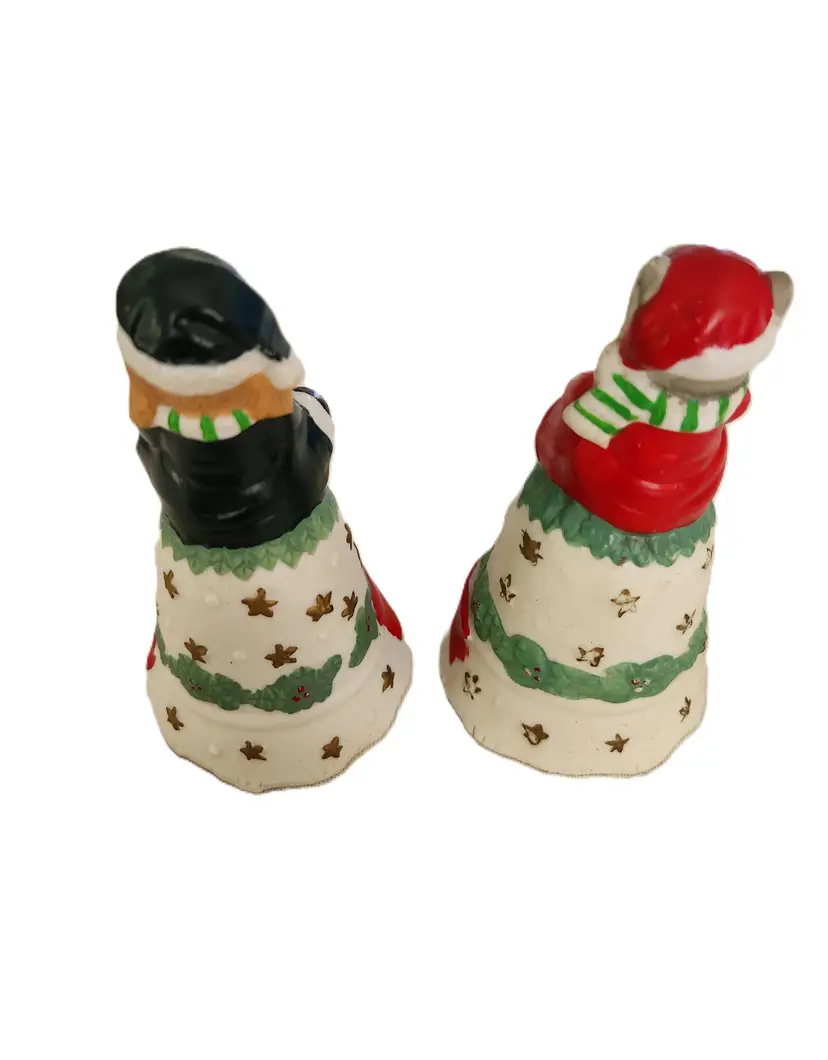 These little guys are so cute! The cat bell is holding a doll and the dog is holding a candy cane. There are no chips or cracks. The dog bell looks newer than the cat. The cat has some paint rubbing on the stars. They stand approximately 4 1/2 inches tall and are 2 1/2 inches wide.