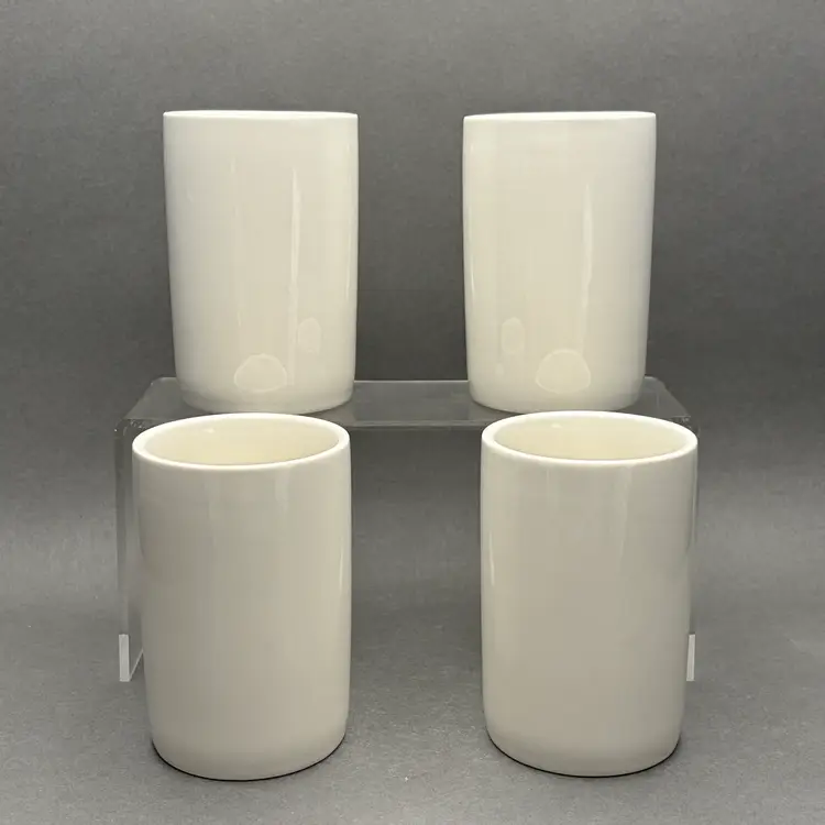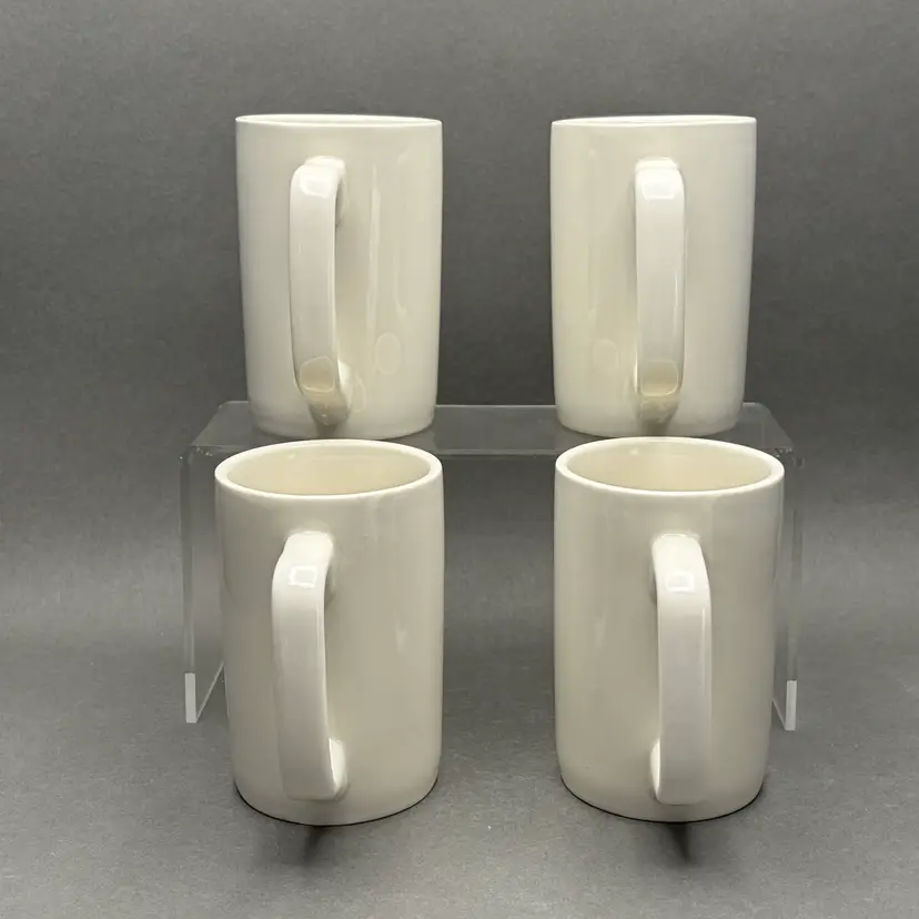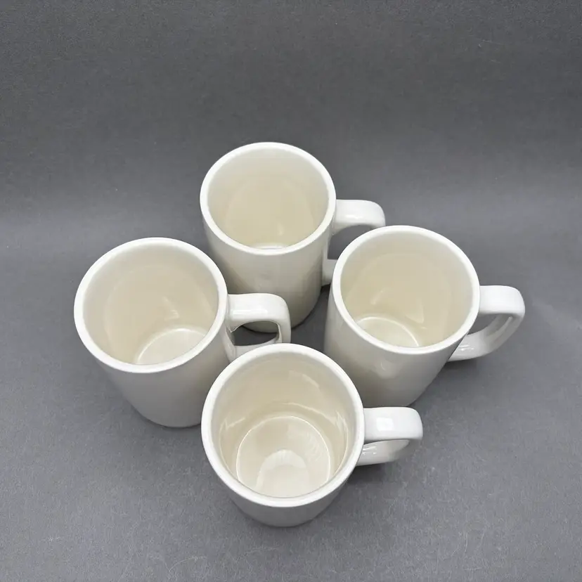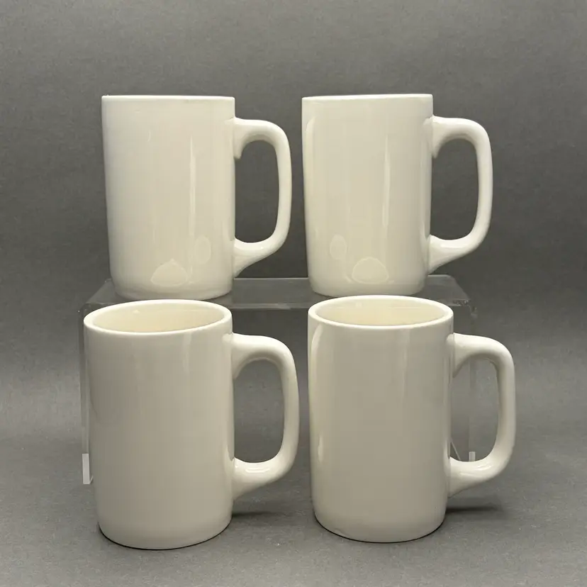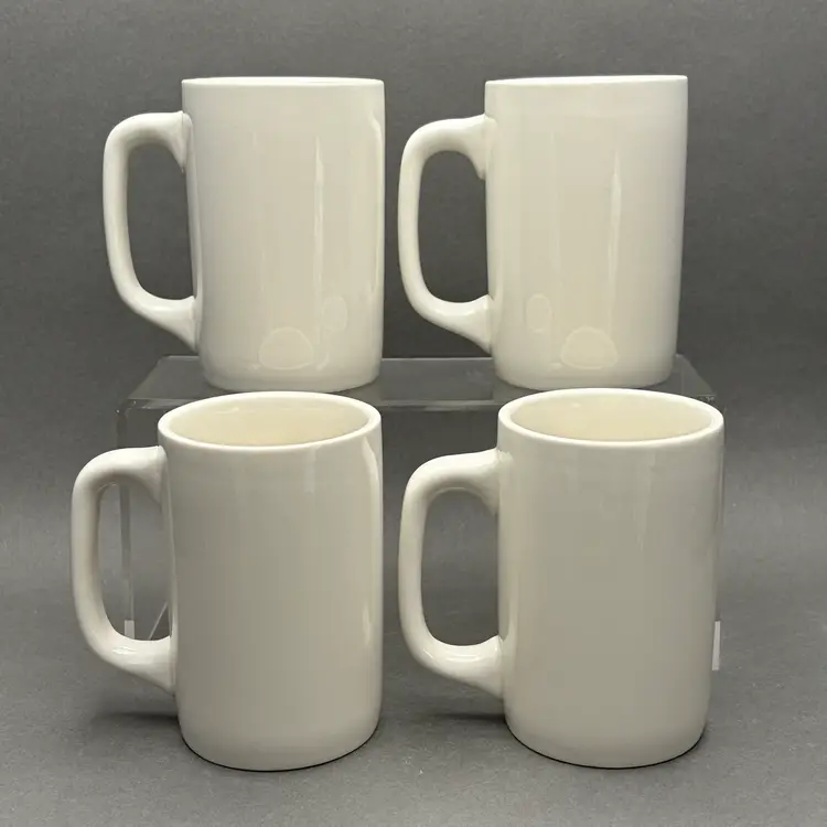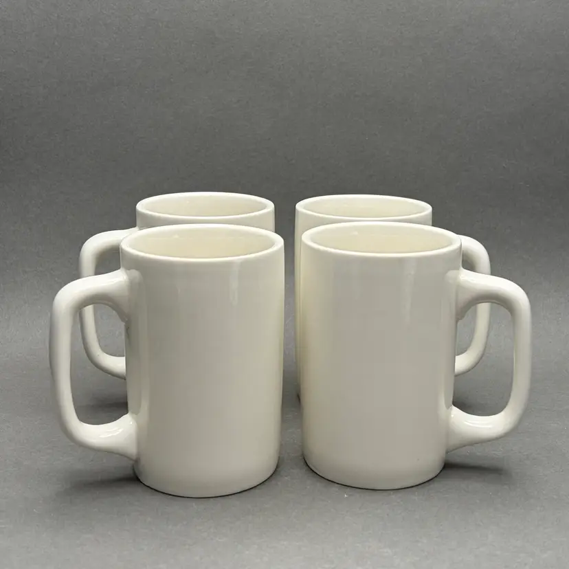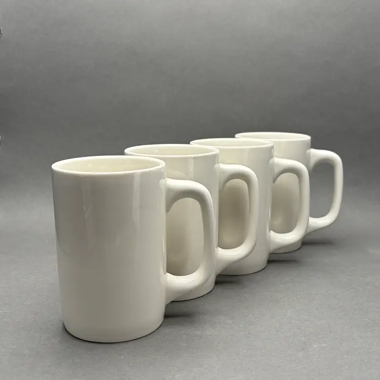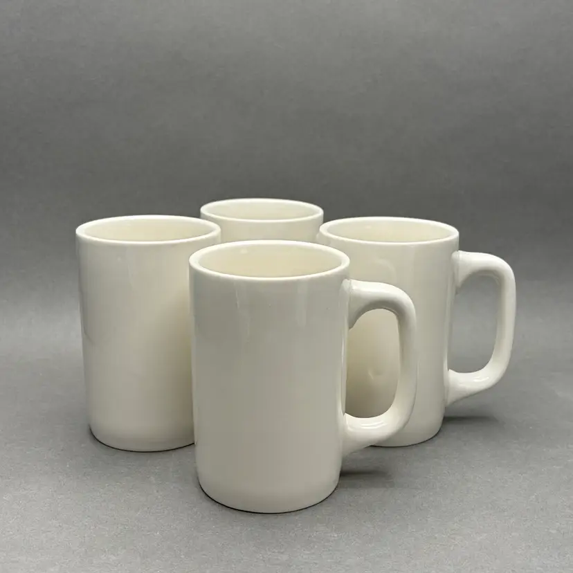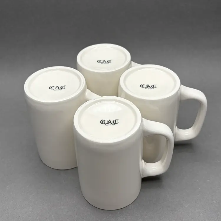 This set of four heavy-duty restaurant ware mugs features a classic design and sturdy handles, perfect for serving Irish coffee or hot cocoa. Made by CAC China, these durable beige ceramic cups offer a timeless, diner-style aesthetic for your kitchen. Two sets of 4 available.