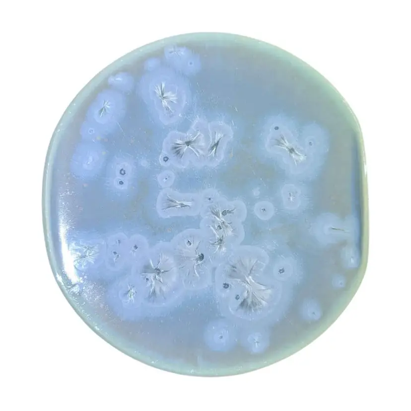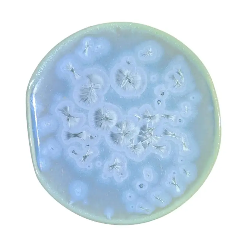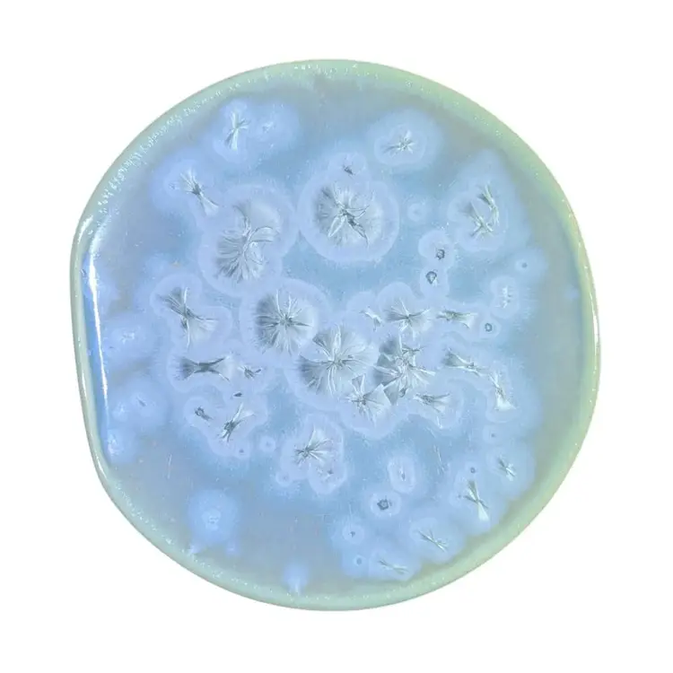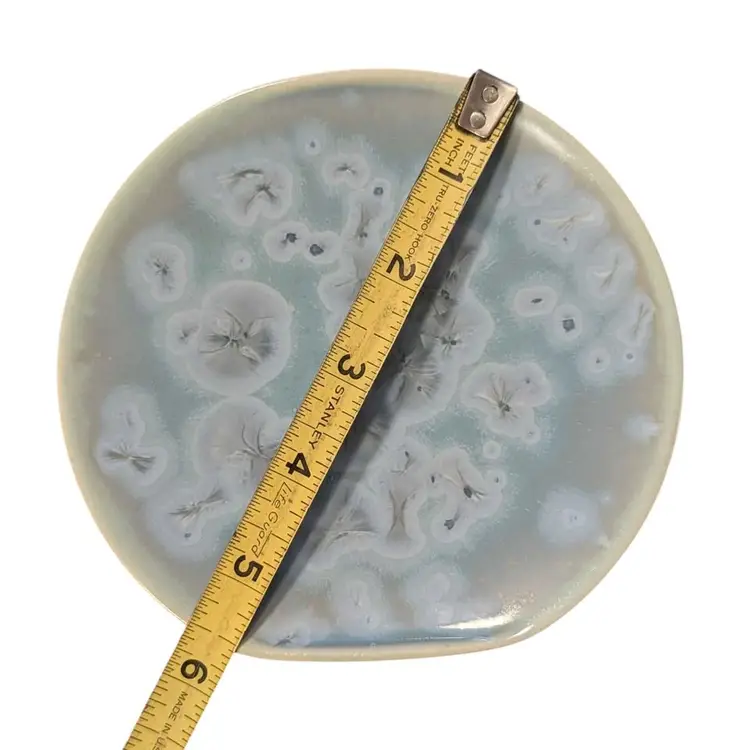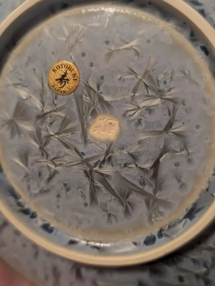 Set Of 4 Kotobuki Kyo Kiyomizu Yaki Ware Pottery Flower Crystal Plates Japan 5.5". This set of 4 plates is absolutely gorgeous - they are all a little different but they are all the same aqua color scheme. This style of pottery and glazing makes for such unique designs - they have a metallic crystal look about them - almost like a stone or mineral and the more they move around in the light the more variations they have. These are all in excellent condition with no chips or cracks and each one has a mark in the middle of the bottom of the plate as well as a sticker marked Kotobuki Japan. Measurements are in the photos.
