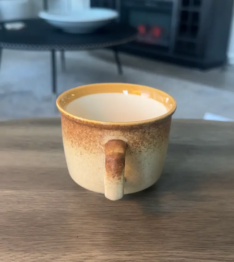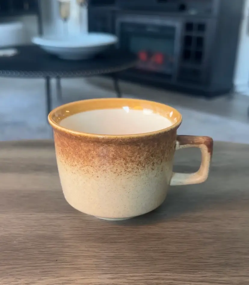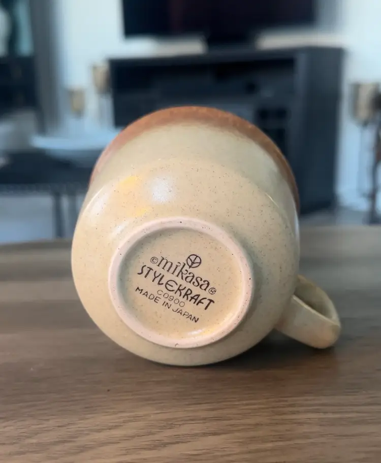 This set of four vintage Mikasa whole wheat stoneware mugs features a speckled design, making them a stylish and functional addition to any kitchen or dining area. The round shape and brown color add a rustic touch. These mugs are suitable for all occasions. Made of durable stoneware and produced in the 1970s, these mugs are a charming and timeless piece for any home. Measuring 3.5” x 2.5”.