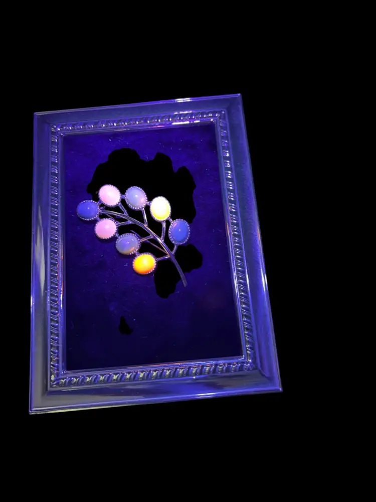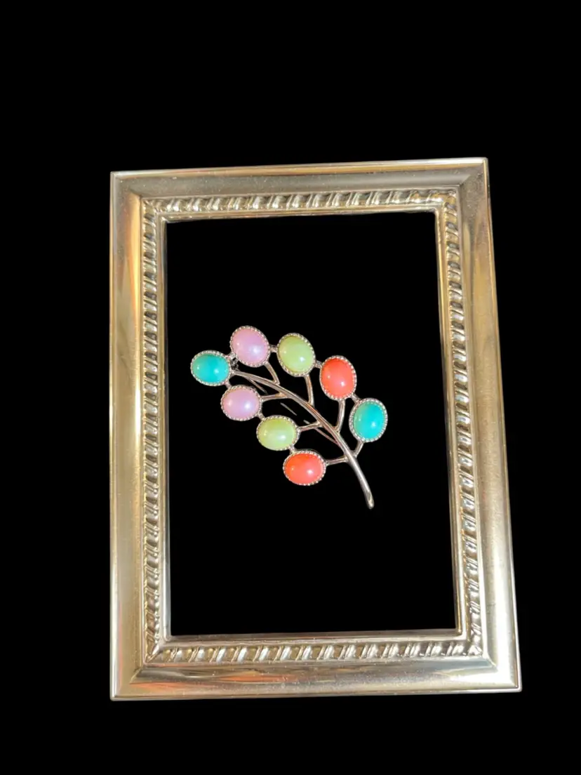 This is a pretty and a playful brooch. I love this. It makes me smile. Open backs around cabochon on the back of the brooch. All those feel good colors. It is in excellent condition. Clasp is secure. Measures approx 2.5"L, 1.5"W