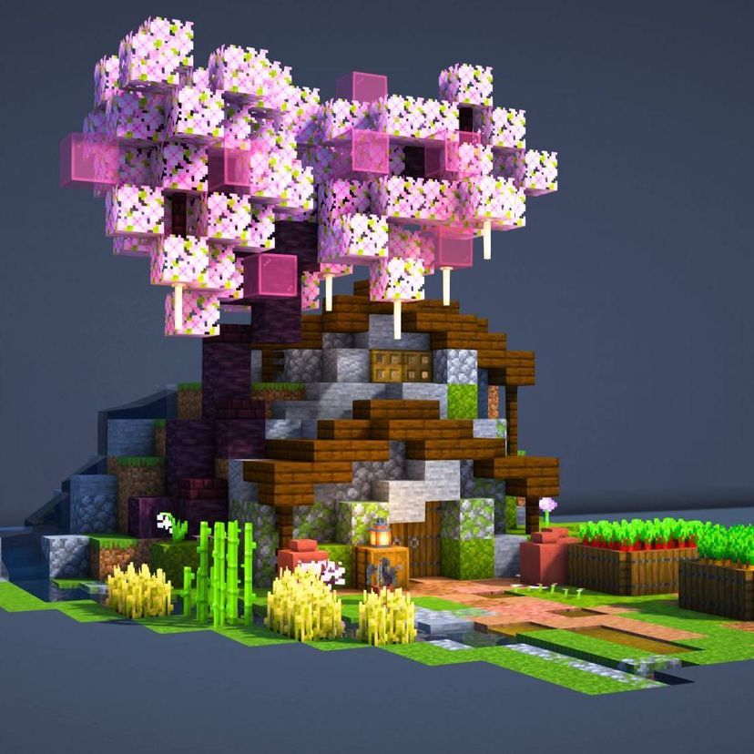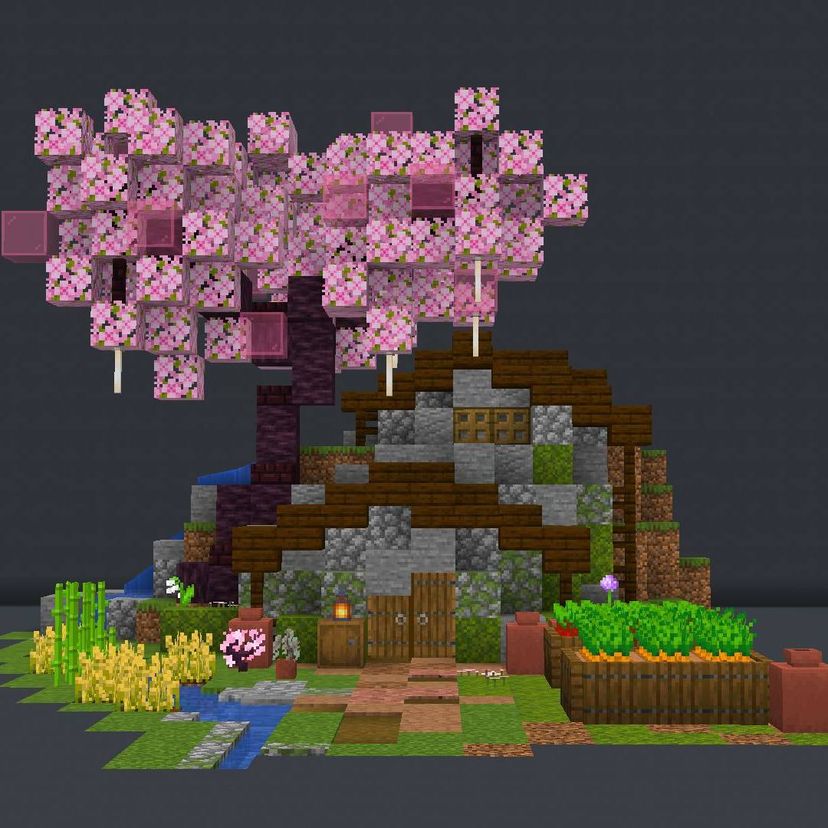 Key feature(s): • Custom cherry blossom tree • Custom mini waterfall and river • 2 crop farms for wheat, potatoes, carrots, beetroot, pumpkins, melons