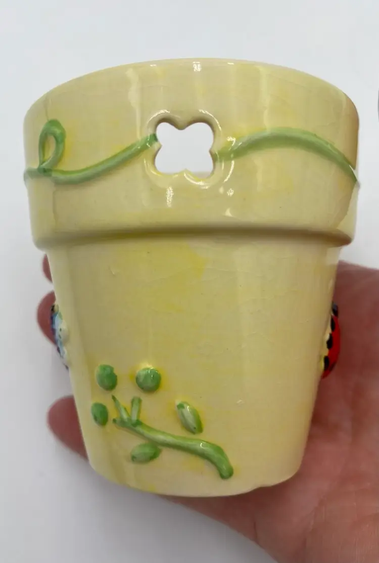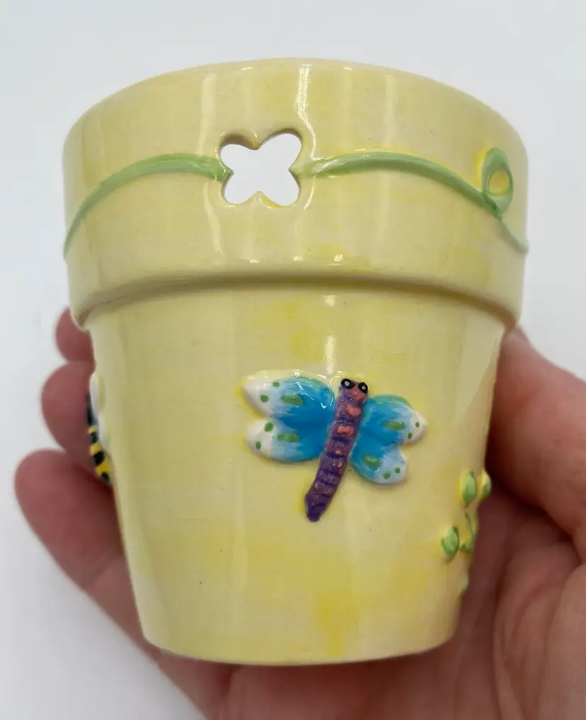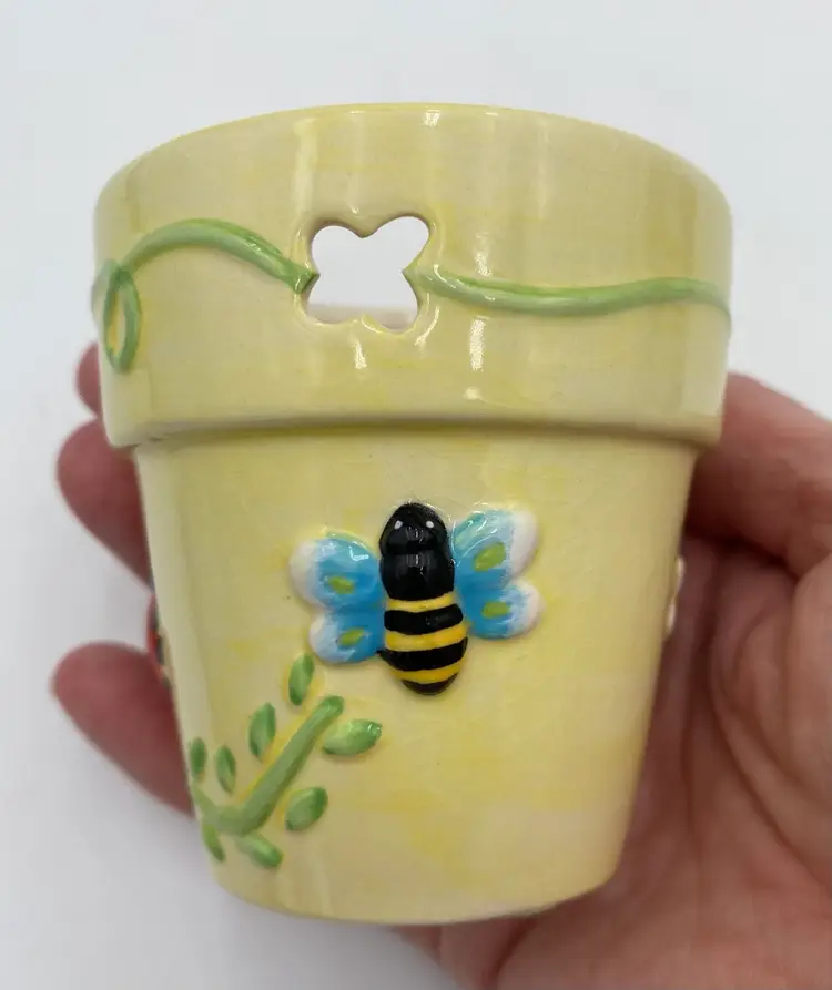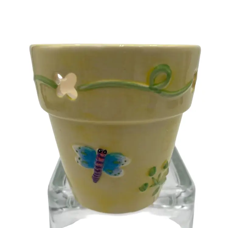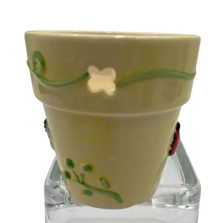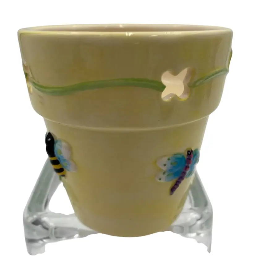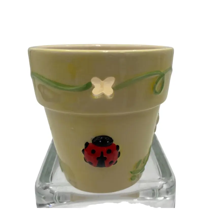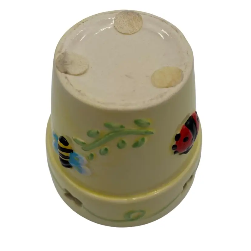 This cute little ceramic candle features an embossed design of a ladybug, dragonfly and bumblebee along with green florals and cut-out flowers on the rim. The candle is unscented. With a burning time of more than 5 hours, this yellow holder is a lovely addition to your home.