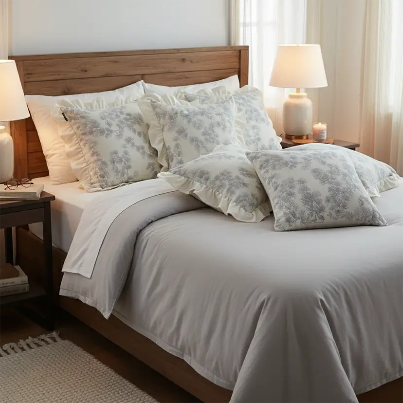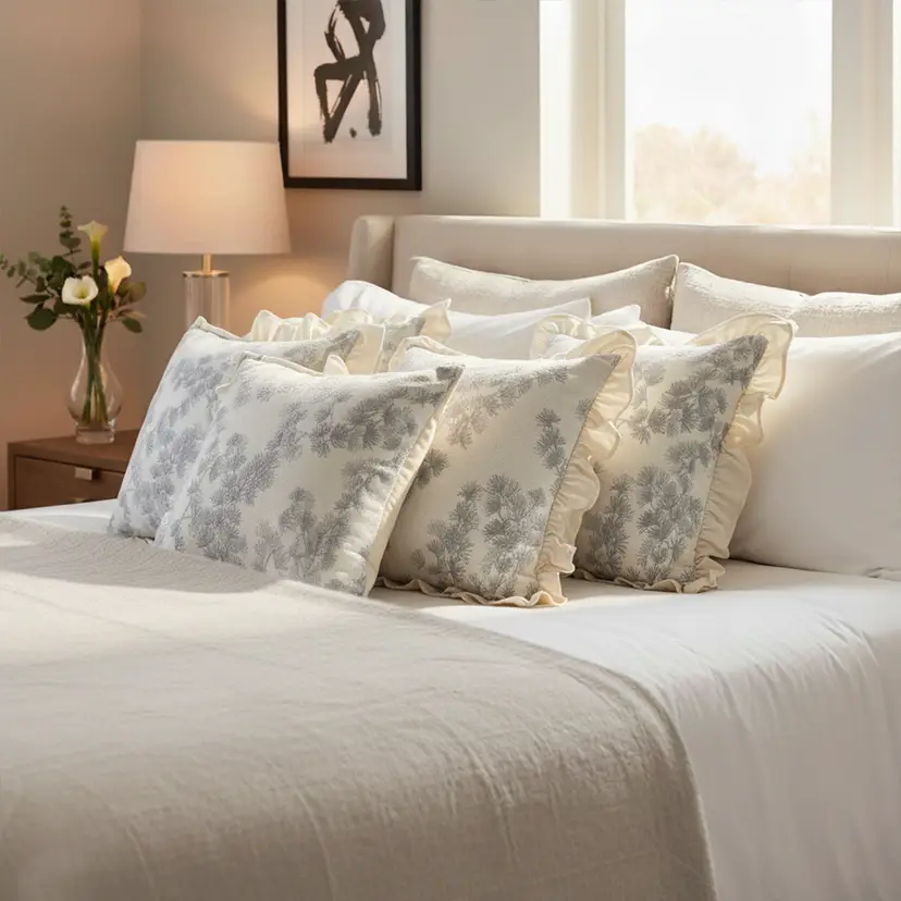 Elegant Floral Design: Gray floral patterns on white pillowcases with ruffle trim add sophistication, texture, and visual appeal.