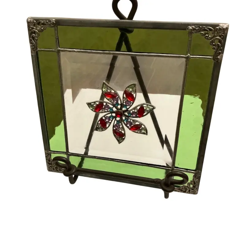 Beautiful green and clear stained glass square with raised floral design with rhinestones and gemstones in the center. Display on an easel in your window or on a shelf.