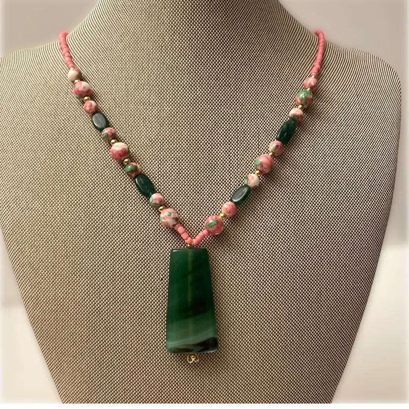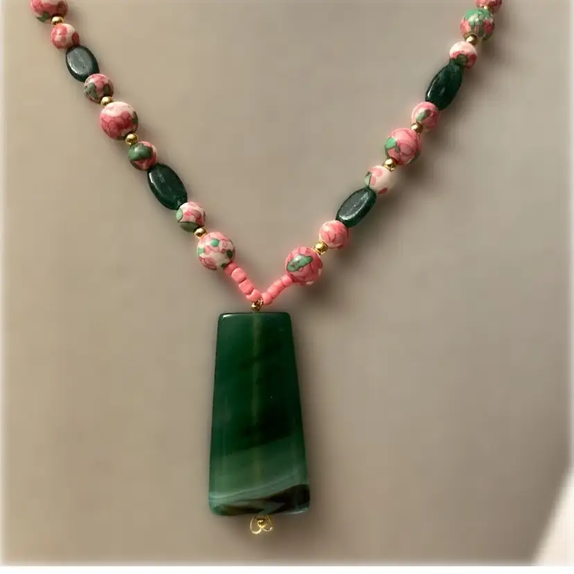Stunning green agate pendant necklace with hand painted pink floral accent beads. The necklace measures between 20” to 21” with adjustment. The pendant measures 7/7” x 2”. This is an upcycled design using vintagebeads and findings.