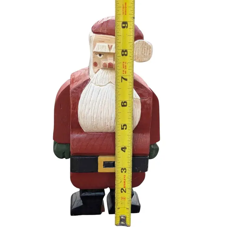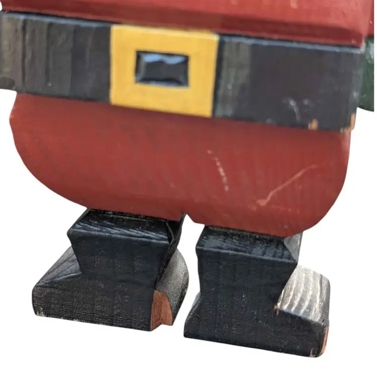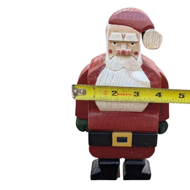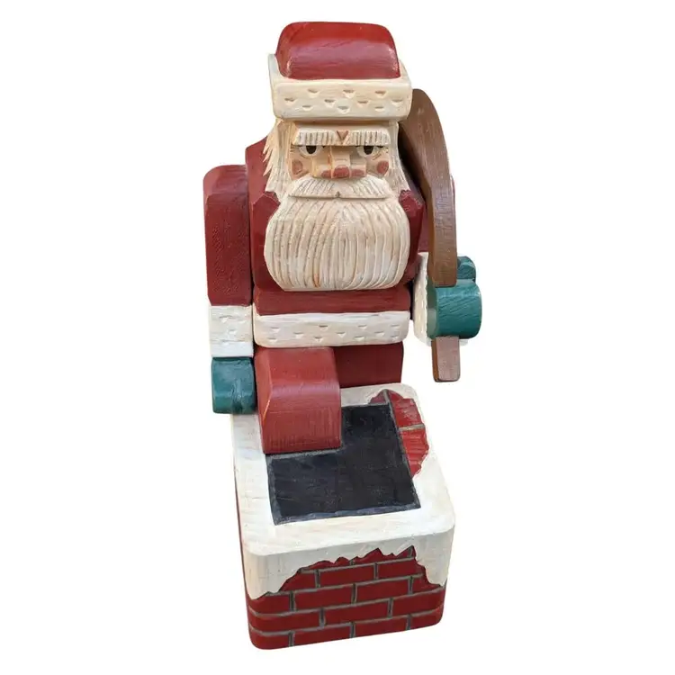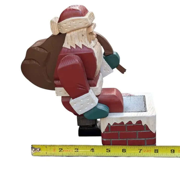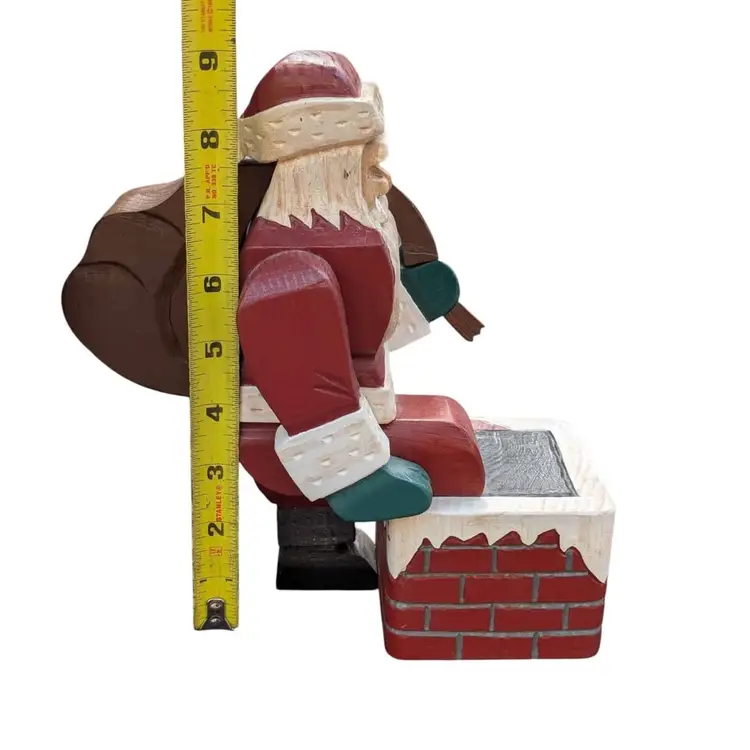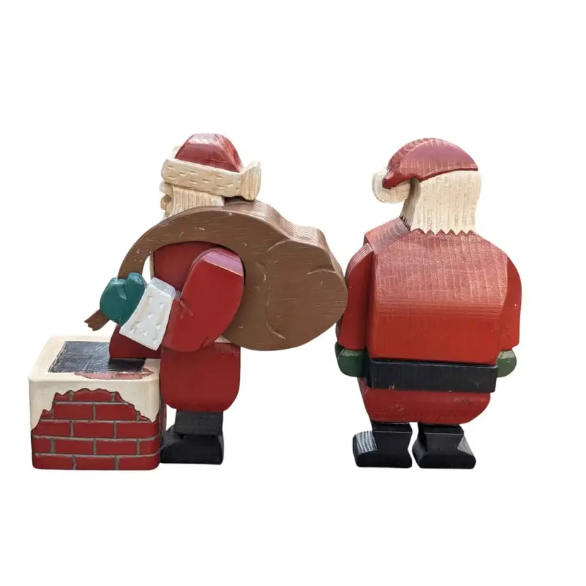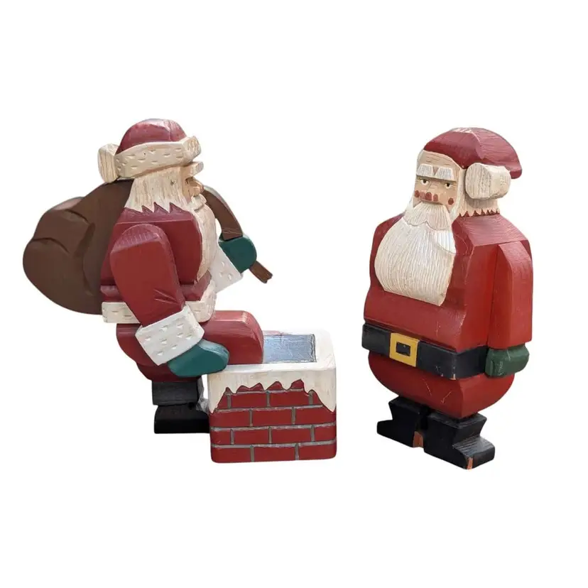 Super Cool Pair Of Two Vintage Handmade Wooden Block Santa Figurines Signed. These two santas are super unique and have a lot of character and detail. They are handmade and hand painted and signed "SN" with one dated '94 and the other '96. There is one where Santa is holding his sack of toys and taking a step into the chimney. The other is just in a standard stance pose. They do have some signs of age, a couple of little scratches/scuffs and the one that is standing up does have some chips on his feet as shown in the photos. They both stand 9" tall. Such a fun and unique addition to any Santa collection!