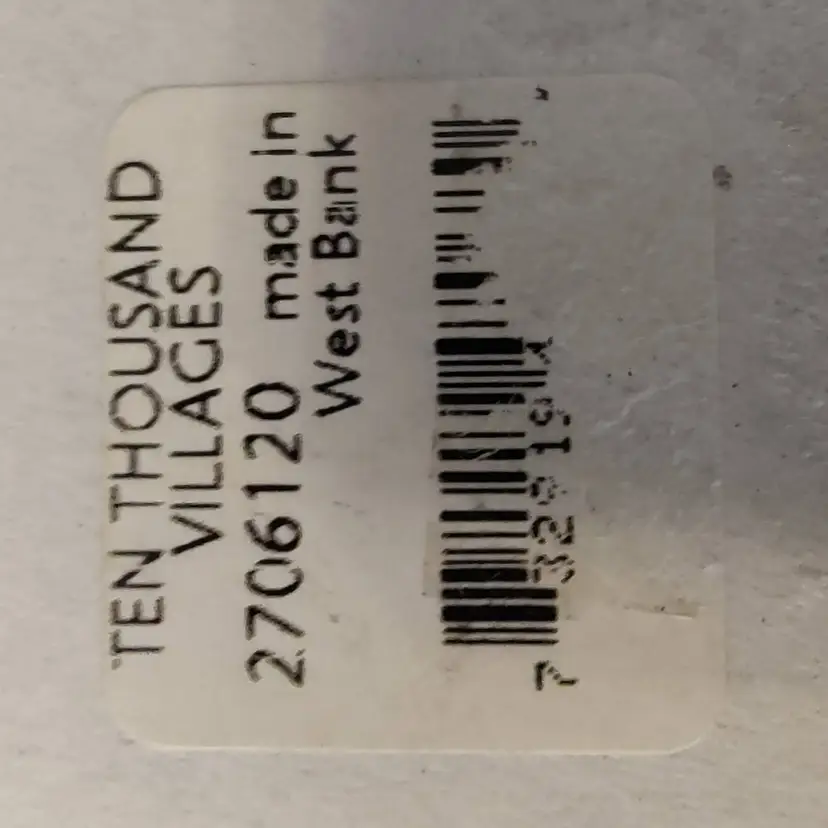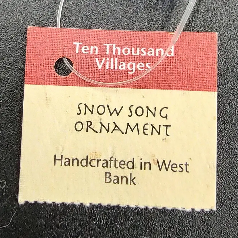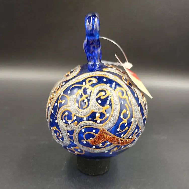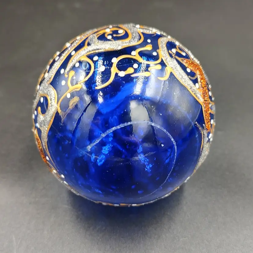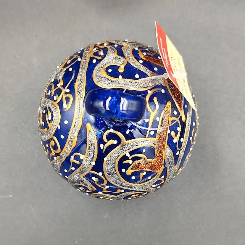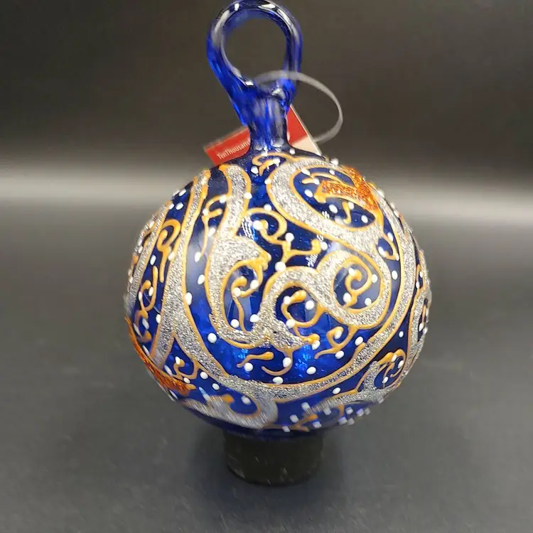 Ten Thousand Villages Snow Song Blown Glass Ornament in original box with tag. Hand Painted gold and silver swirls design. Height 4" x diameter 3". Made in West Bank ,Hebron