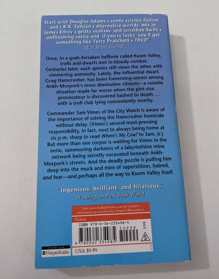 The Crime A prominent dwarf demagogue has been found hammered to death in a dark mine under the city. The weapon? A troll club. The tension in Ankh-Morpork is thick enough to cut with an axe (or a heavy stone fist), and the streets are a powder keg waiting for a spark.
