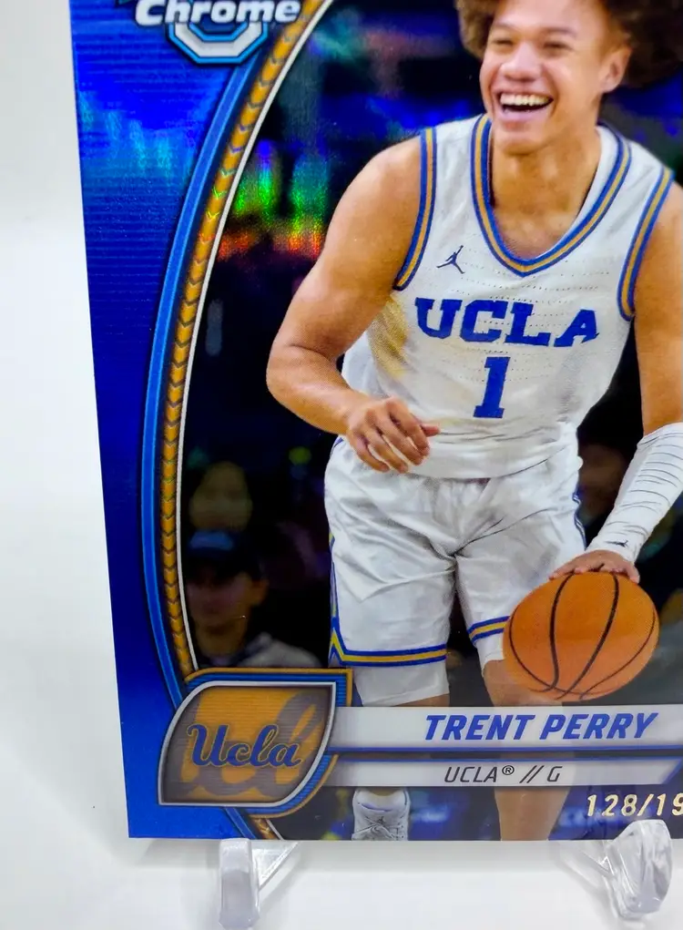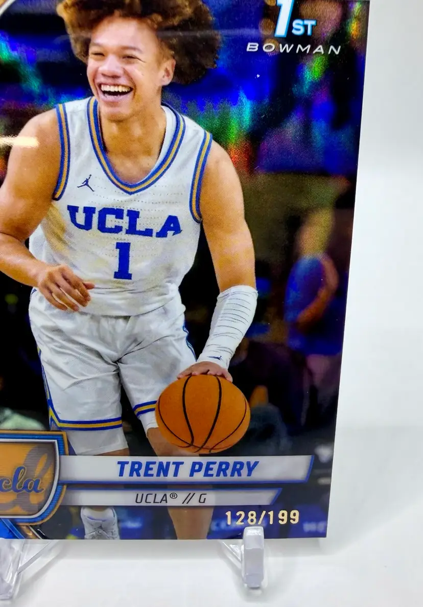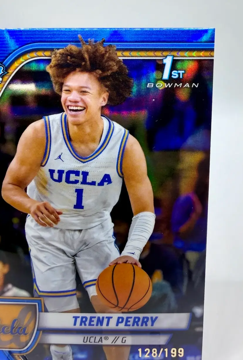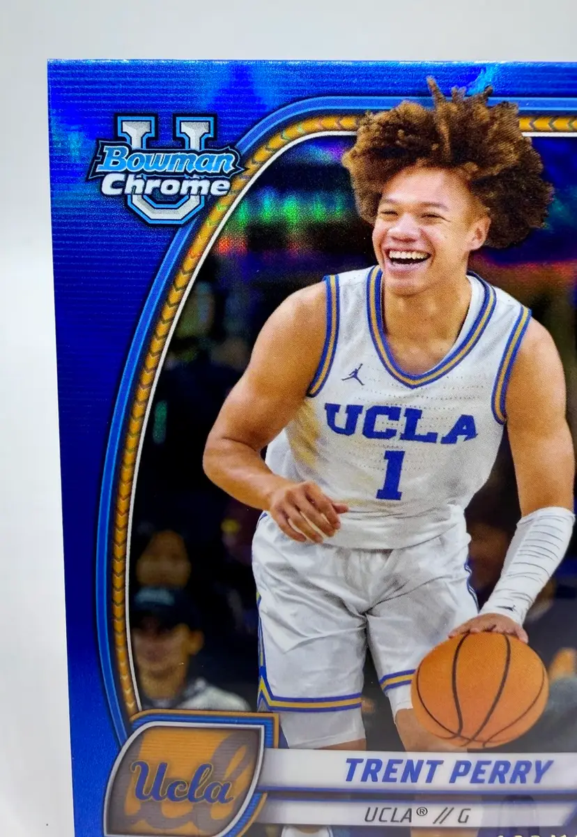 The Trent Perry 2024-25 Bowman University Chrome #67 Blue Refractor /199 trading card is a highly collectible item featuring the UCLA Bruins basketball player. This card, manufactured by Bowman, is part of the 2024-25 Bowman University Chrome set and belongs to the Blue Refractor subset. Please review the photos carefully to assess the condition of the cards. We do our best to provide clear, detailed images, especially for cards with noticeable flaws. Please note that some raw cards may show light wear, so we encourage close inspection. Cards will be shipped securely. Thank you for checking out our store and for your support! I'm on Instagram as @915_rookie_rush_trading_cards.