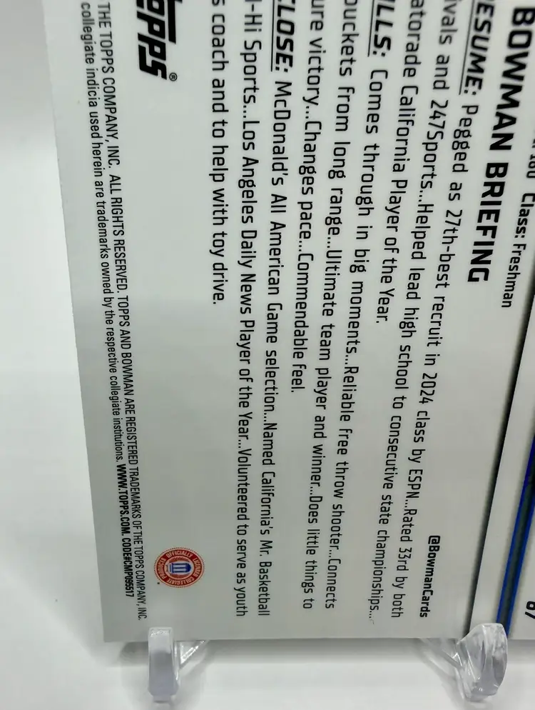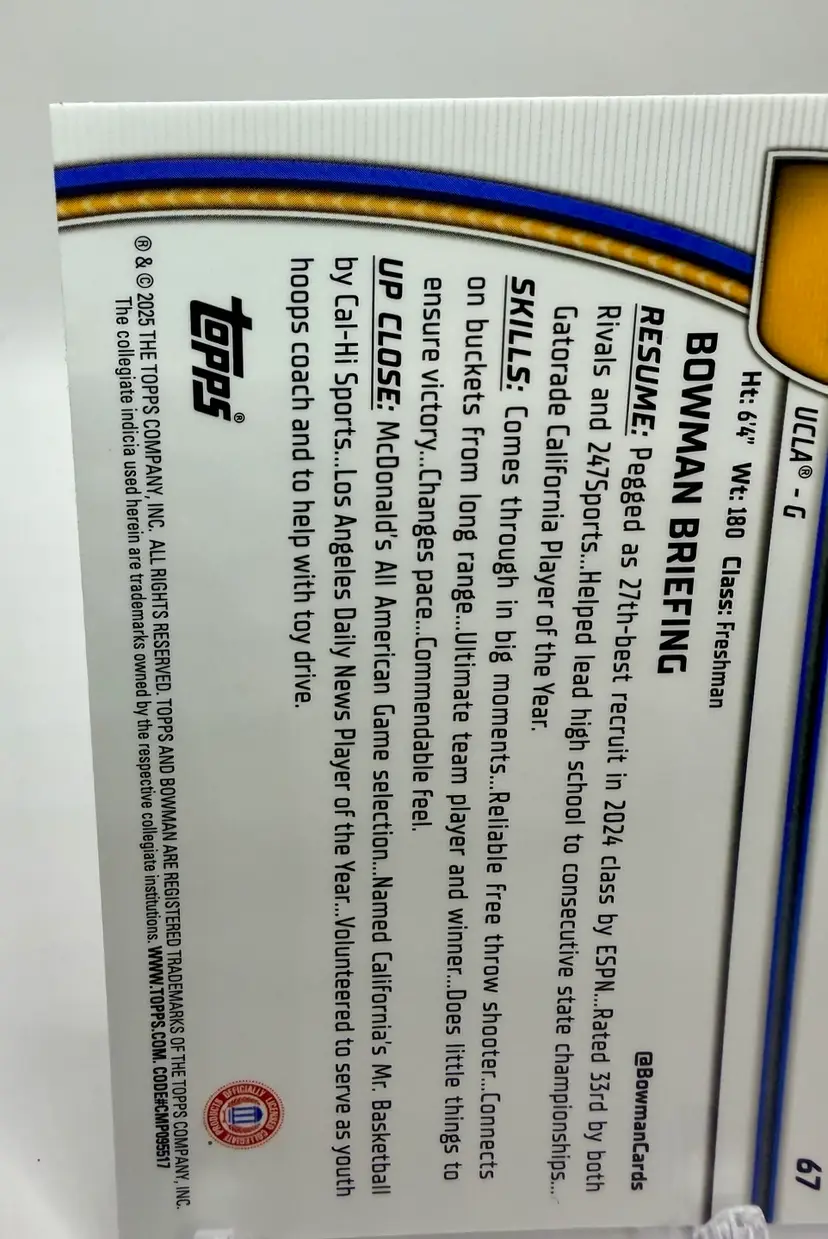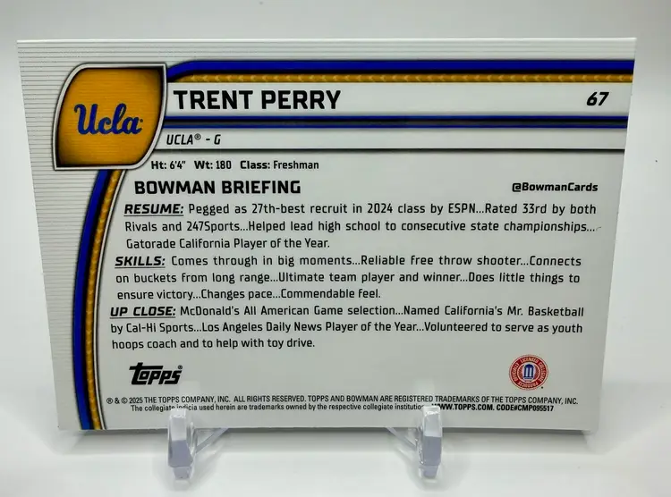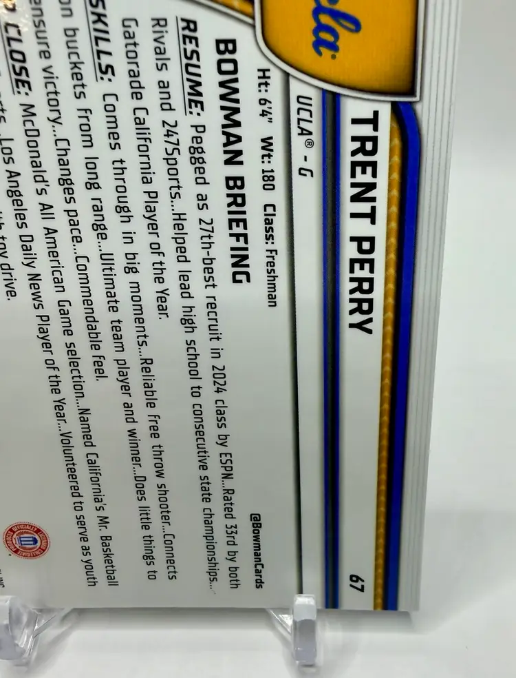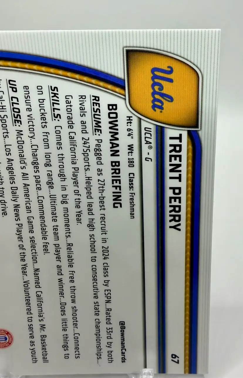 The Trent Perry 2024-25 Bowman University Chrome #67 Blue Refractor /199 trading card is a highly collectible item featuring the UCLA Bruins basketball player. This card, manufactured by Bowman, is part of the 2024-25 Bowman University Chrome set and belongs to the Blue Refractor subset. Please review the photos carefully to assess the condition of the cards. We do our best to provide clear, detailed images, especially for cards with noticeable flaws. Please note that some raw cards may show light wear, so we encourage close inspection. Cards will be shipped securely. Thank you for checking out our store and for your support! I'm on Instagram as @915_rookie_rush_trading_cards.
