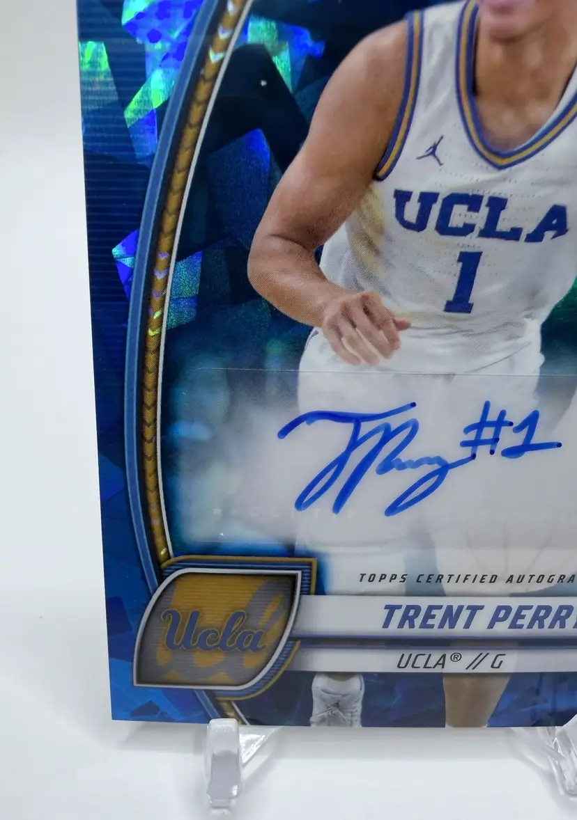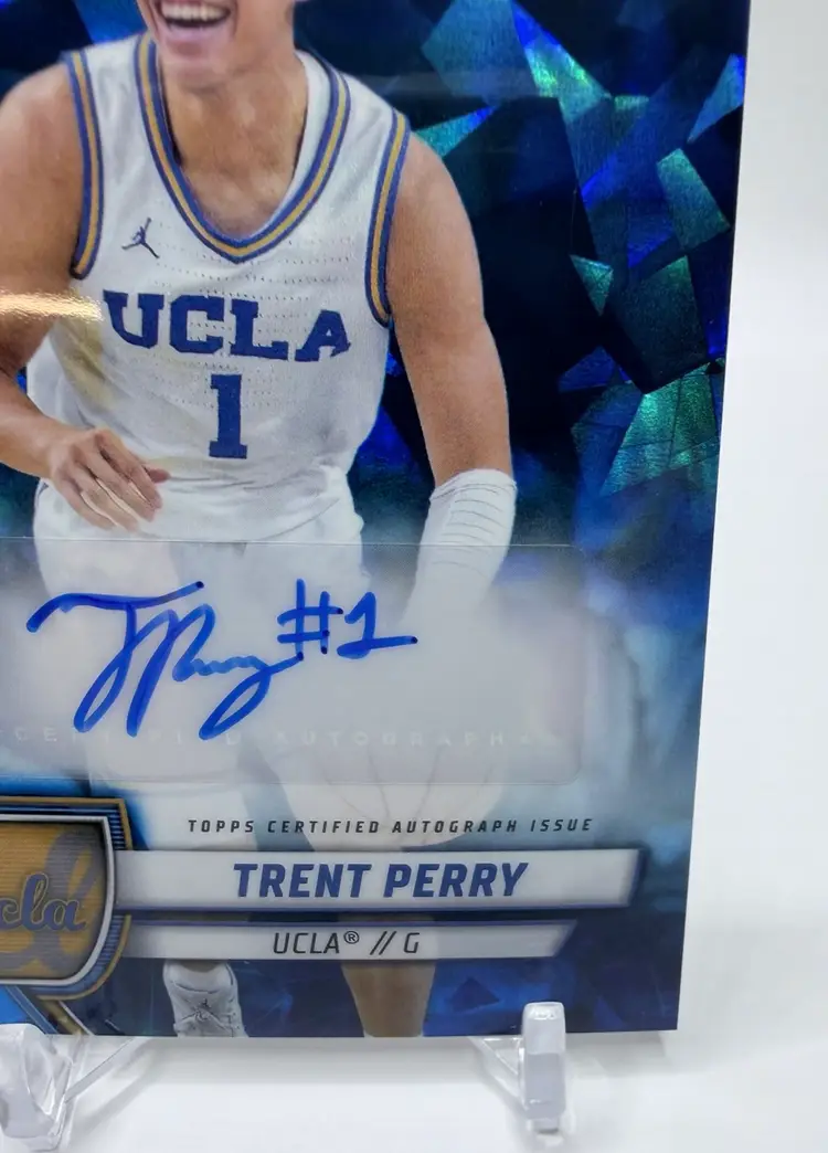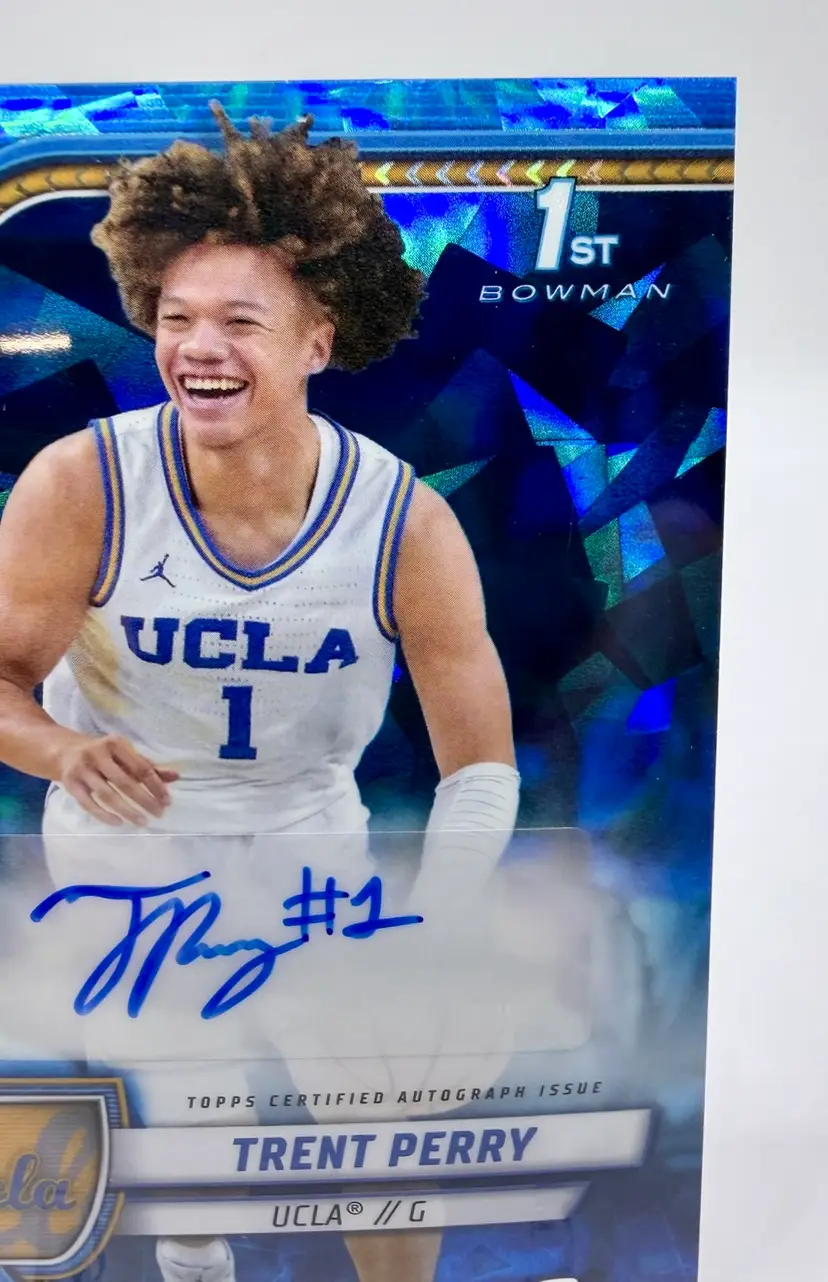 2025 Bowman Chrome Blue Sapphire Refractor Auto 1st Bowman trading card featuring Trent Perry of the UCLA Bruins. The card is autographed by Trent Perry with a label or sticker, authenticated by Bowman. Please review the photos carefully to assess the condition of the cards. We do our best to provide clear, detailed images, especially for cards with noticeable flaws. Please note that some raw cards may show light wear, so we encourage close inspection. Cards will be shipped securely Thank you for checking out our store and for your support! I'm on Instagram as @915_rookie_rush_trading_cards.