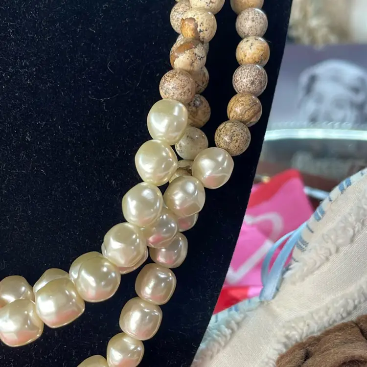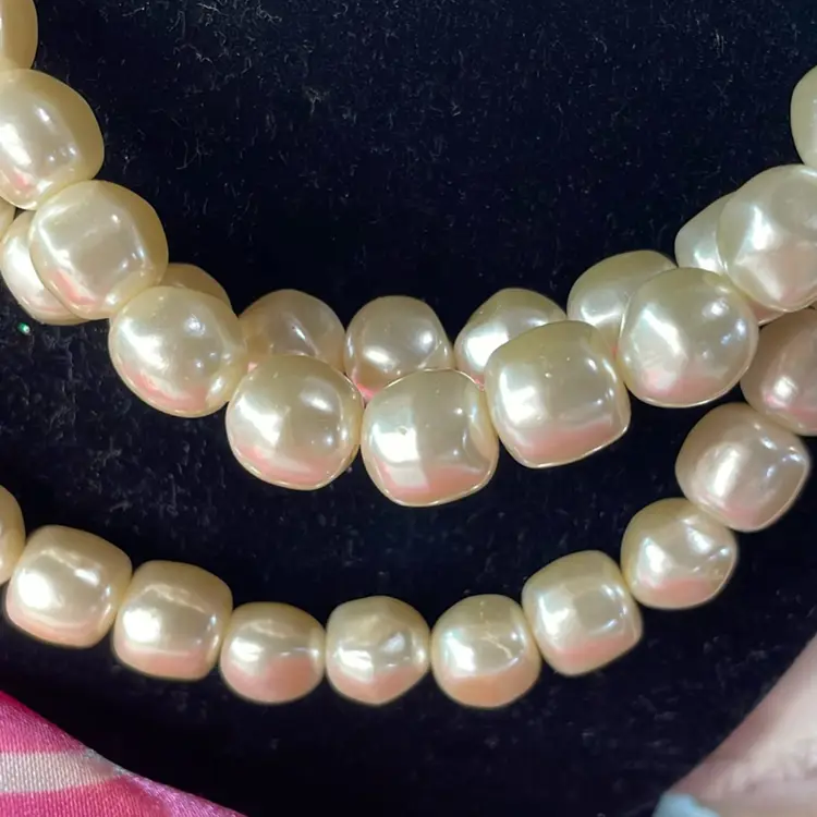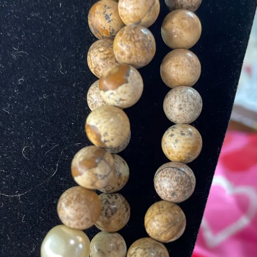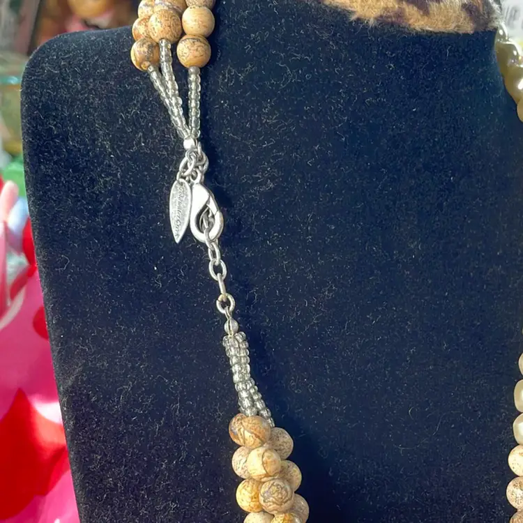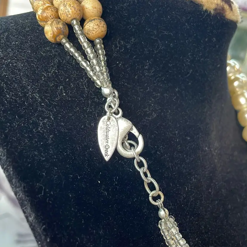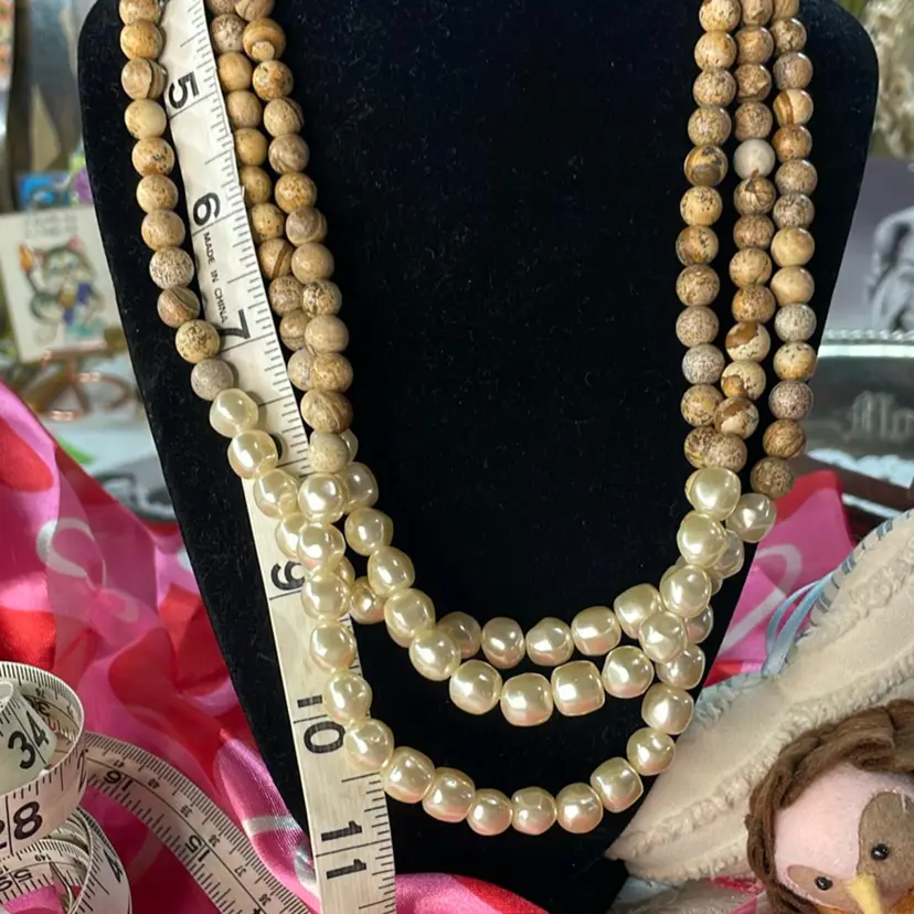 This beautiful triple strand would match about anything, so lovely. From clasp to bottom around 11”