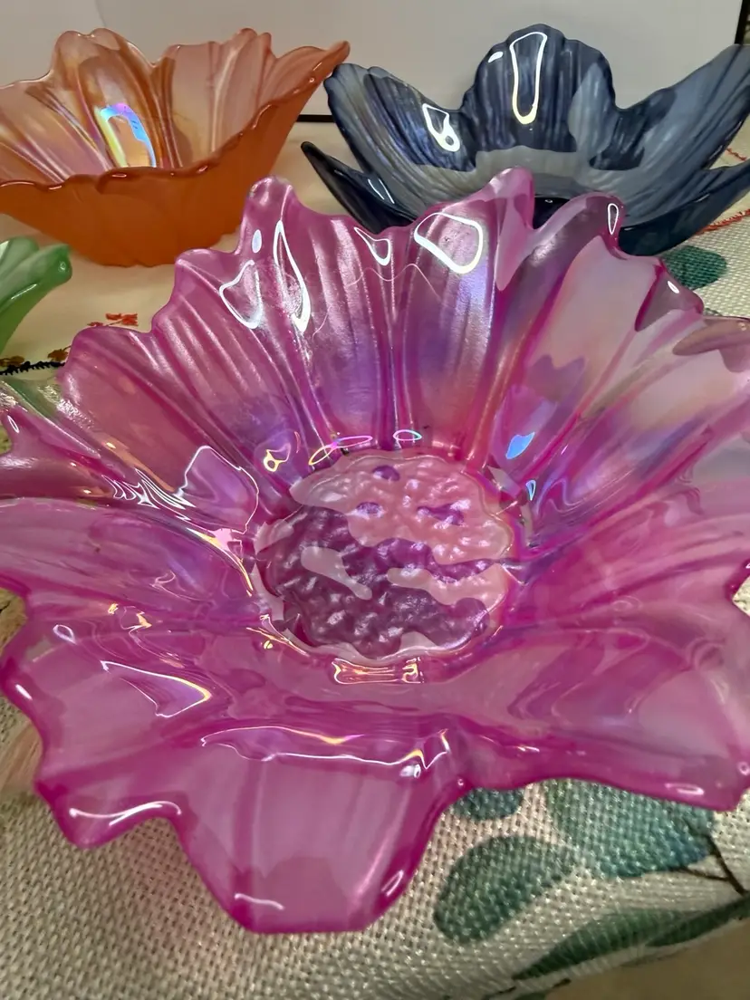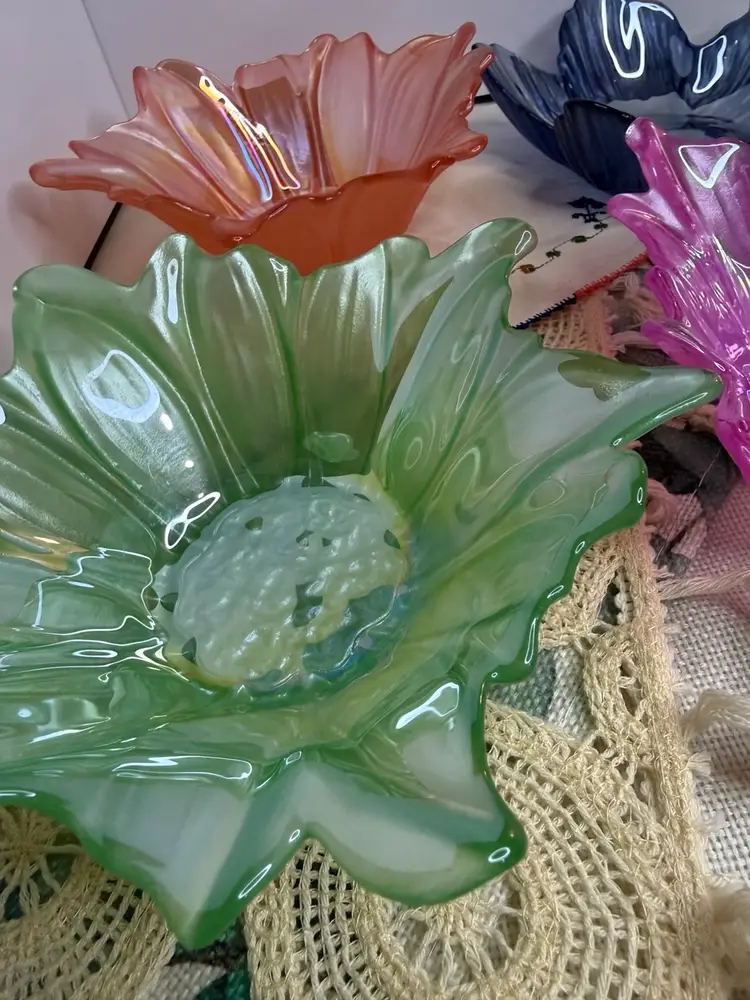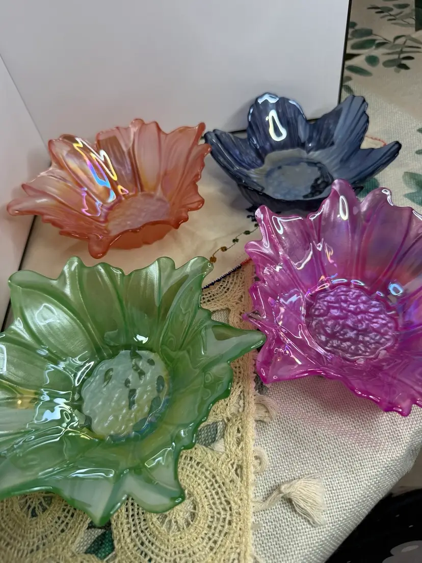 These flower glass plates are made in Turkey, and their color is vibrant and irisdescent. They can serve as candy dishes, or simply as attractive home decor.