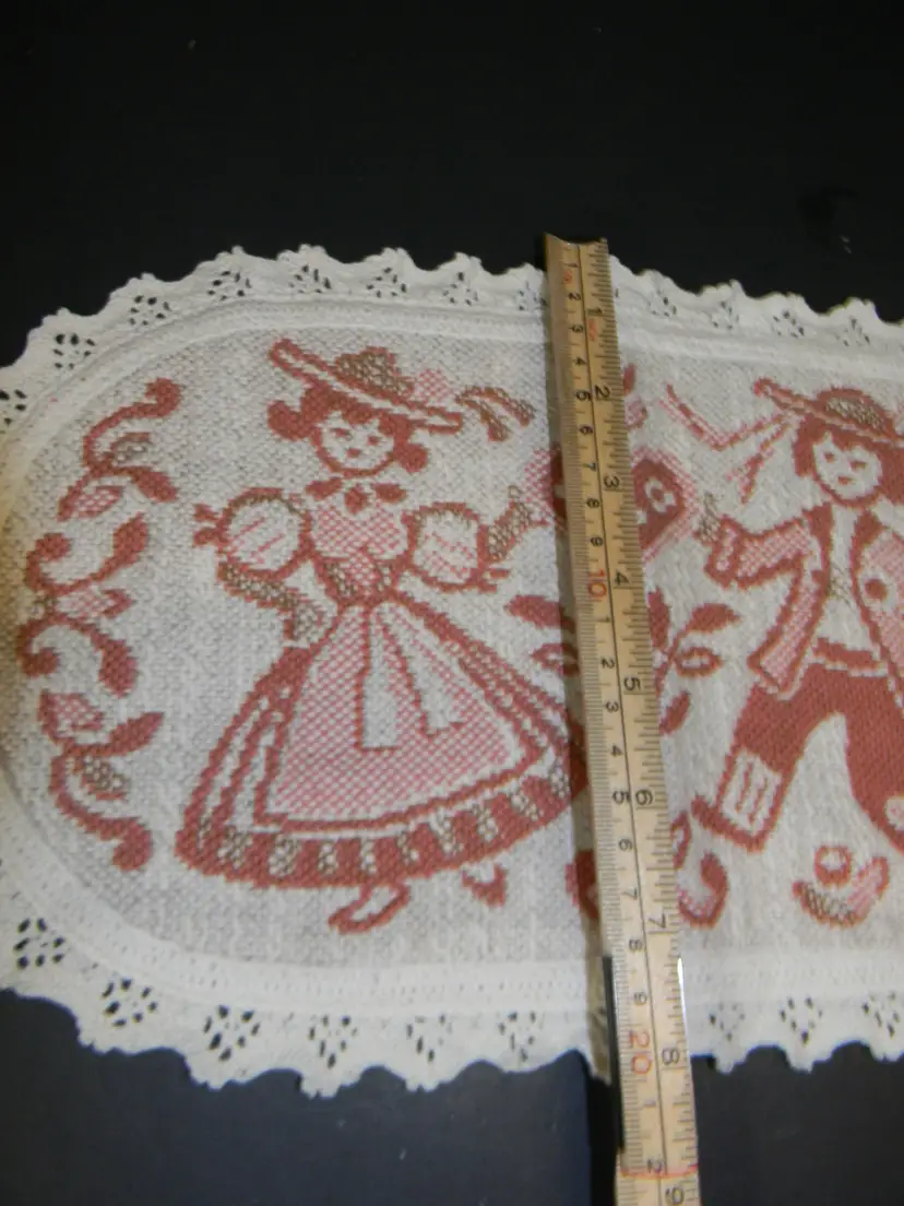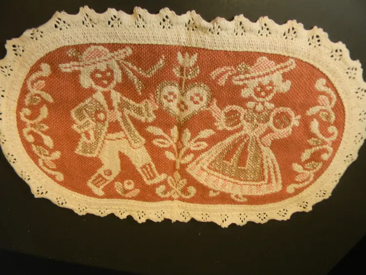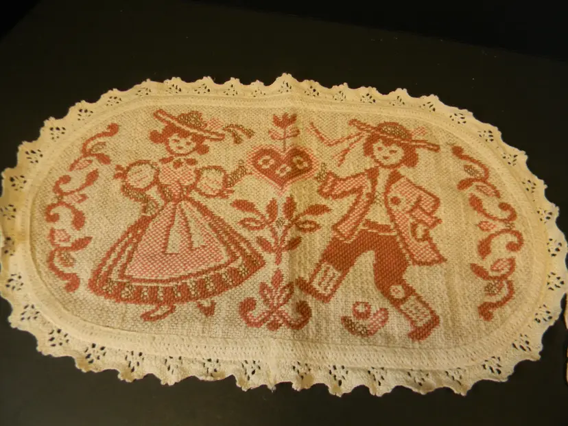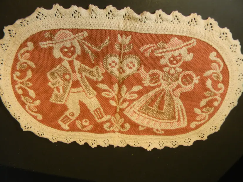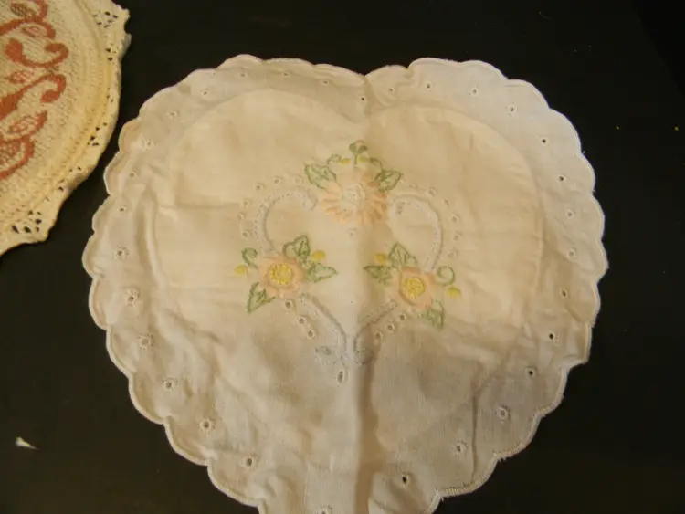 Valentine's day decorations white heart shaped hidden pocket folk-art lace with a man and woman dancing for the middle of the table or for and end table Very beautiful pieces