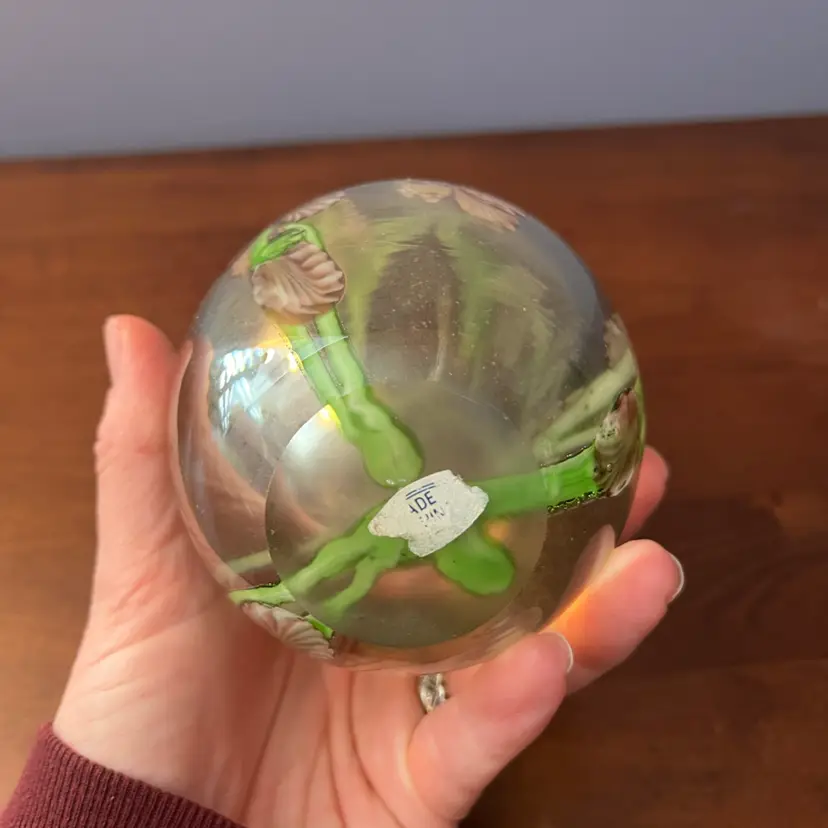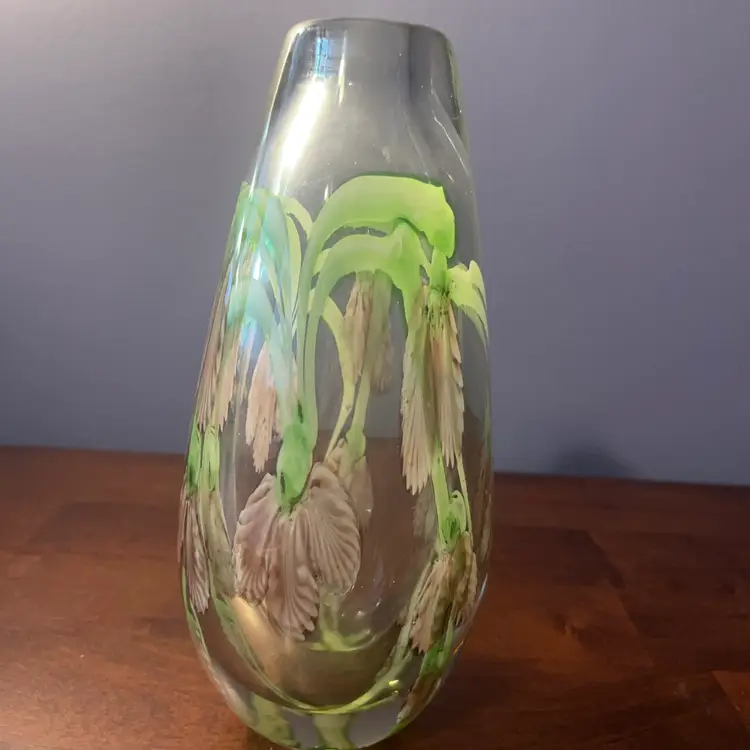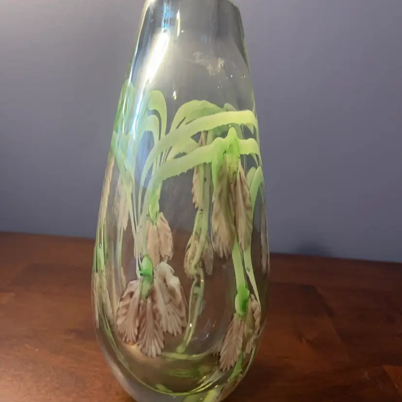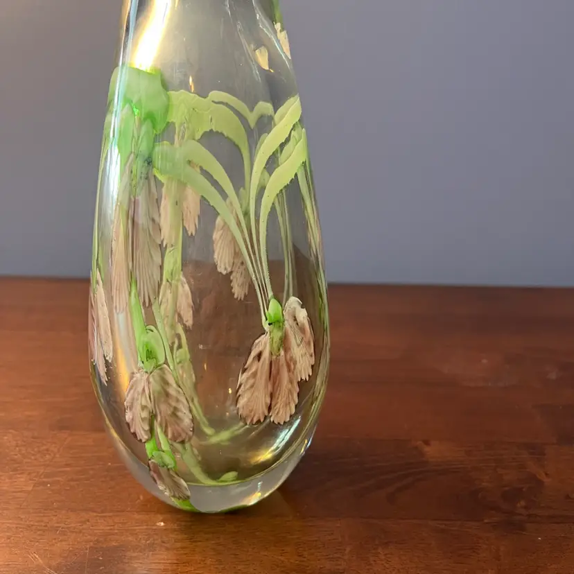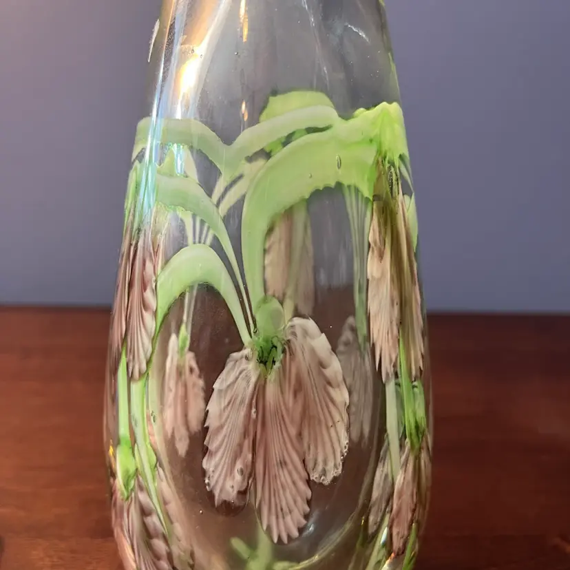 The object is a heavy art glass vase that encases an intricate floral motif- sweet pea vines. The floral vine is designed in meandering pattern that is artistically placed. The flowers are done in alternating vibrant pink and white, giving ait a beautiful three dimensionality. The pale green vine works well to link the flowers together in a graceful dance. The overall appearance shows a mastery of glass artistry.