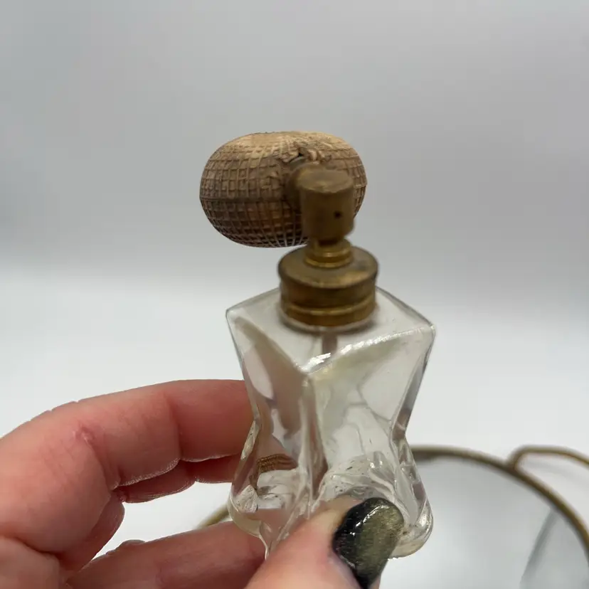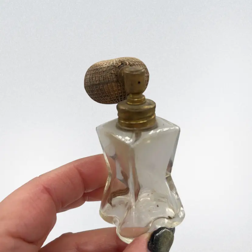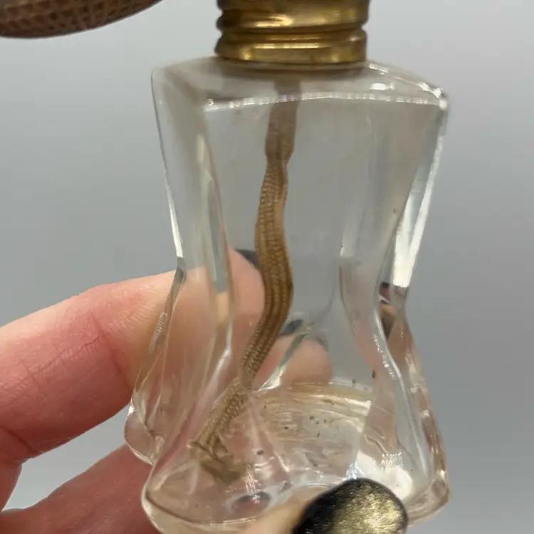 Estate find! Definitely shows patina and the age, but it is a beauty! Due to age and wear, leaving it as seen condition and for buyer to clean if they choose. I don’t suggest squeezing atomizer as it is hard and brittle, suggest for display piece only. Approx: 2.5” h x 1.25” w