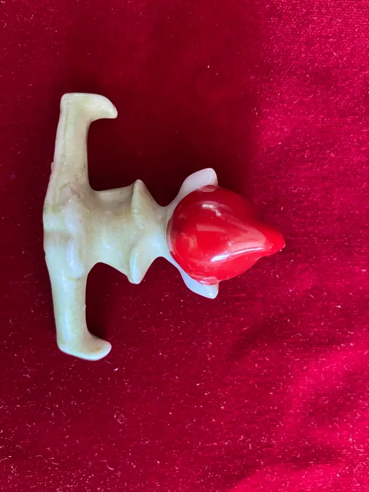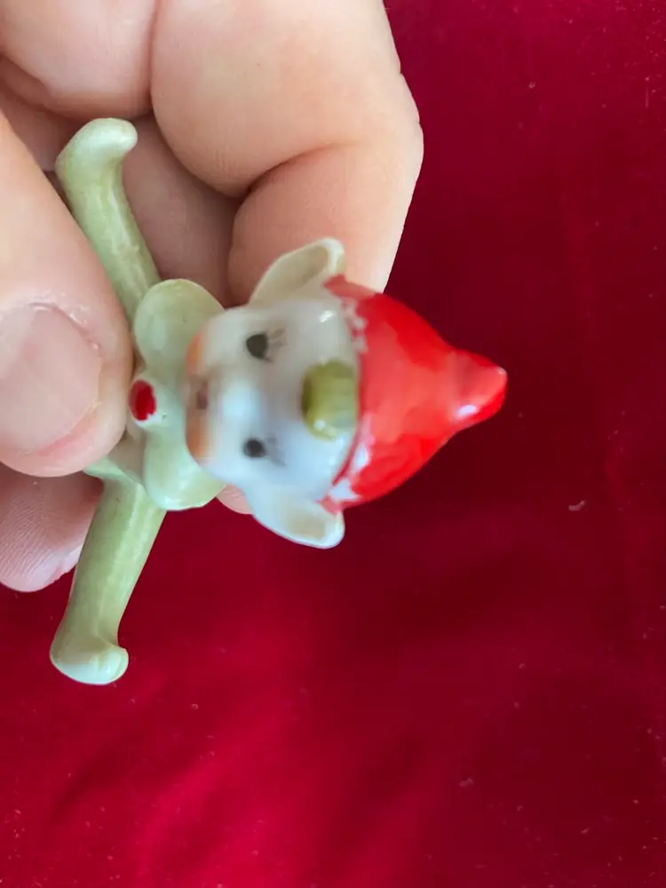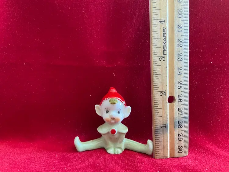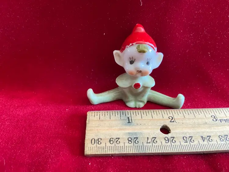 Vintage Japan Elf Pixie Figurine Red Hat Green Outfit Sitting Pose Cute. Slight paint wear on the hairline. From the 1950’s.