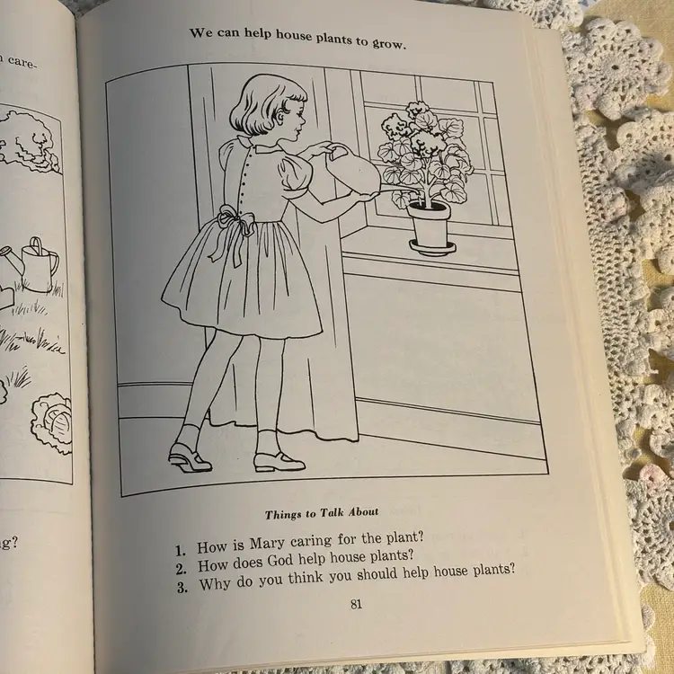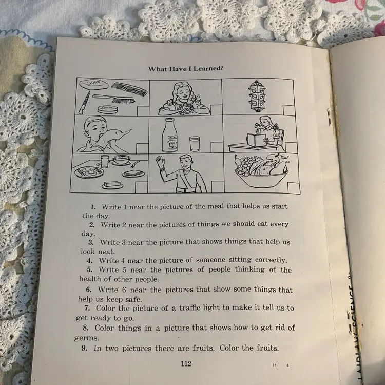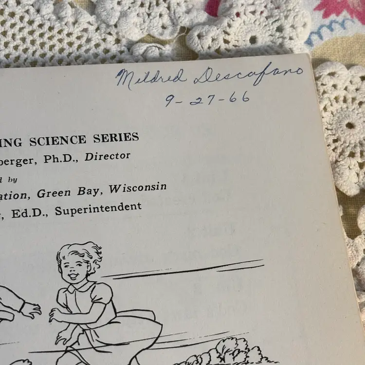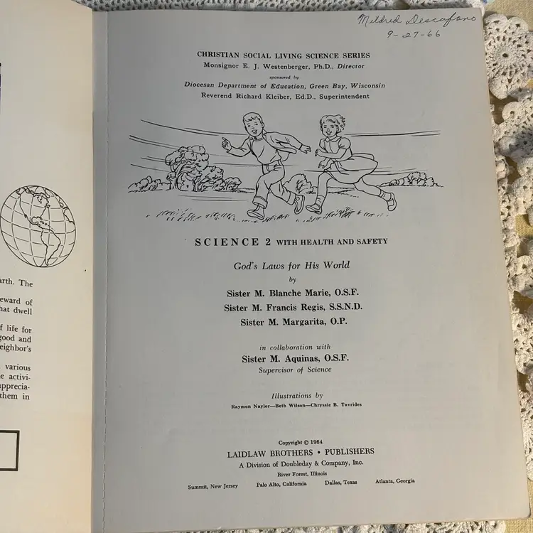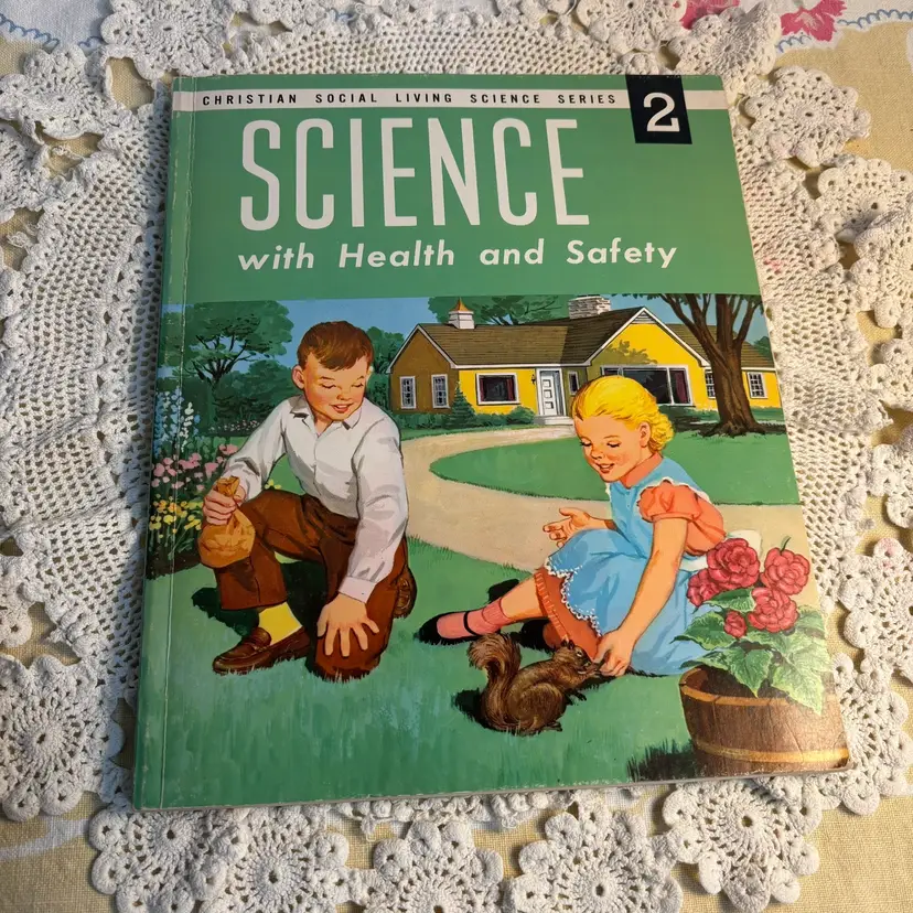 Great Graphics. 112 pages of pull out science with health and safety. Was a work book used as instructional purposes, assuming typical of using as homework. Has not been used and is in very good condition. Lots of lessons and experiments. Info about safety in the home. Cute and could be copied to keep the little ones occupied and learn also. Developed for the Christian Social Living Science Series, copyright 1964. This belonged to a student in 1966.
