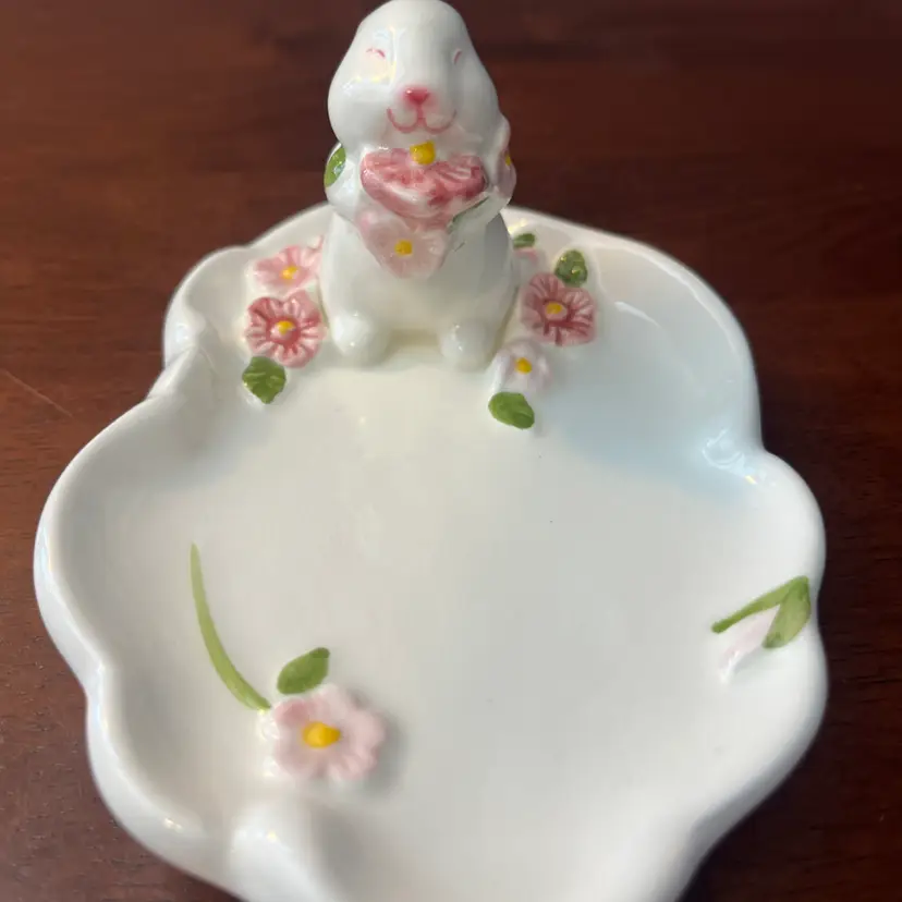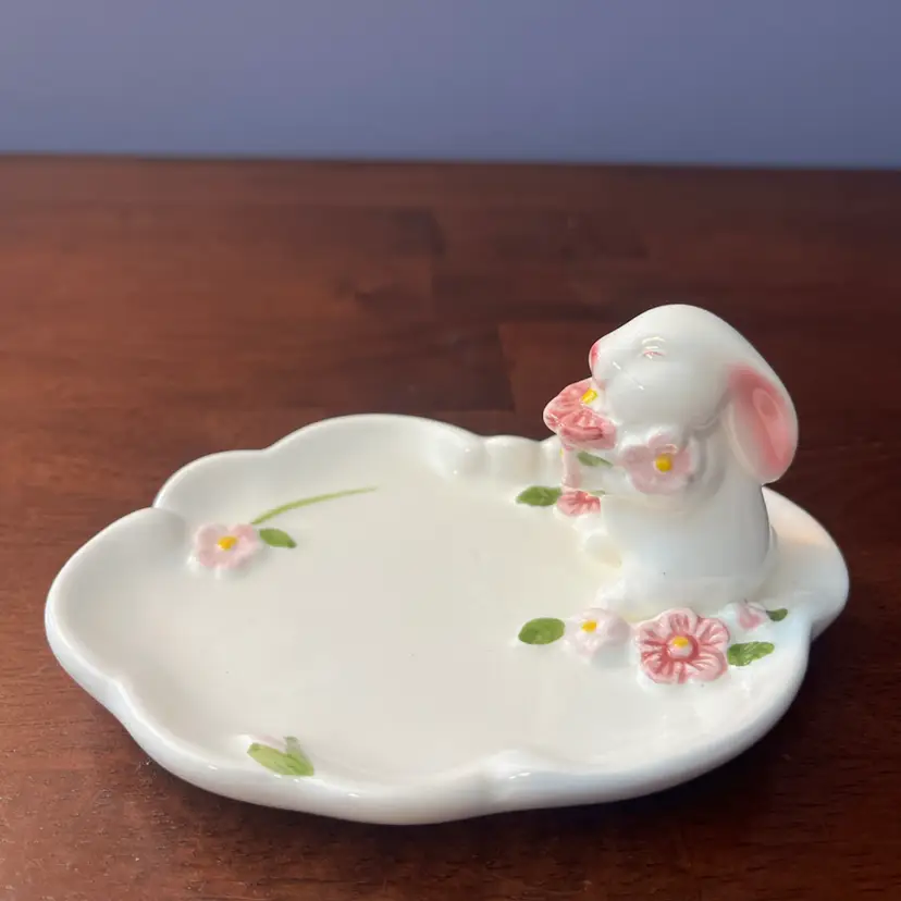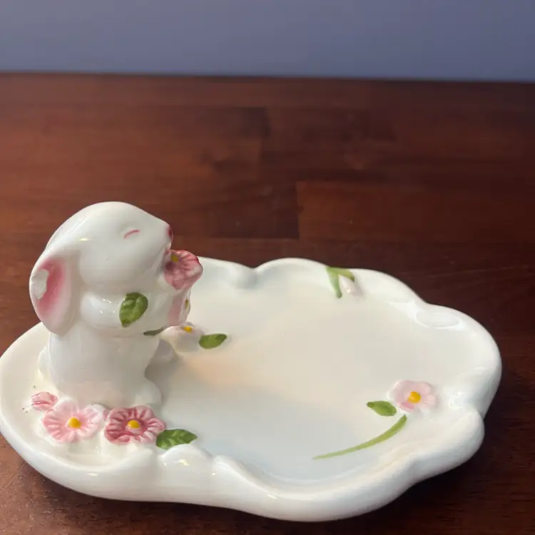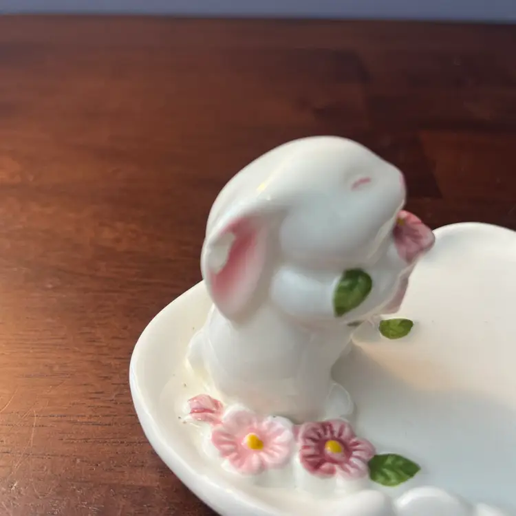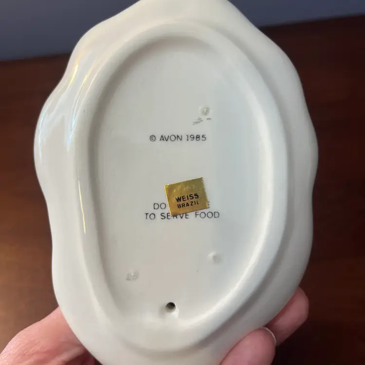 This particular trinket dish, dated 1985, falls within the peak era of Avon's collectible ceramic production. The bunny motif and floral embellishments are characteristic of the charming and often pastel-colored designs that appealed to collectors during that period. Such items were typically used for holding small jewelry or as decorative accents, embodying the decorative trends of the 1980s.