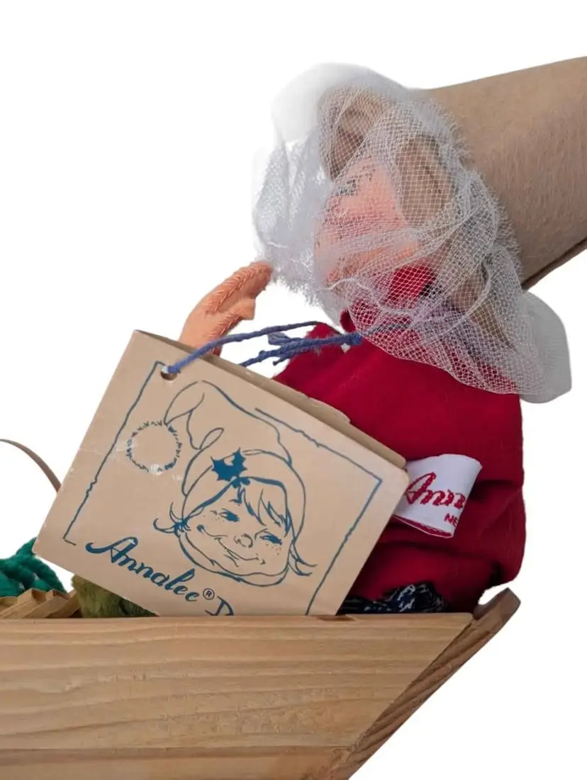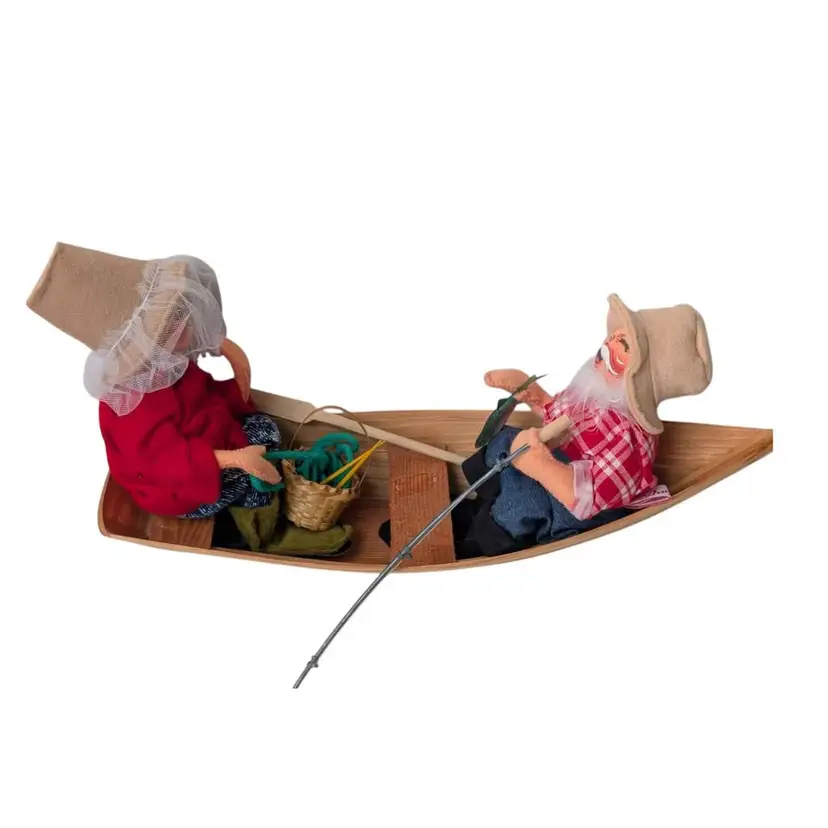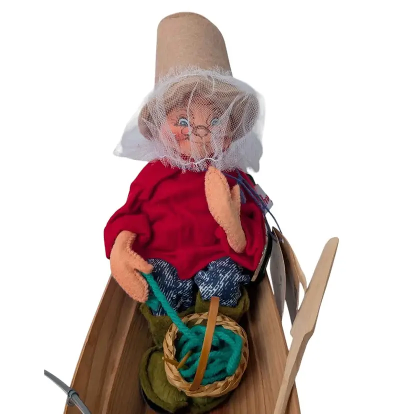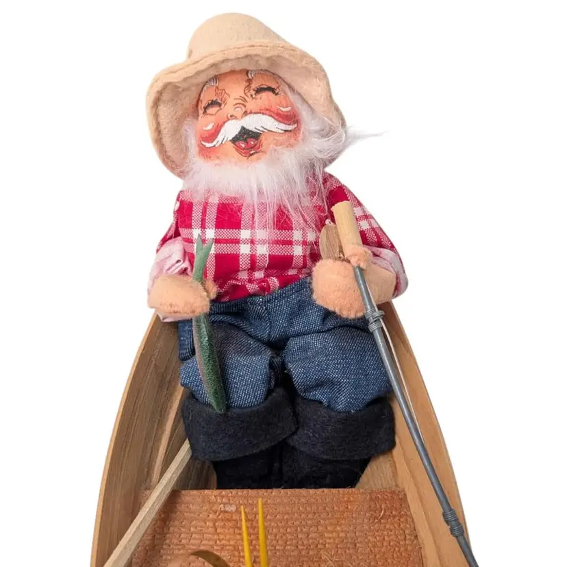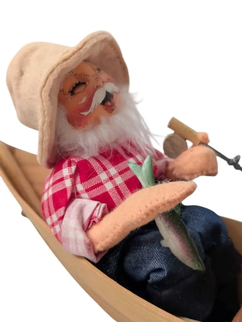 Vintage 1992 Annalee Mr. & Mrs. Claus fishing in a canoe w/tags. This is such a cute Annalee piece - Mr. & Mrs. Claus are sitting in a wooden canoe and Mr. Claus has a fish in one hand and a rod in the other. There is also an oar nearby. Mrs. Claus has her mosquito net on and a knitting basket in front of her. Both have tags on the dolls dated 1992 and the original hangtag is attached as well. I do believe there used to be some items glued to the middle wooden seat but they are missing. Mrs. Claus sits a little to one side - may need some regluing on one side of her bottom to sit up straight. This piece measures about 14" in length and the dolls sit about 7" tall. Great addition to any Annalee collection or perfect for a cabin or lake house!