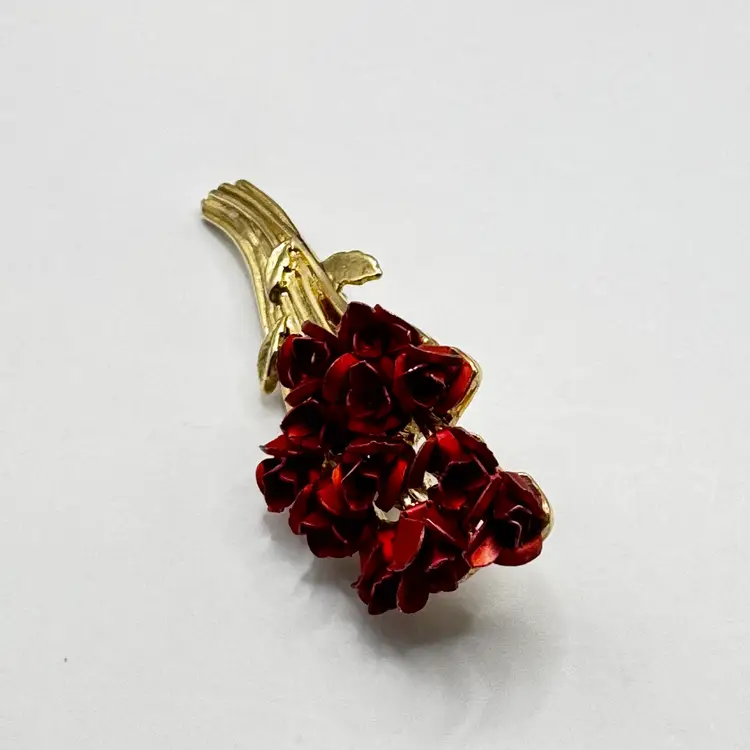 Add a pop of color to your outfit with this vintage red enamel floral brooch. Featuring vibrant red flowers and elegant gold-tone stems, this piece is perfect for any occasion. In excellent condition with a secure clasp. Measures 1”x2.25”. Weighs 2oz.
