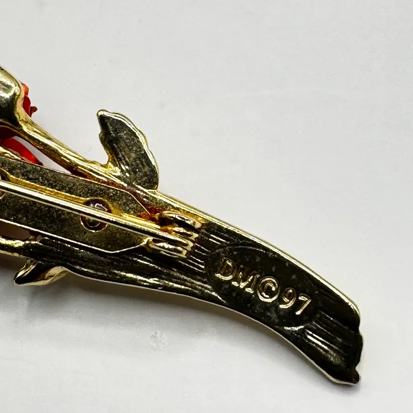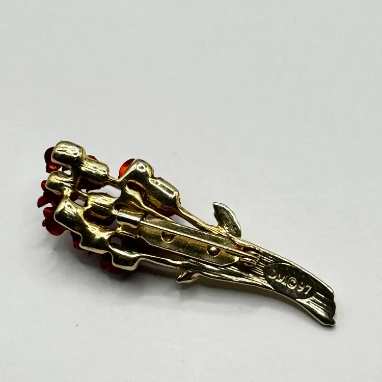 Vintage 1997 Red Enamel Floral Brooch with Gold-Tone Stems, Stamped by David Monn, Made in New York