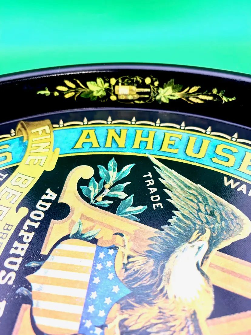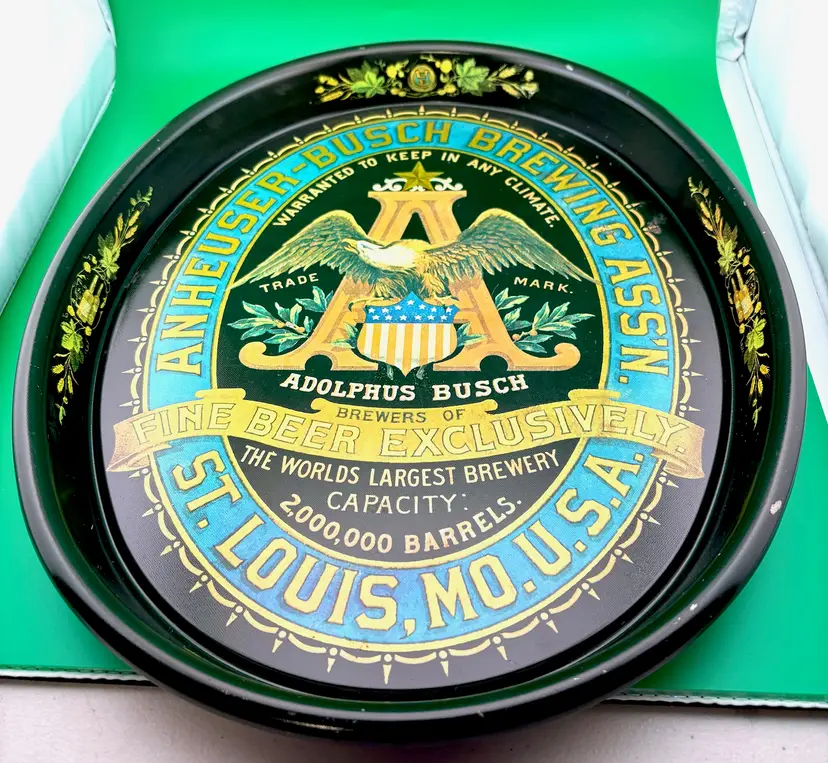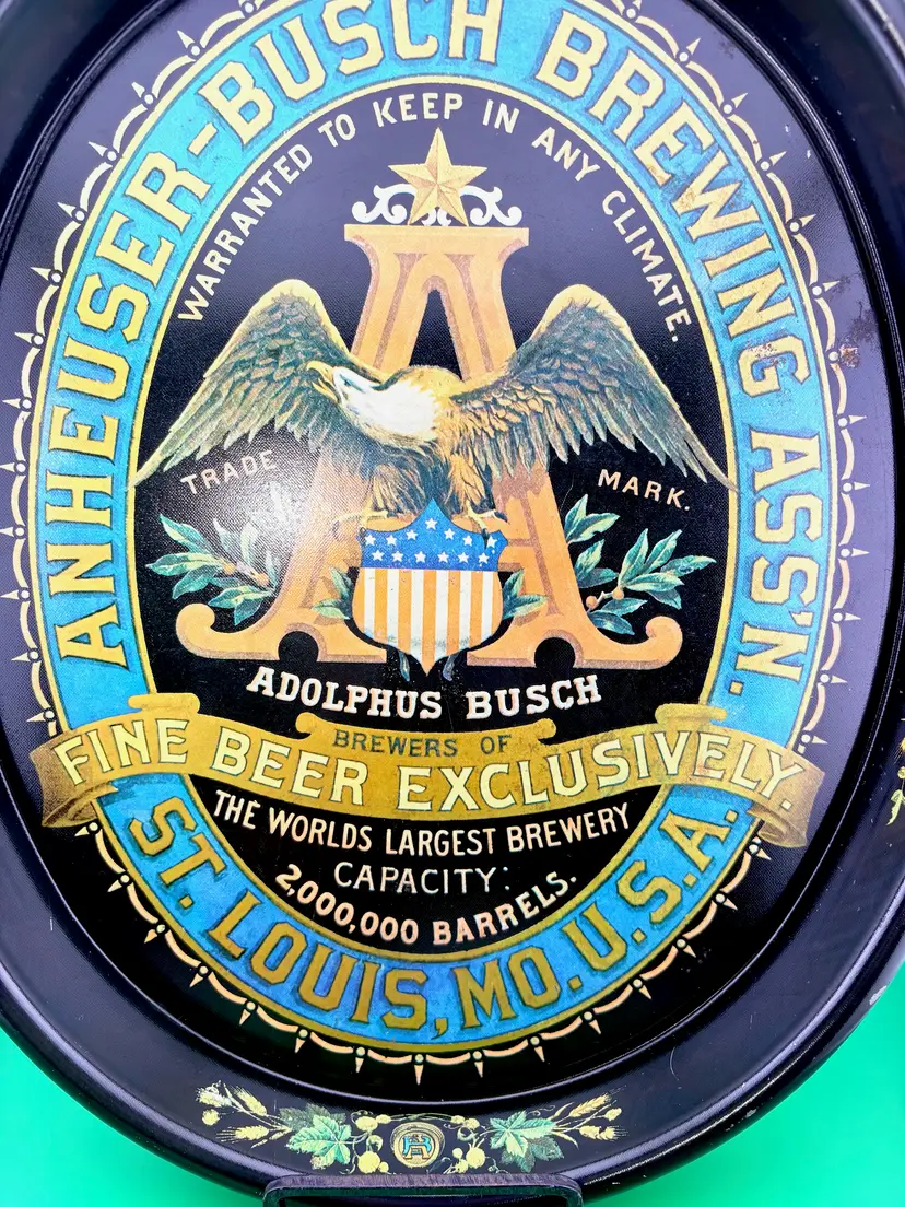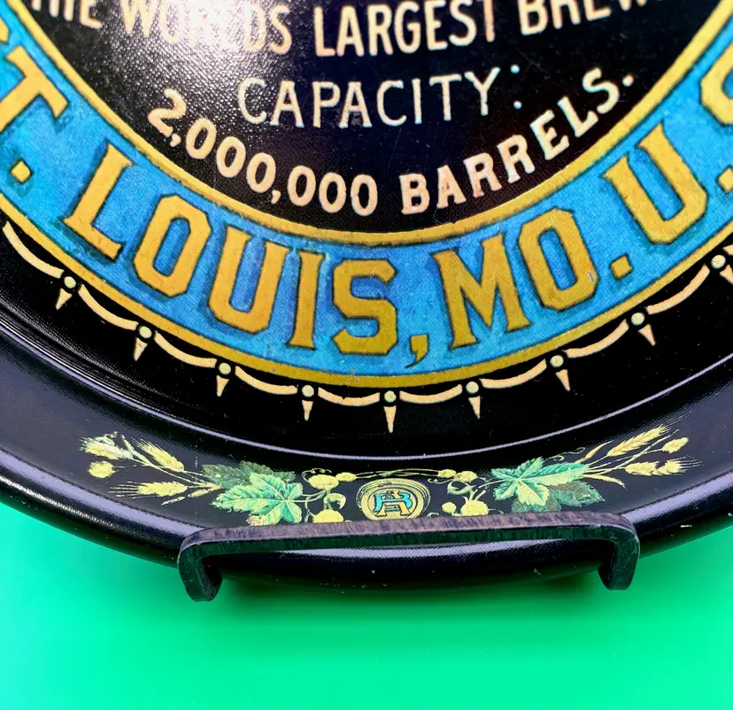 This tray has an eagle and the Capital A on it. It also has St. Louis, MO USA on it. It is a great piece for the Budweiser lover. There are a few scuffs on it. It measures 14" long x 12" wide.