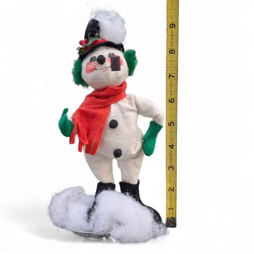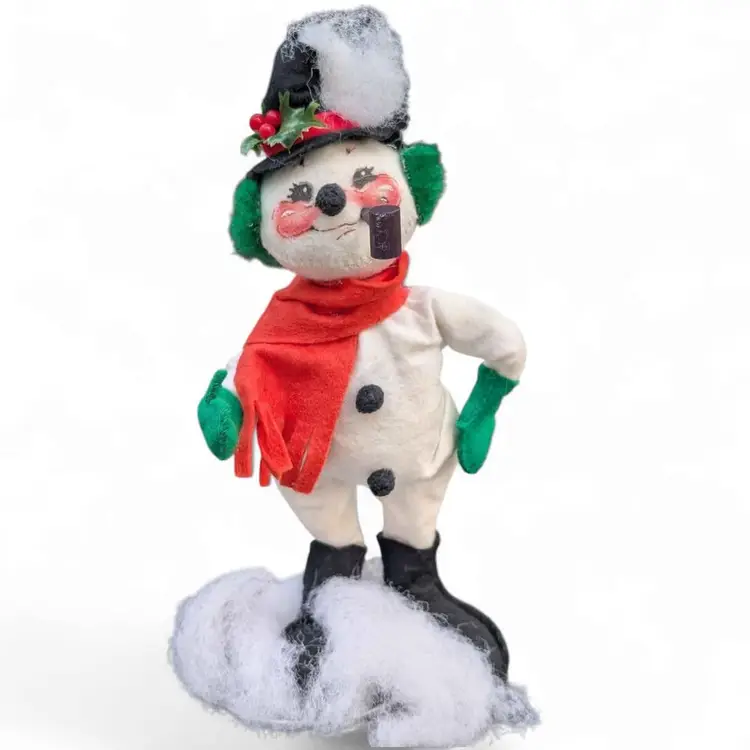 Vintage Annalee 1982 Snowman W/ Pipe + Green Earmuffs - Great Condition. This adorable Annalee snowman would make a wonderful addition to any collection! He's in great shape and is wearing green mittens and earmuffs as well as a red scarf and top hat. He has a pipe in his mouth and the cutest kitschy face! There is no tag on this but based on his stand I'm guessing this is from 1982. Measurements are in the photos.