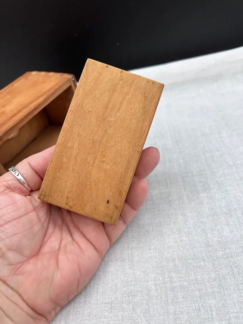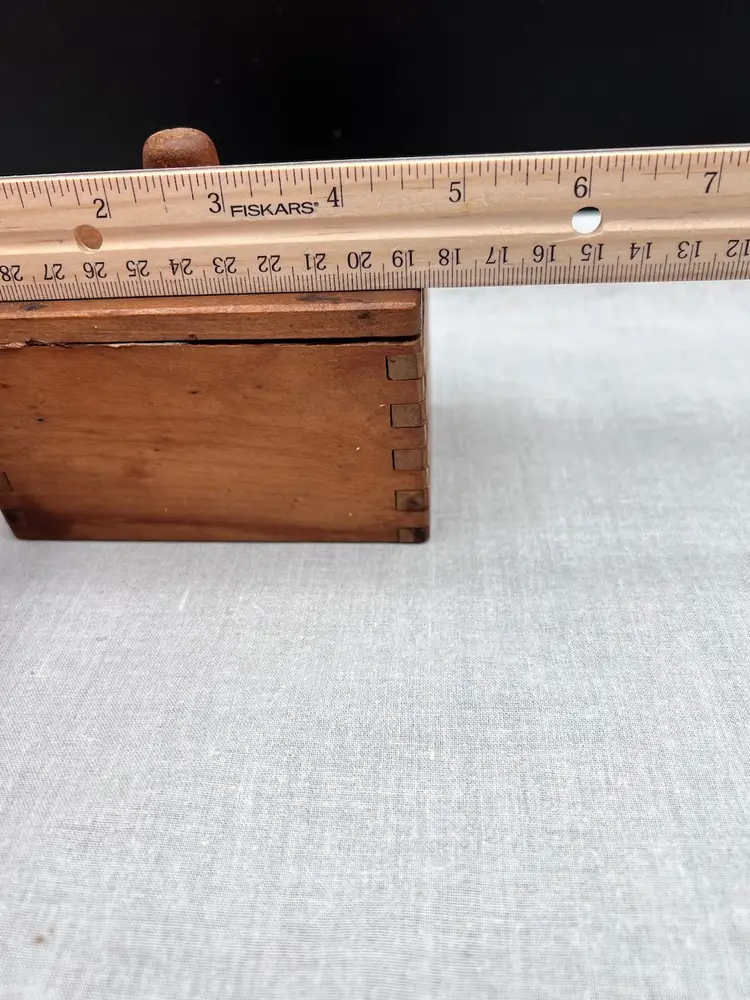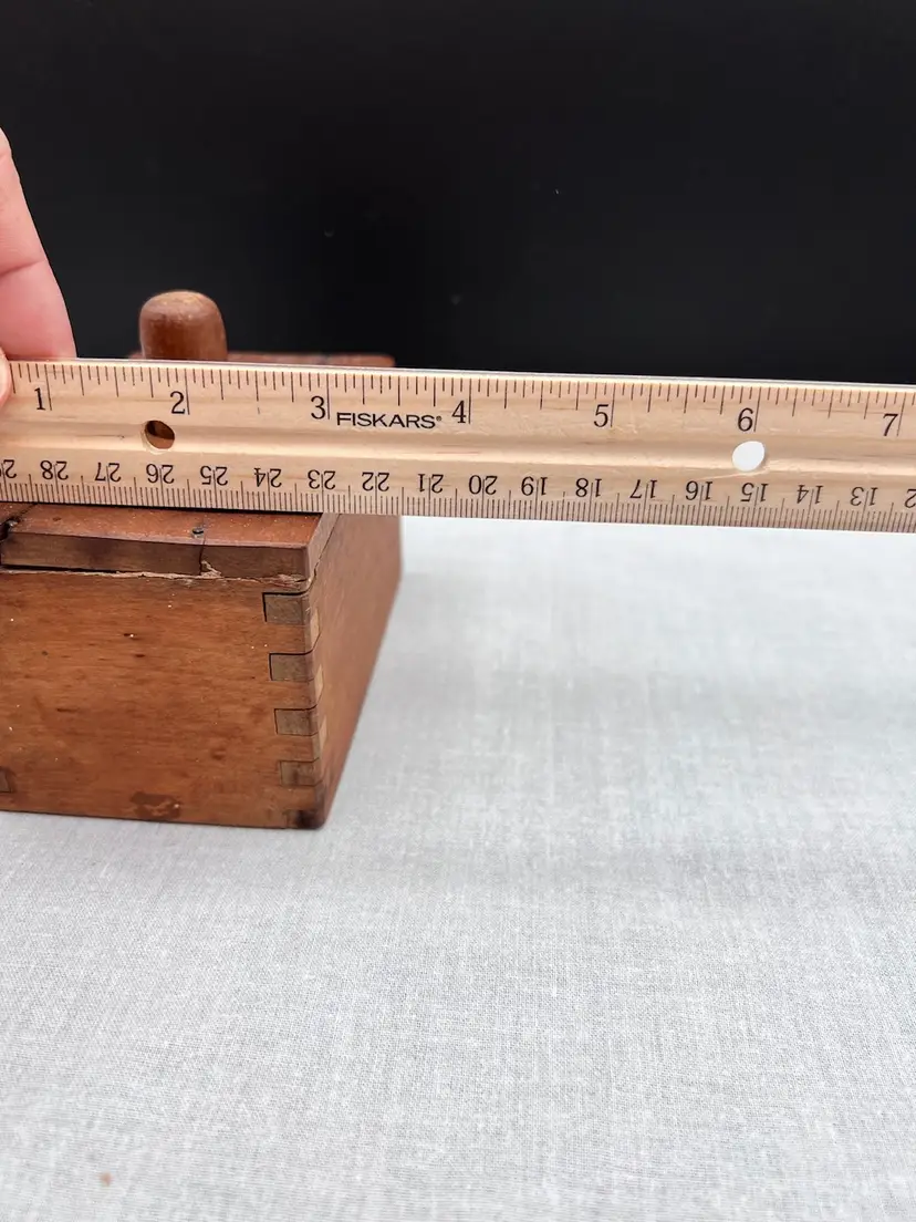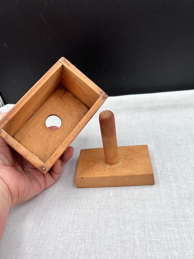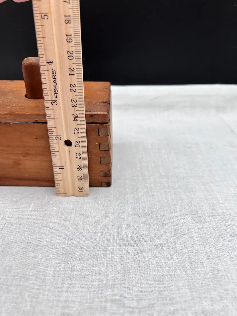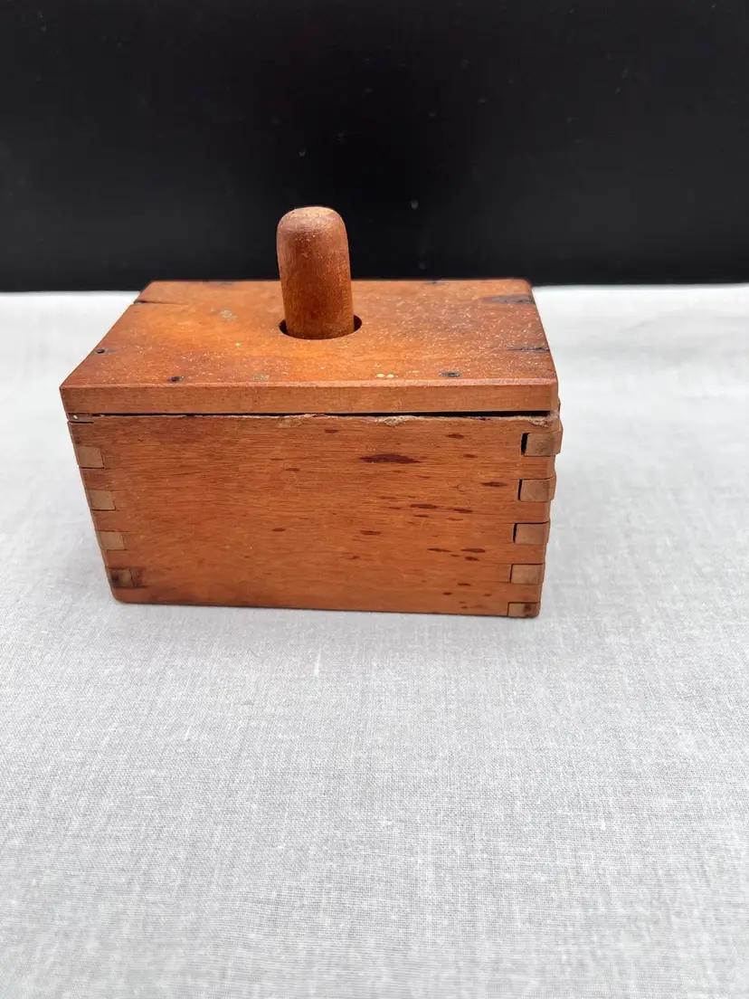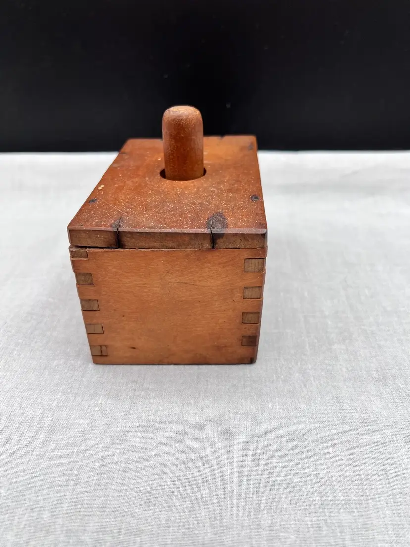 Vintage/antique primitive rectangular wooden butter mold with dovetail corners and plain pressboard 4" tall including handle x 4 3/4" x 3"