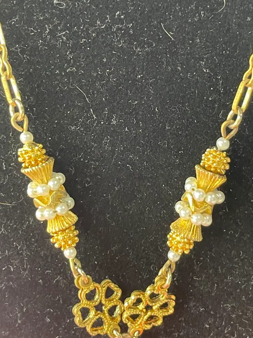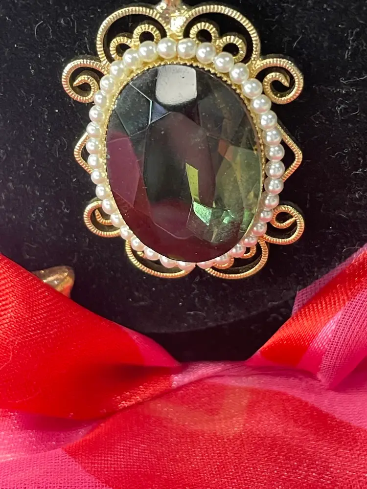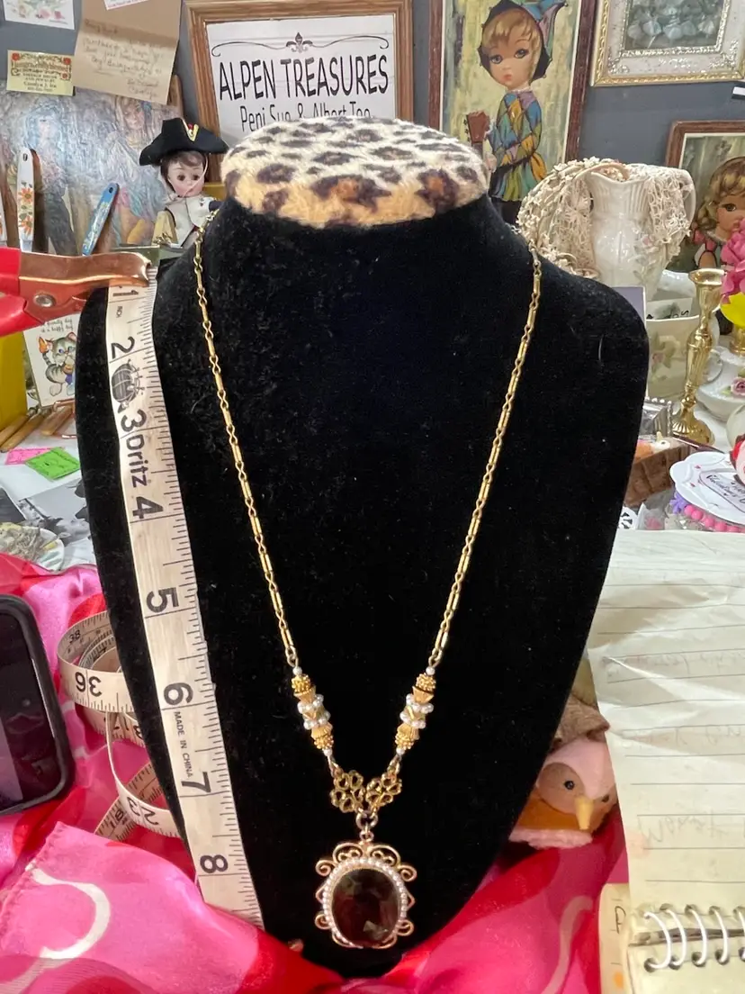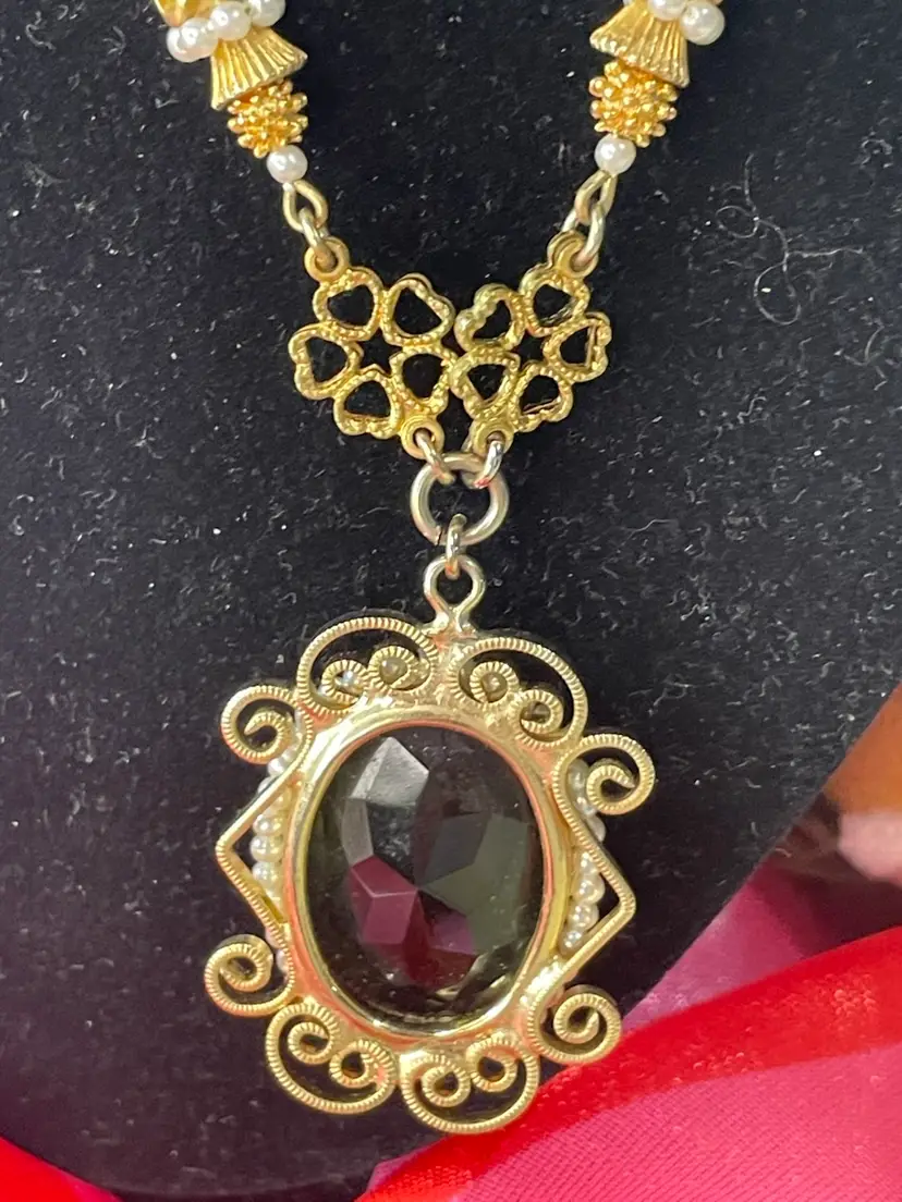 Large jeweled pendant with tiny faux peals on gold tone chain