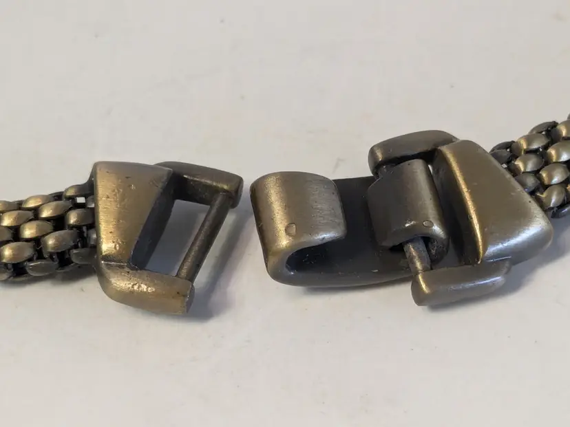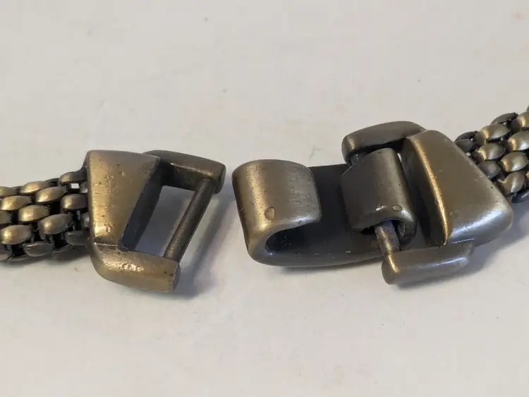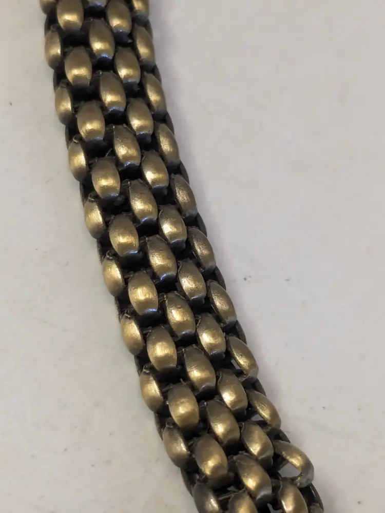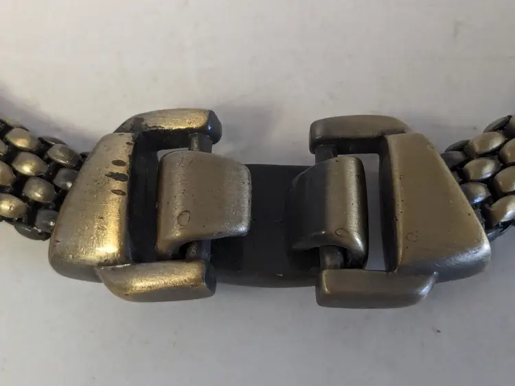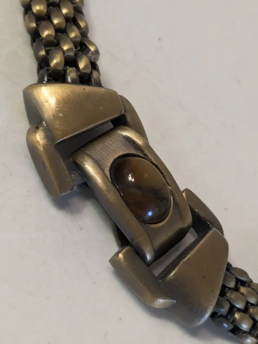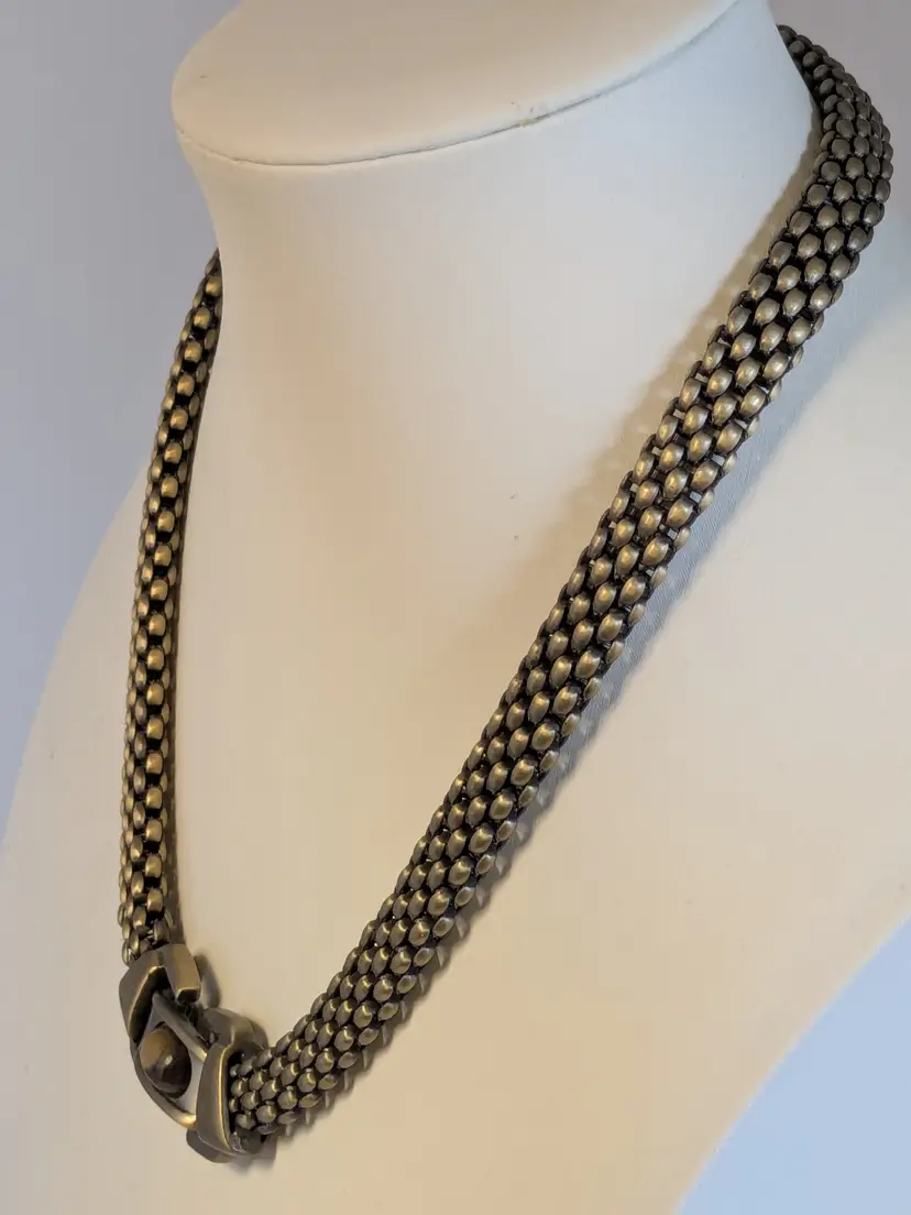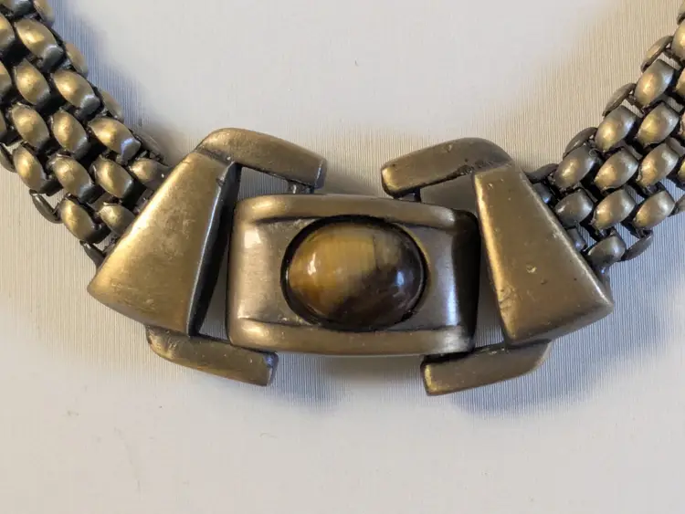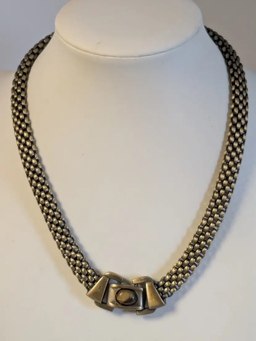 Good condition. Necklace features a textured mesh chain with a distinctive stone clasp. Measures 17" and 3/8" wide. wen