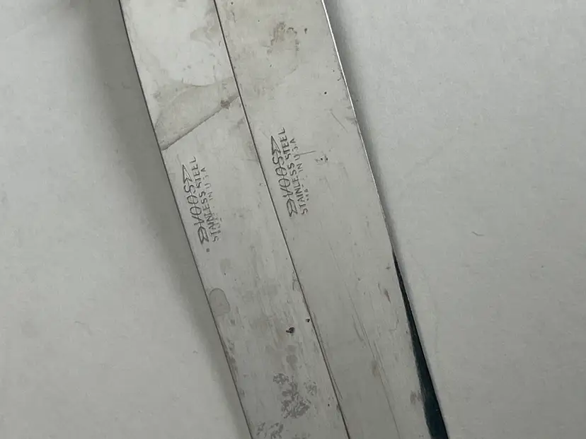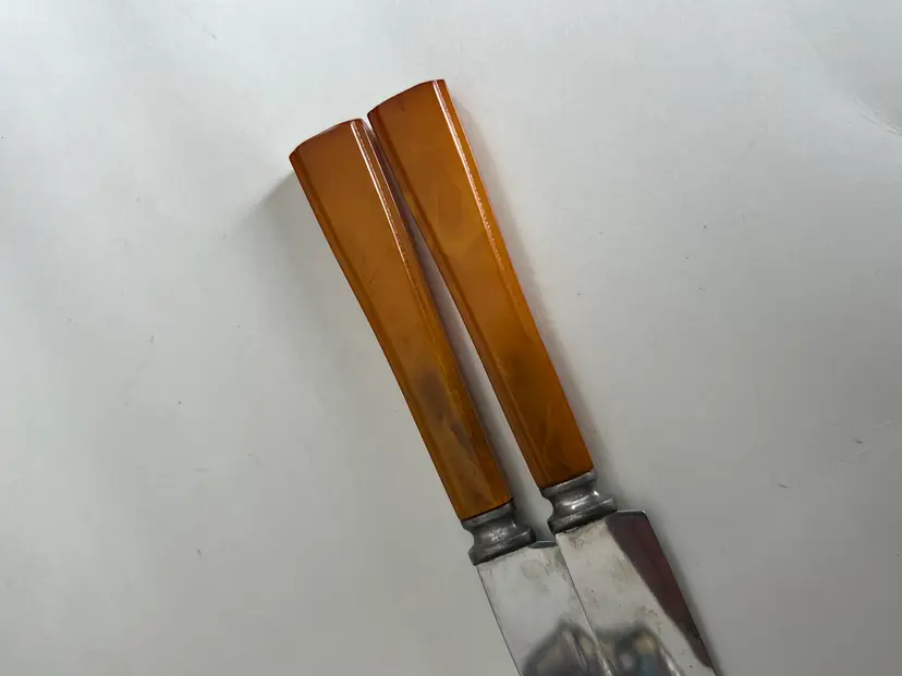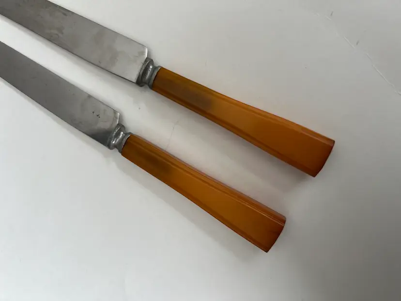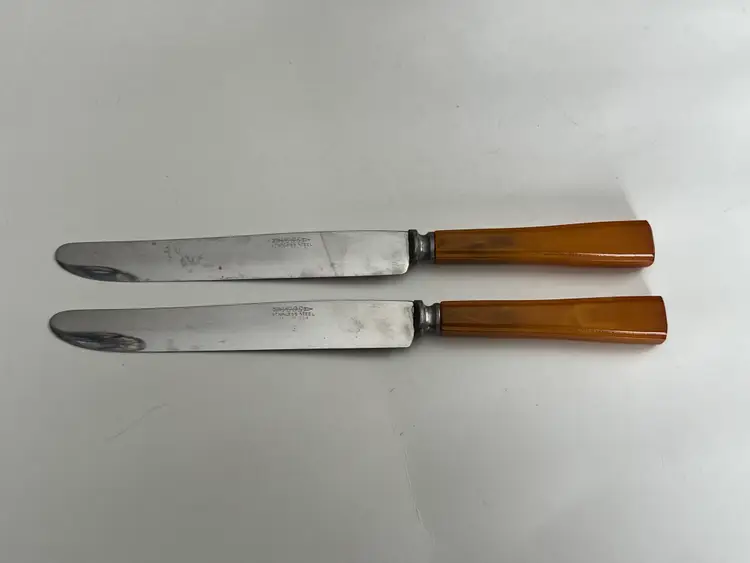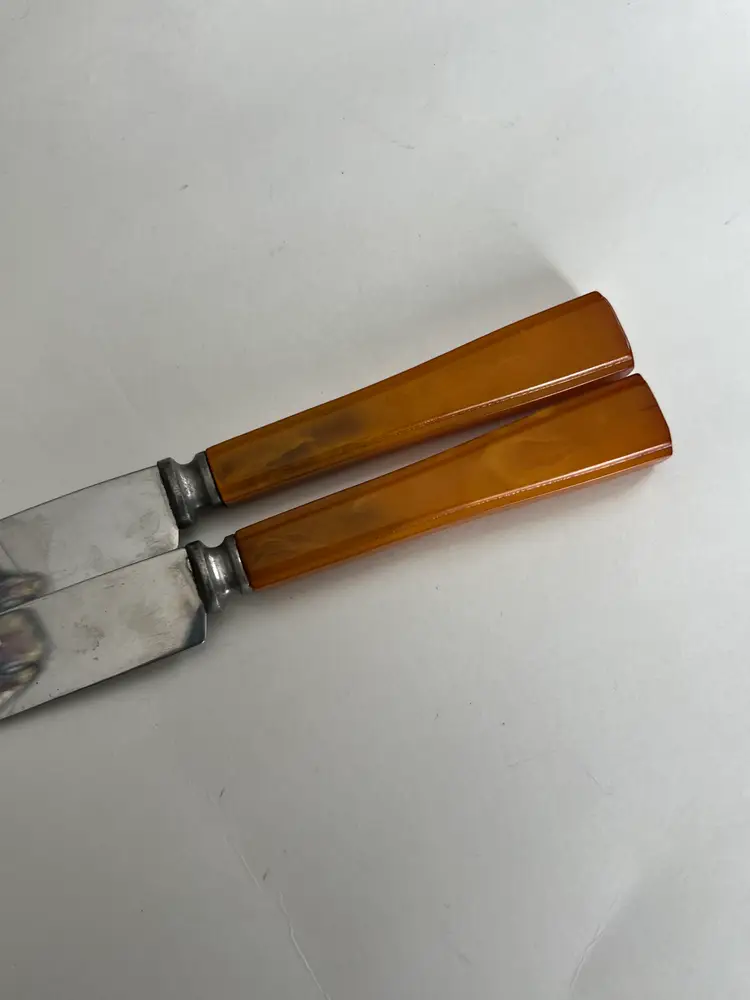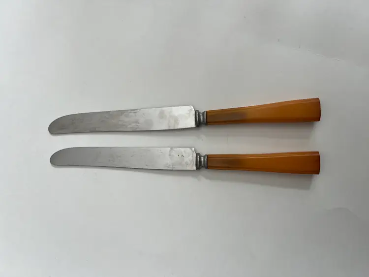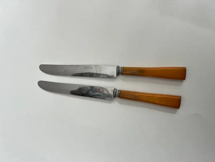 Pair of Voos table knives with butterscotch bakelite handles. Stainless blades. Made in USA Good vintage condition