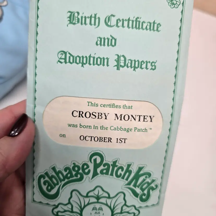 Vintage Cabbage Patch Kid Doll Green spot on back of head Otherwise in great pre-owned condition Crosby Montey on adoption papers