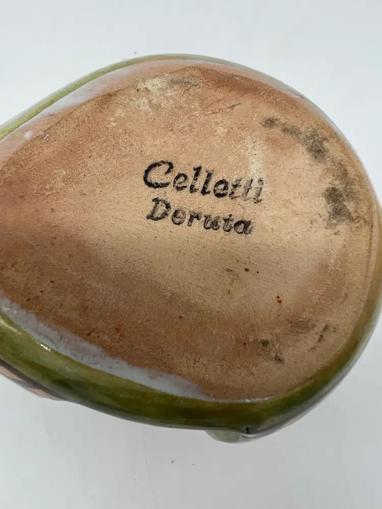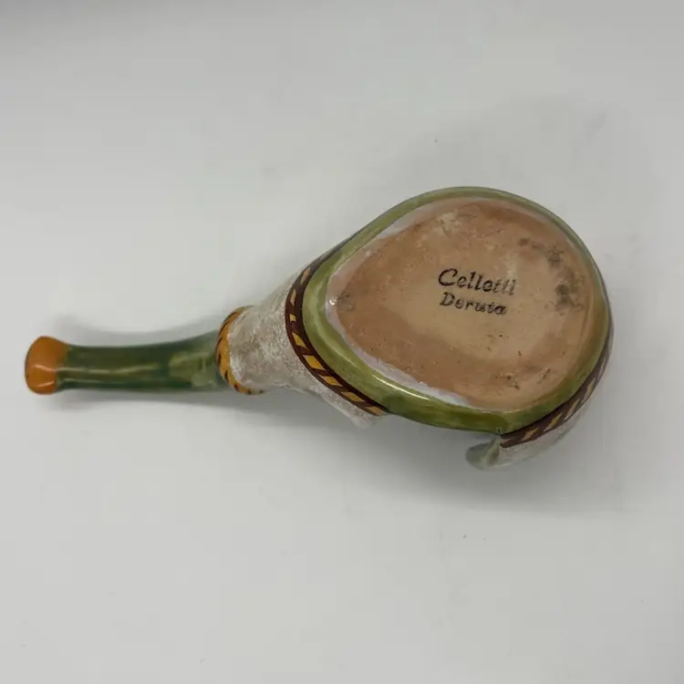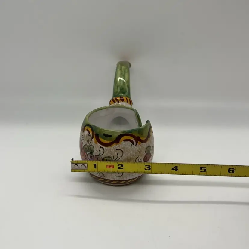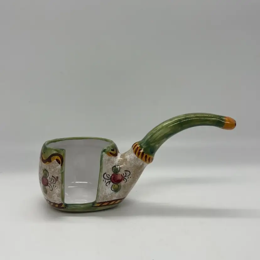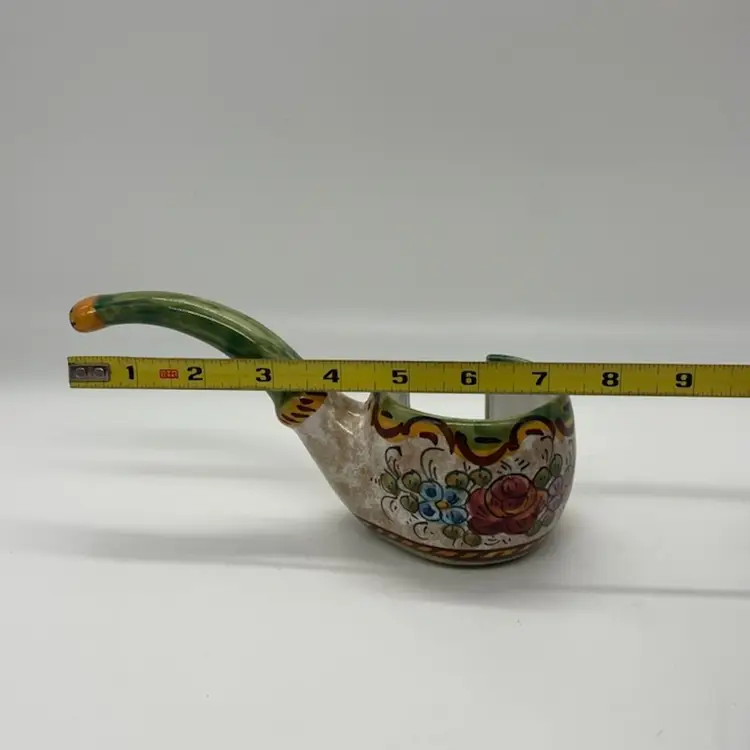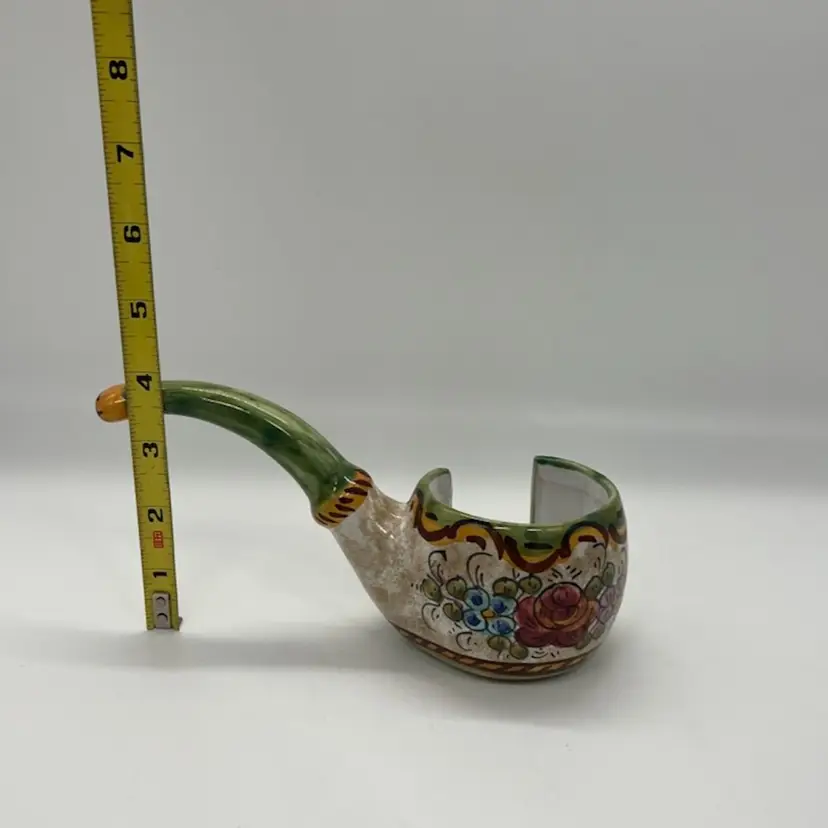 This vintage Celletti Deruta figural pipe ashtray holder from Italy is a unique and handmade piece of pottery. Made of clay in a brown majolica style, this piece features intricate floral designs and measures 7.5 inches in length, 3.75 inches in height, and 3 inches in width. It is a charming and functional addition to any collection or decor, perfect for adding a touch of vintage elegance to any space. I believe it would have held 4 individual ashtrays. It could be repurposed as a candle holder, planter, sponge holder, or anything really. Excellent condition. No chips or cracks.