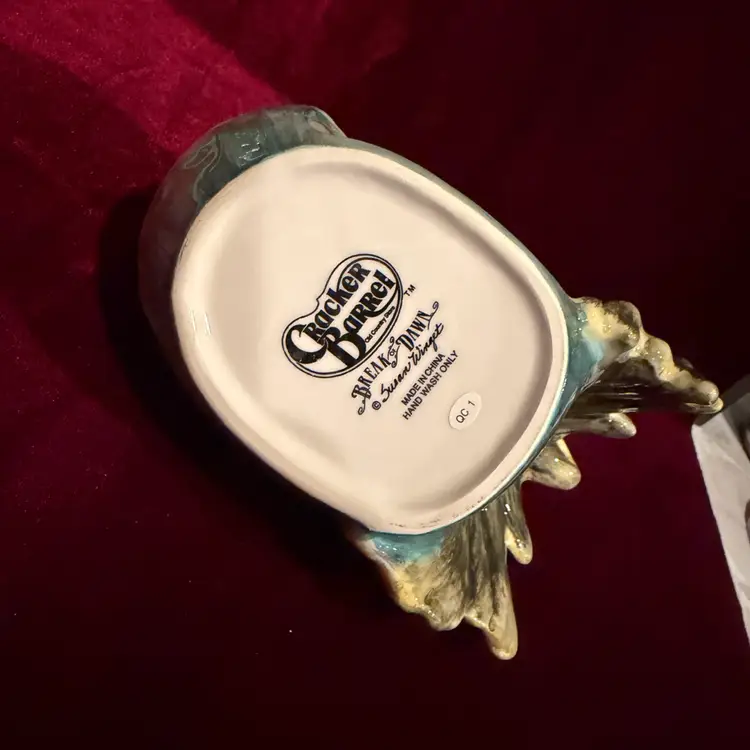 Vintage, ceramic Cracker Barrel Susan Winget Break of Dawn Rooster Sponge Scrubby Holder figure. The holder is designed to keep a scrubby, sponge, or bar of soap easily accessible. The item measures approximately 5.625" x 3.50" x 4.75".