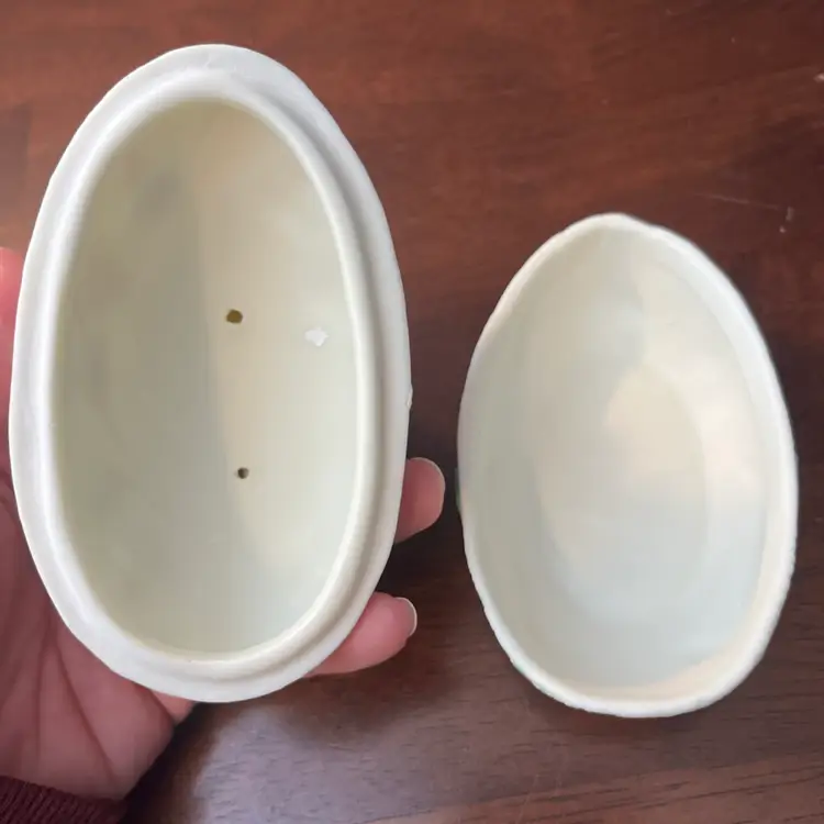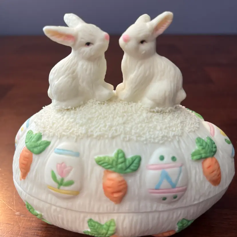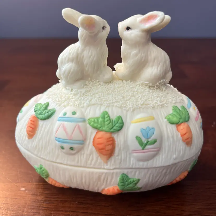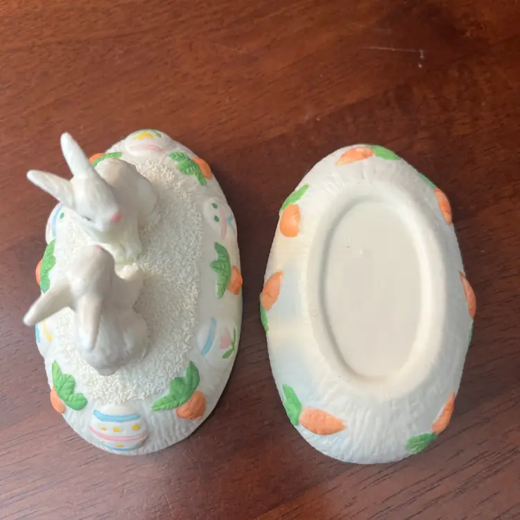 Ceramic trinket boxes, especially those with whimsical or seasonal themes like Easter, became popular decorative items throughout the latter half of the 20th century. These pieces often served as charming storage for small items and were widely produced by various manufacturers for mass market appeal. Their appeal often lies in their decorative qualities and nostalgic association with holidays.