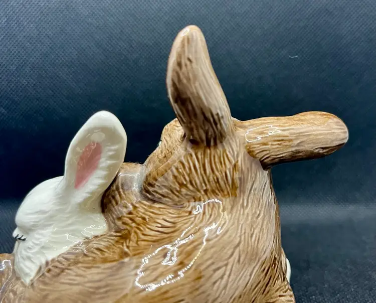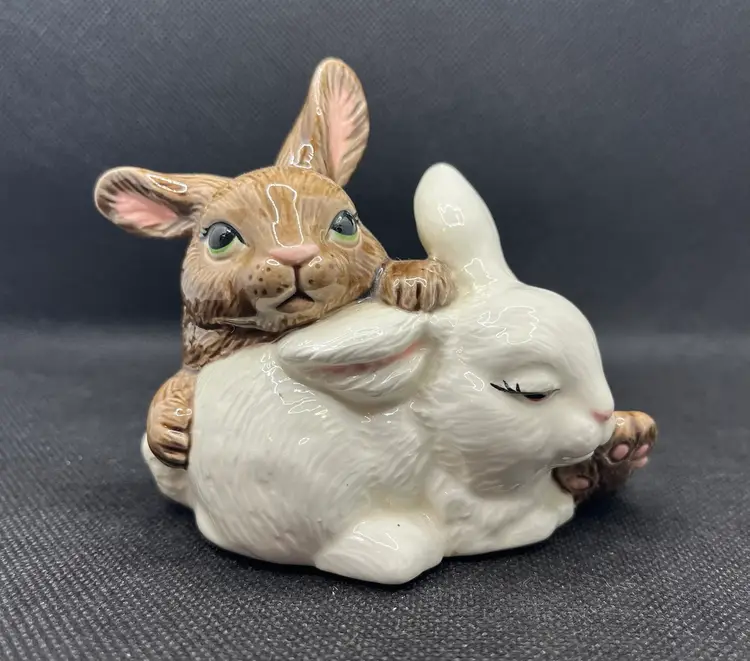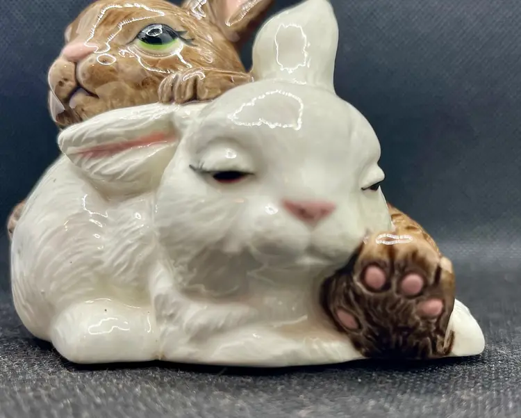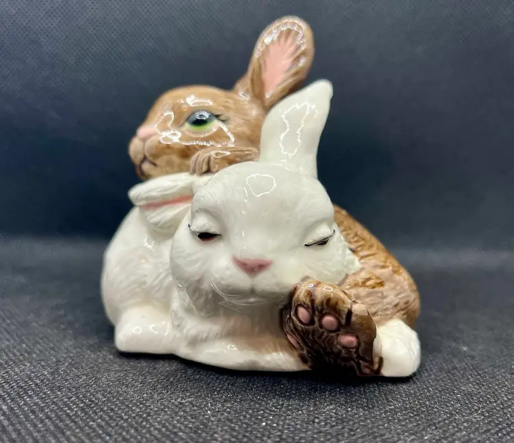 Vintage Ceramic Hand Painted Snuggling Bunnies Figurine Easter Decor , Bunny Rabbits
