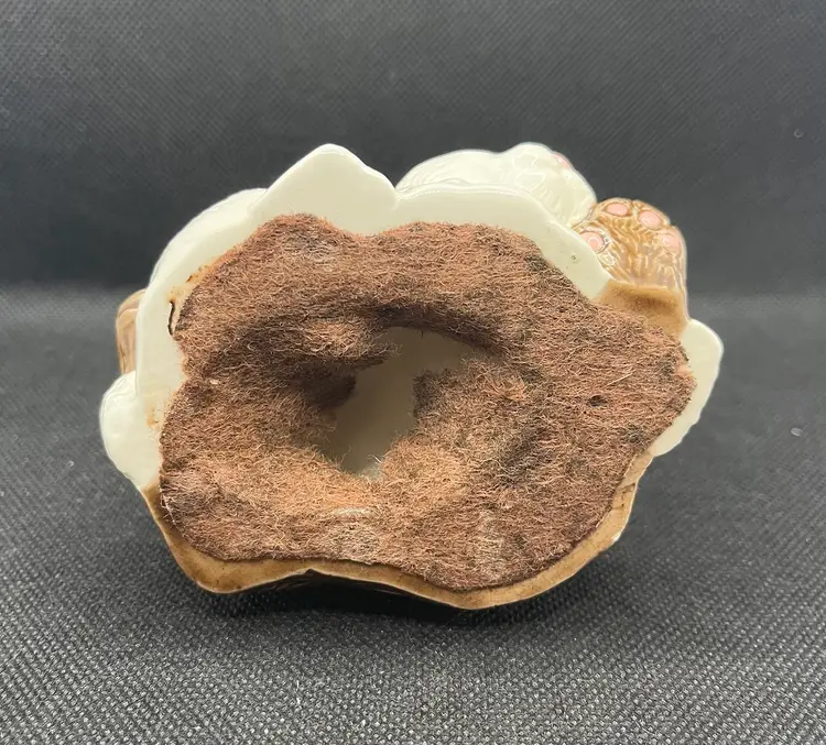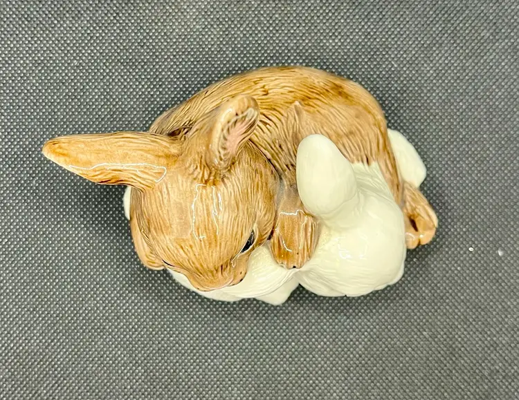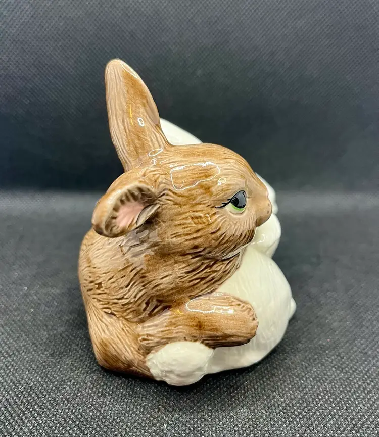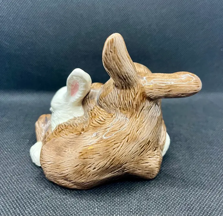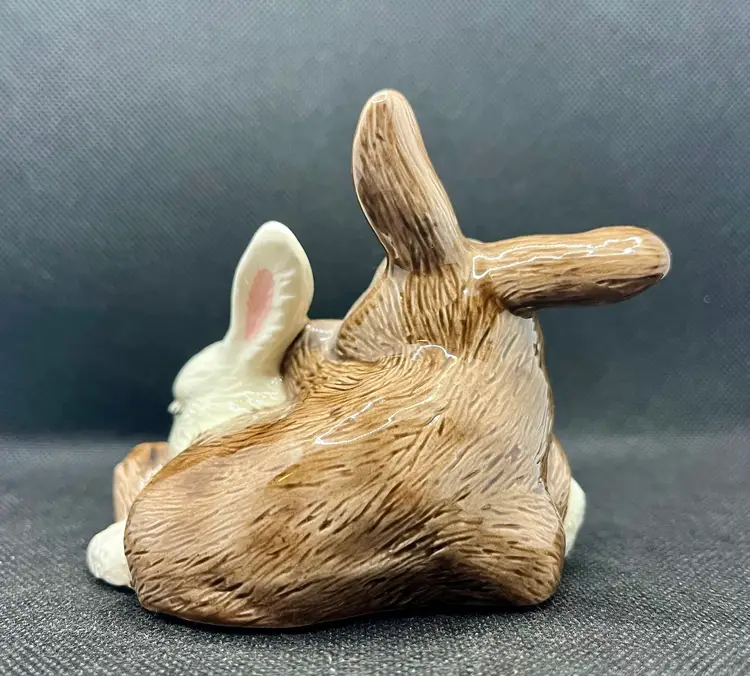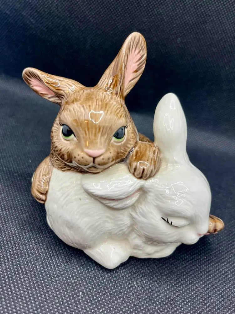 This is a vintage ceramic bunny rabbit figurine, featuring two rabbits snuggling together, one brown and one white. Approximately 4” x 4” with minor surface wear or crazing. Damaged felt on the bottom. See photos.