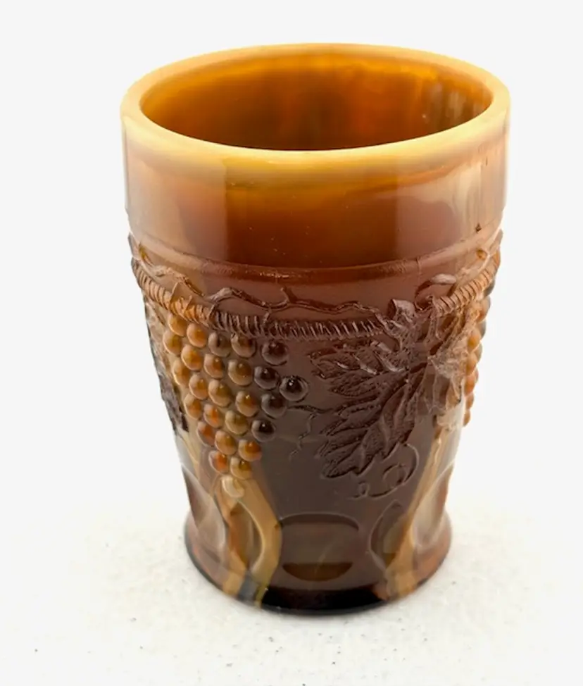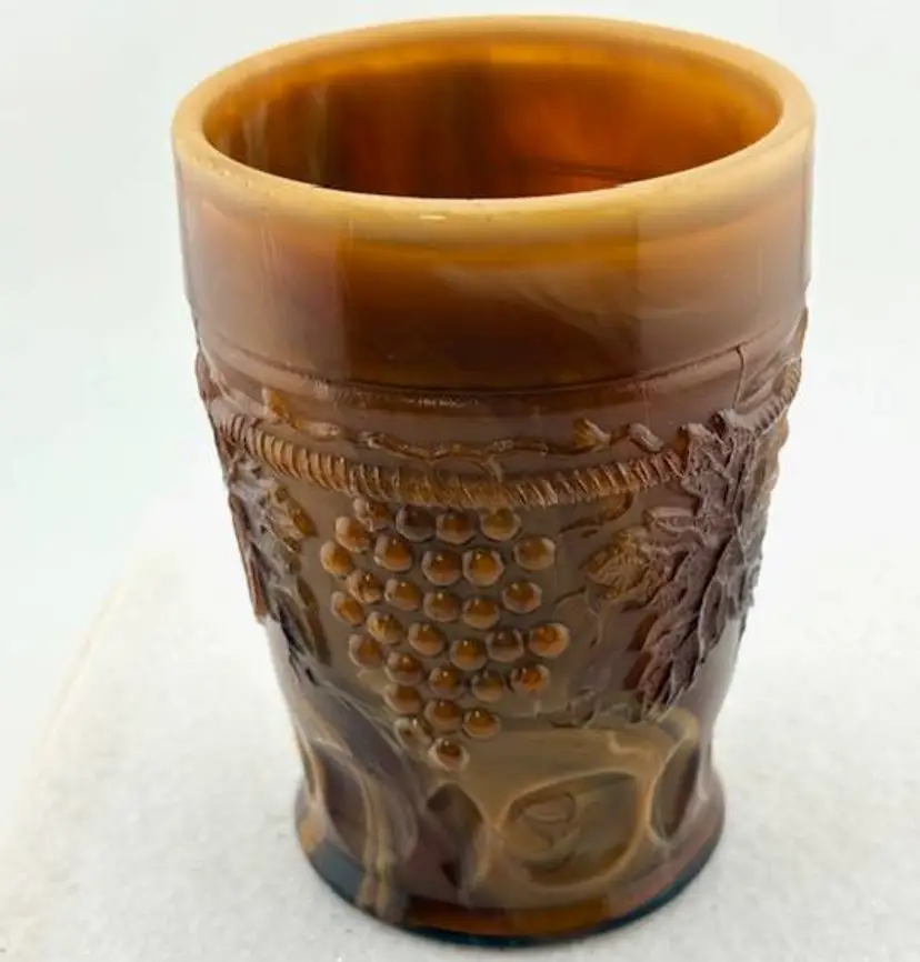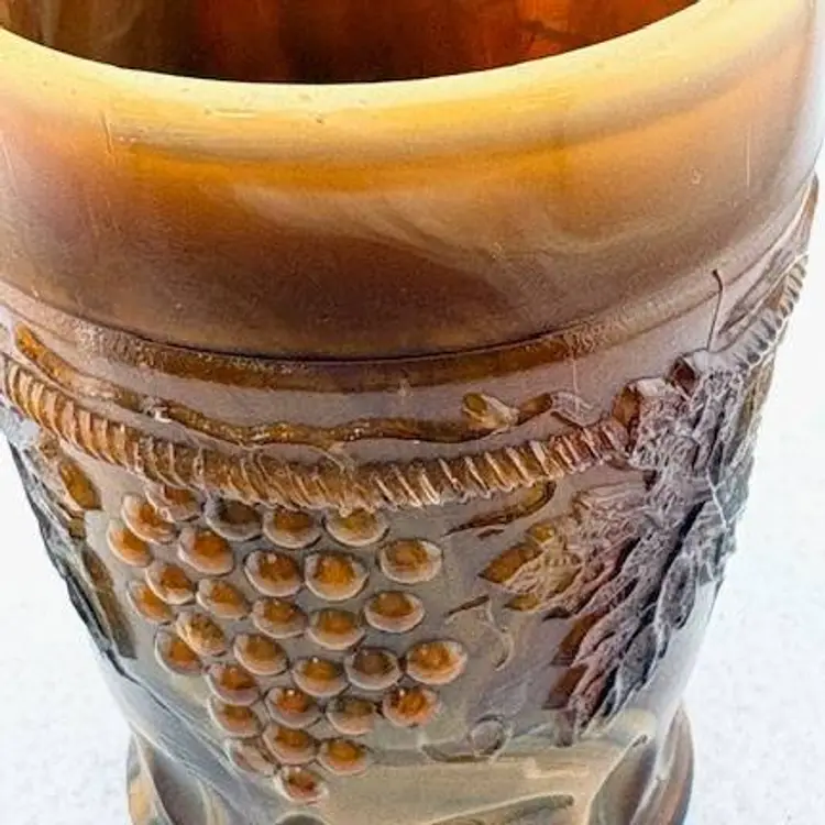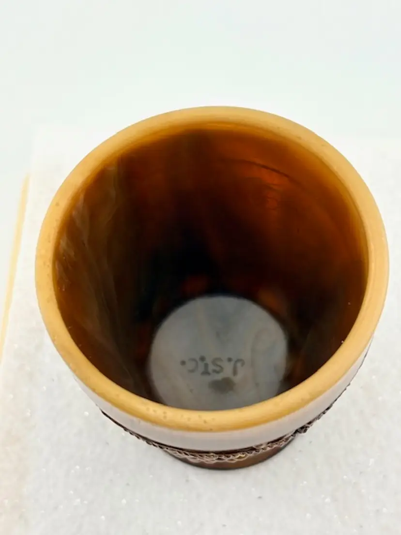 This is an amazing piece of chocolate slag glass made by Joe St. Clair. Look at the base with the stripes going across and in each stripe, it looks look a blue hue. On the inside are the initials of Joe St. Clair. It is in great condition with no chips or cracks. It measures 4" tall x 2.75" across at the rim.